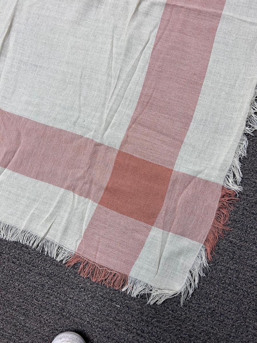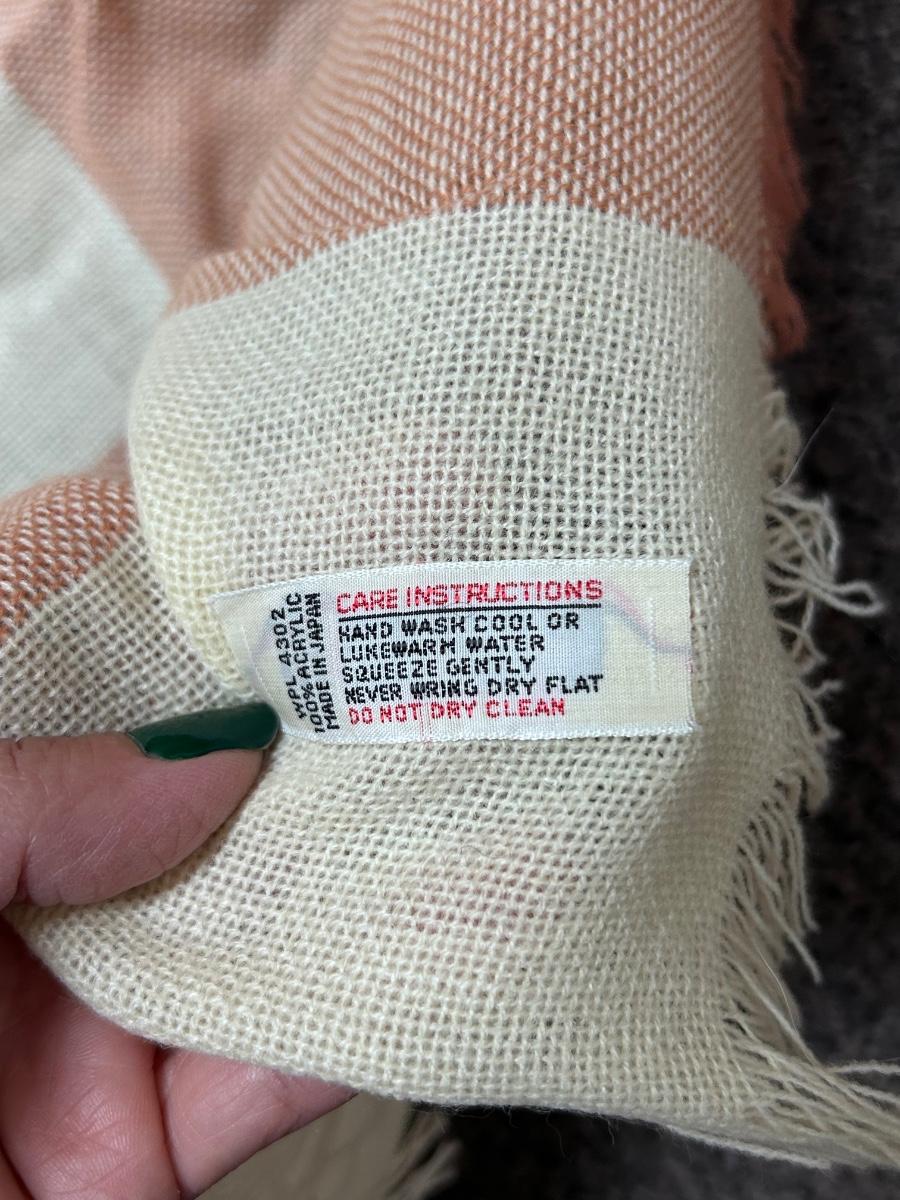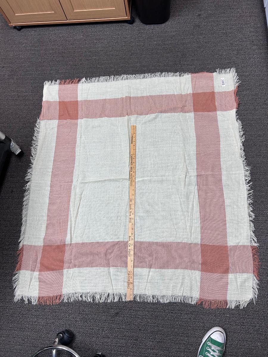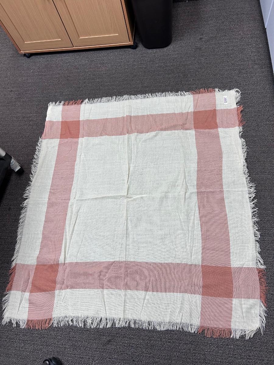 Fringed Edge White and Coral Acrylic Tablecloth Picnic Blanket. About 4'x4' size. In good condition, no spots or stains.