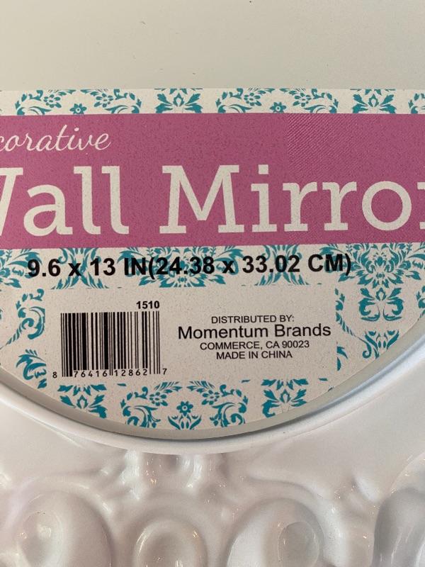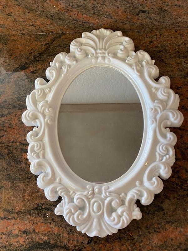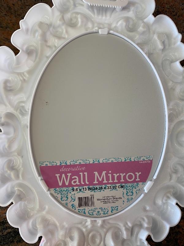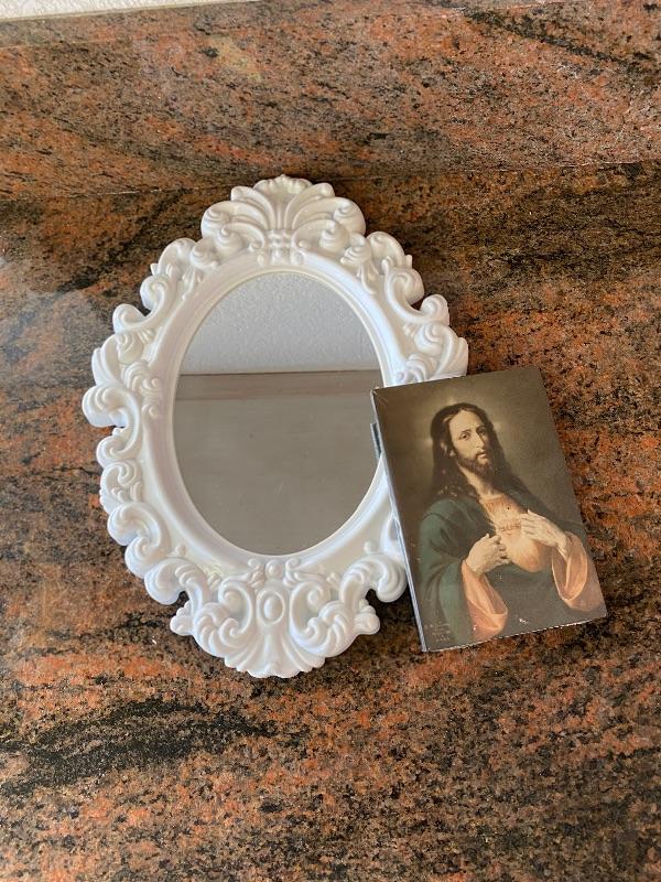 Small white plastic framed wall mirror and a piece of religious art. Frame is ornate looking but very thin plastic, could probably paint. Art has plastic on it still