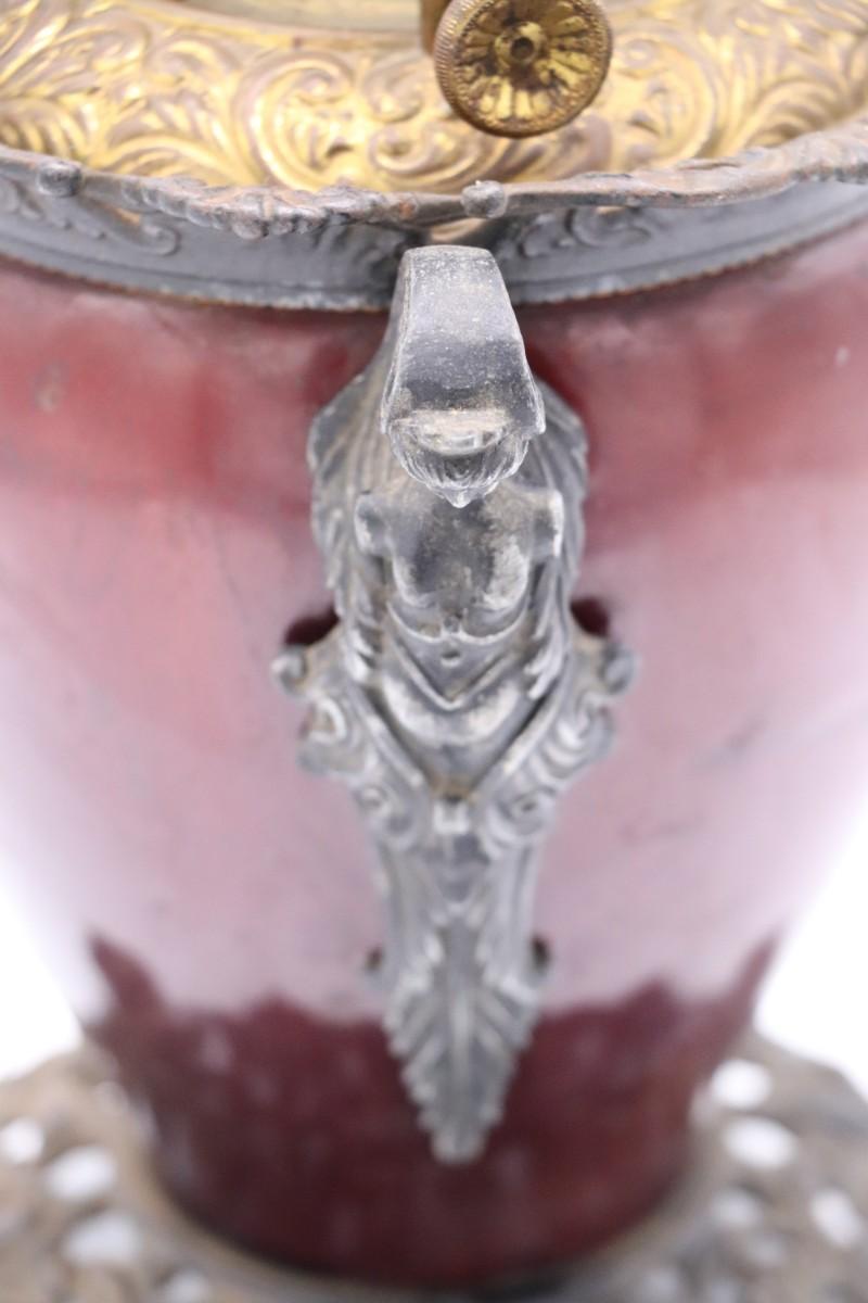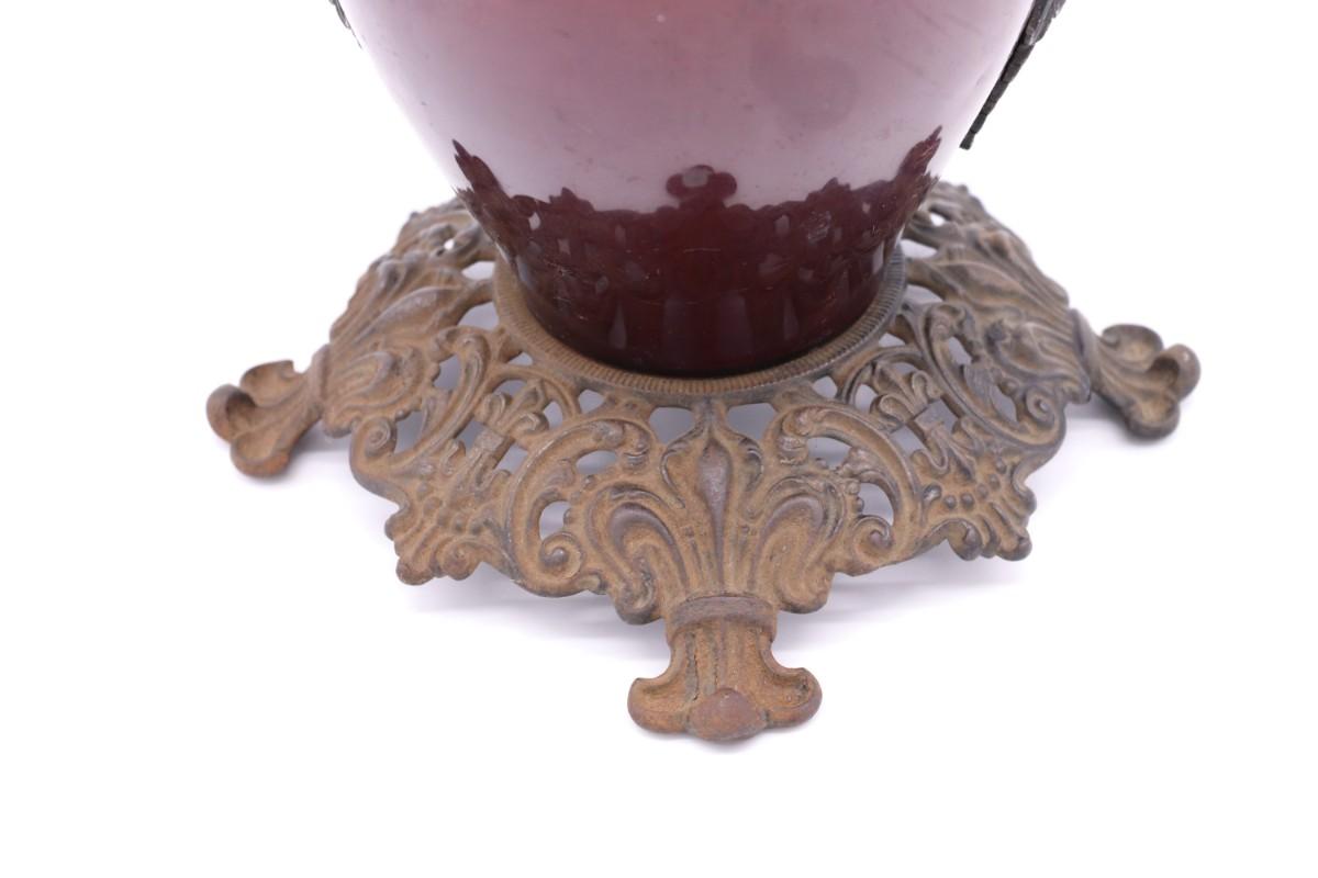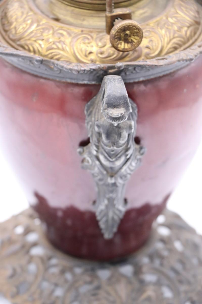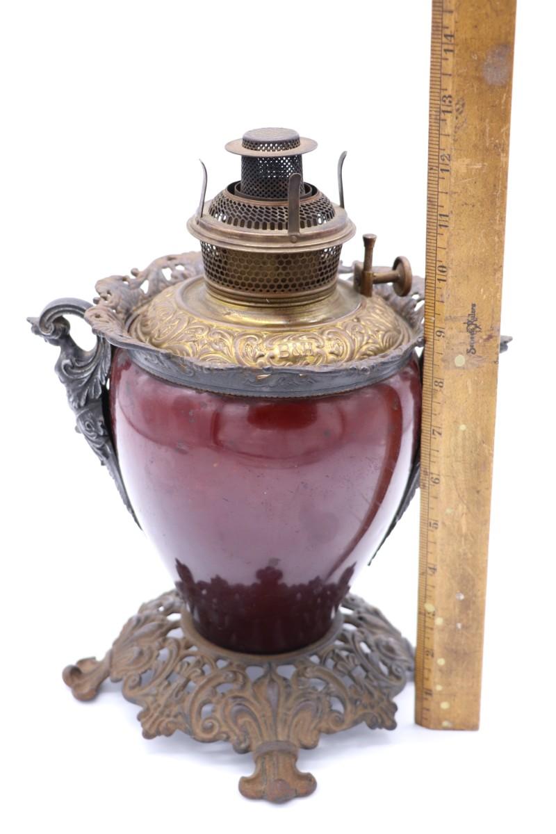 Gorgeous antique kerosene lamp with gorgeous deep red center, art nouveau metal details, and fantastic handles of women statues (like statues on the front of a ship). Kerosene lamp burner marked B&H (Bradley and Hubbard). Base stamped B&H and numbered 8324. From the estate of an antique store owner and lamp enthusiast. Condition as shown.