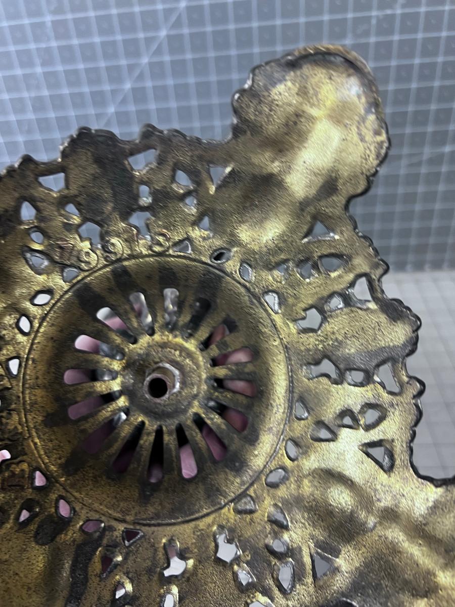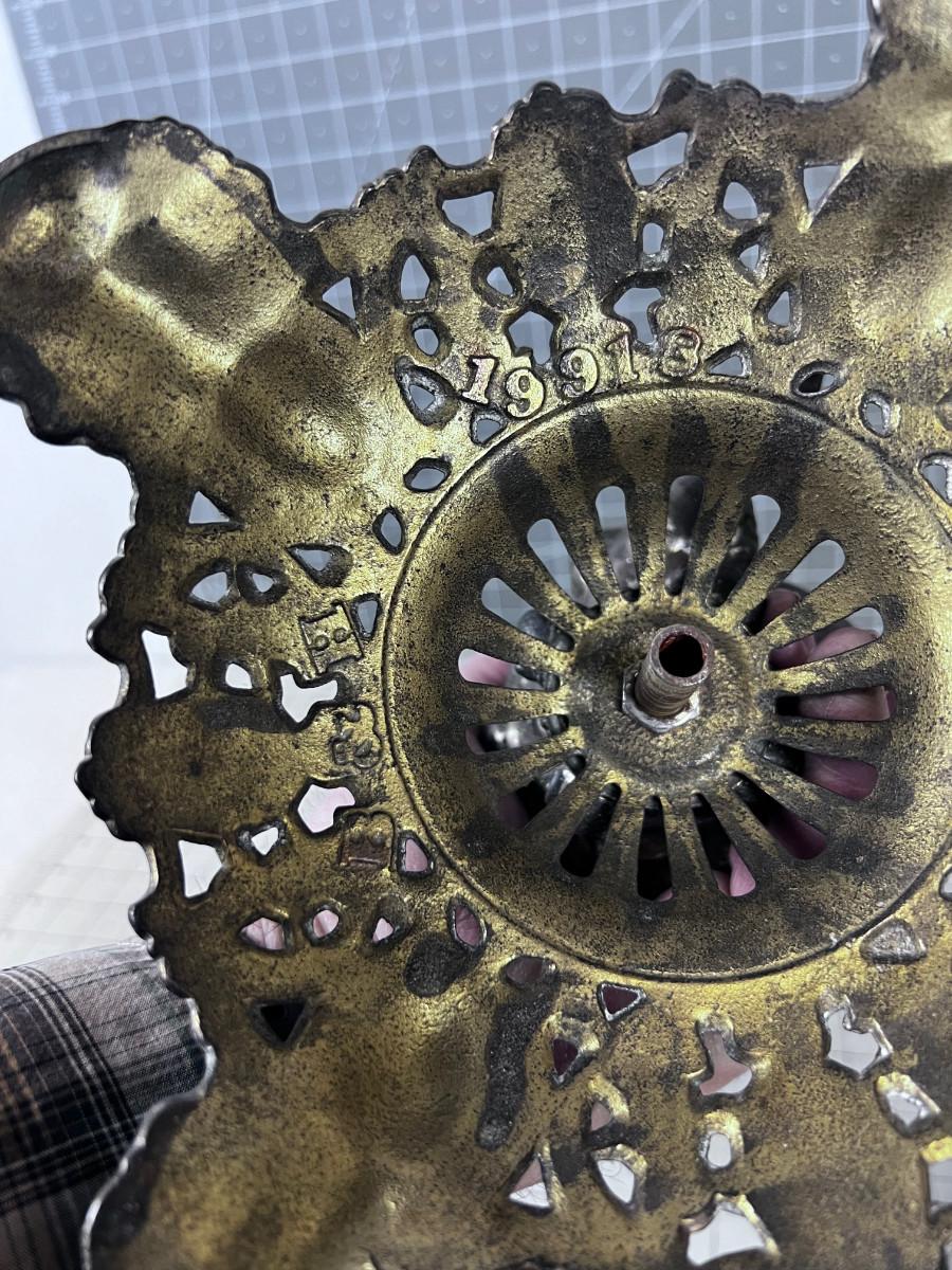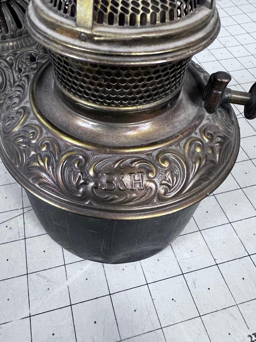 Burner appears complete and usable, Brass with a hand welded oil tank cast metal filigree base. 20" tall a beautiful piece of history!!!
