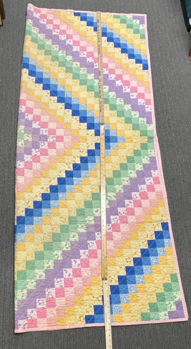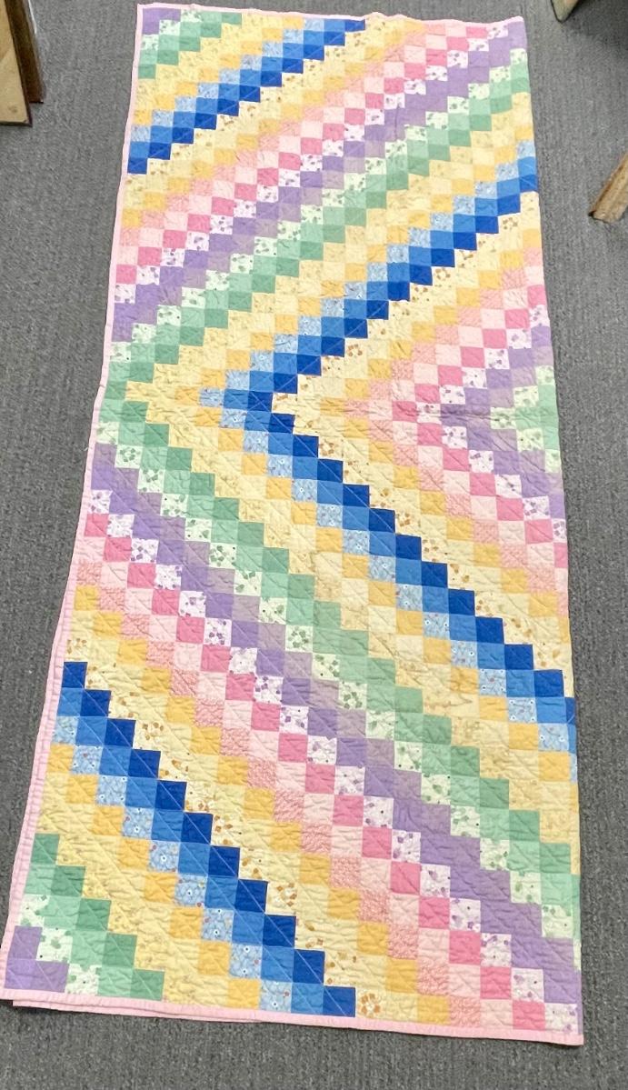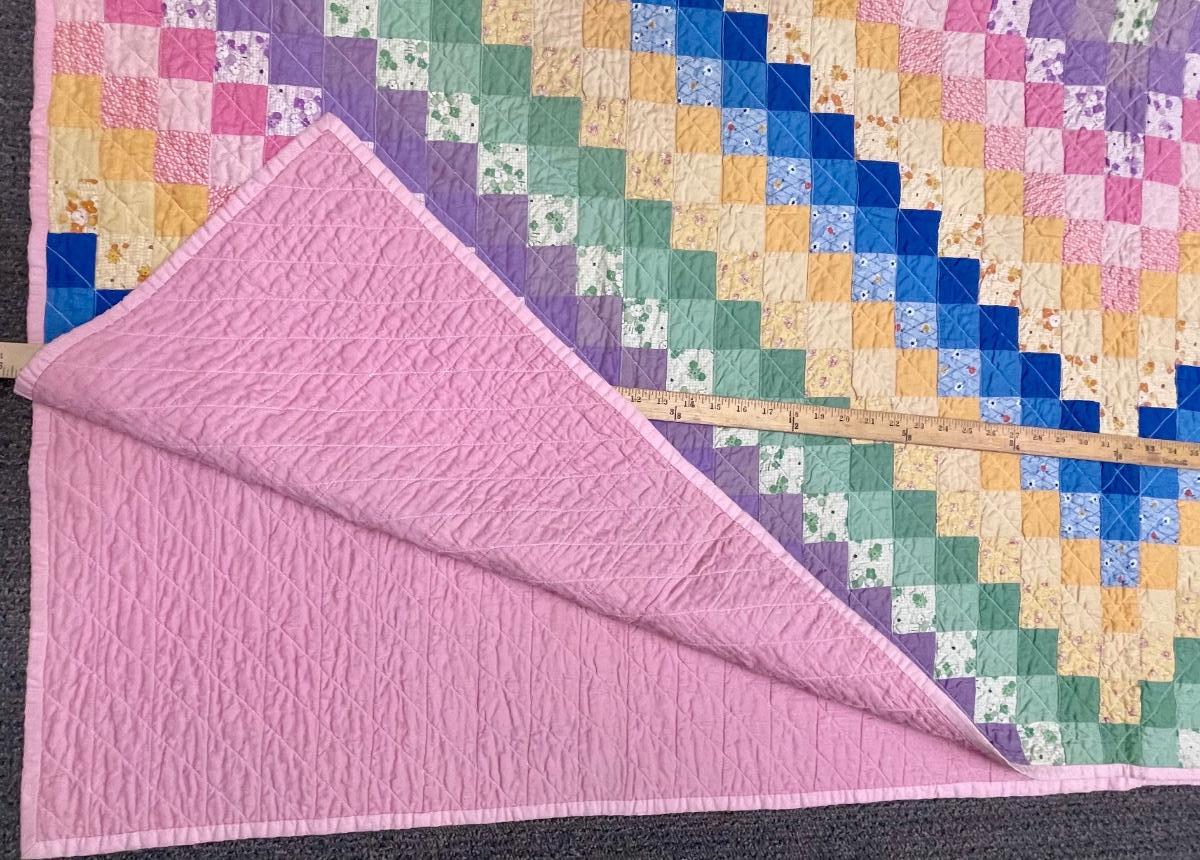 Very Large Multi-colored Hand-made Quilt Prairie Pointed Edge Solid Pink on back 82 X 70 inches