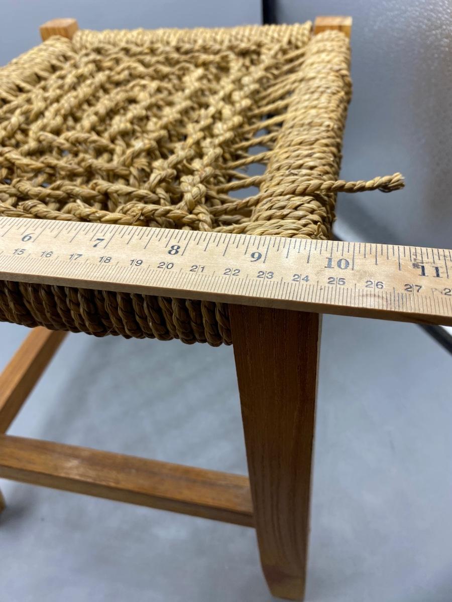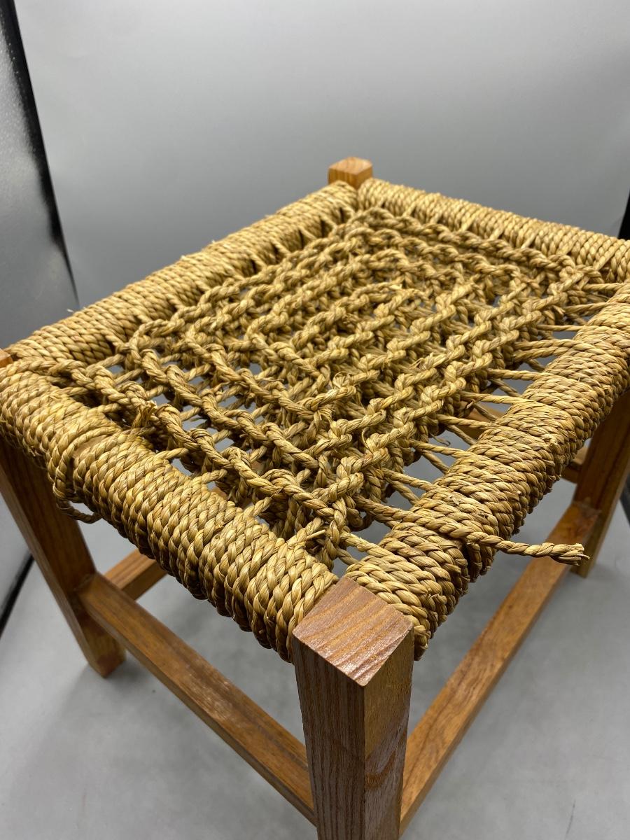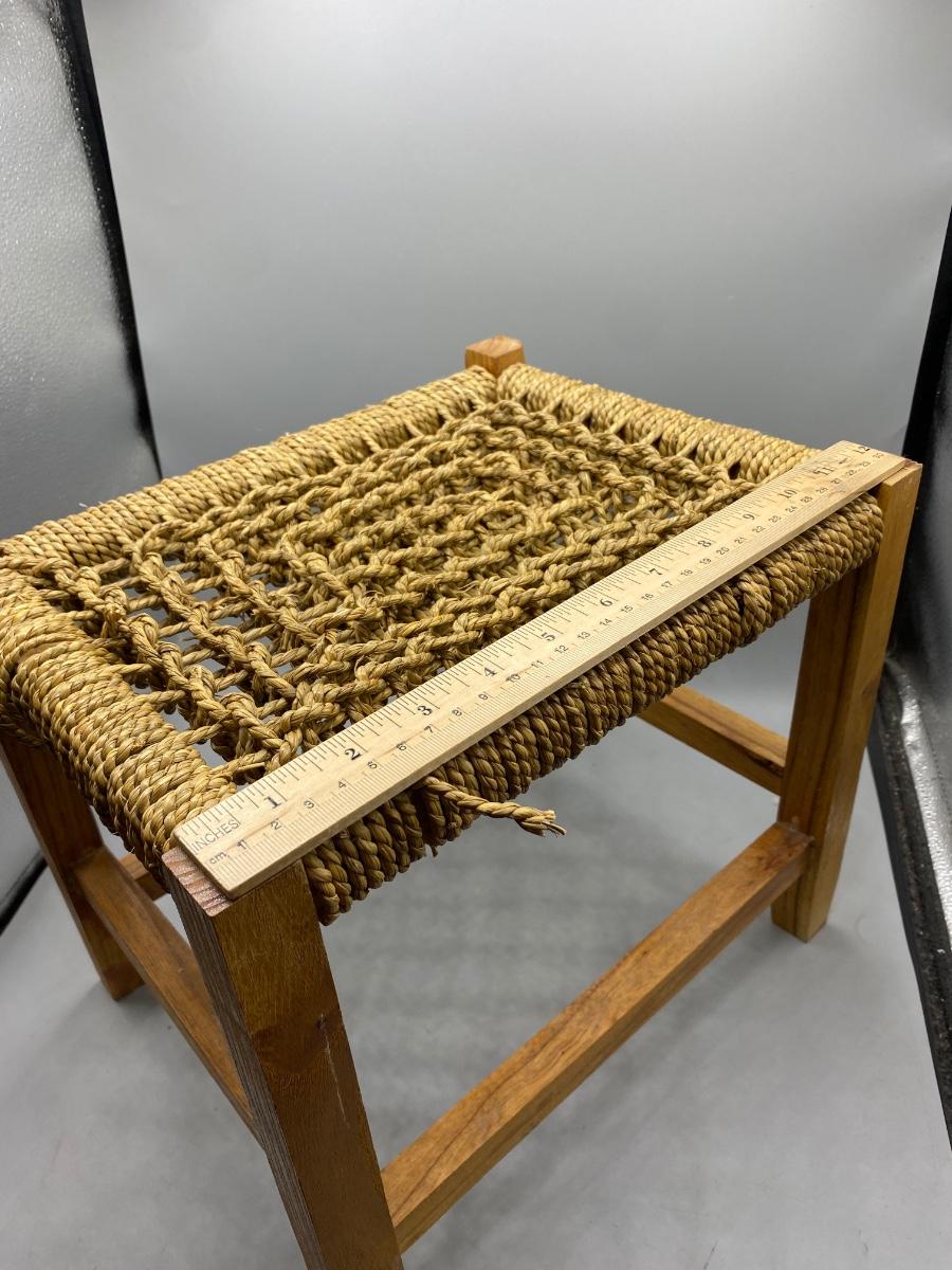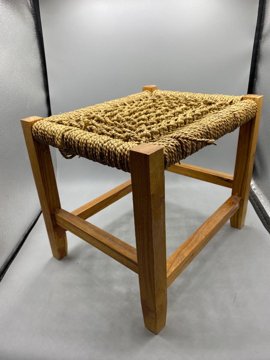 Small Wood & Natural Fiber Rope Twine Foot Stool Plant Stand. In good previously used condition. About 10x12 surface and 11" tall. Great for a plant stand.