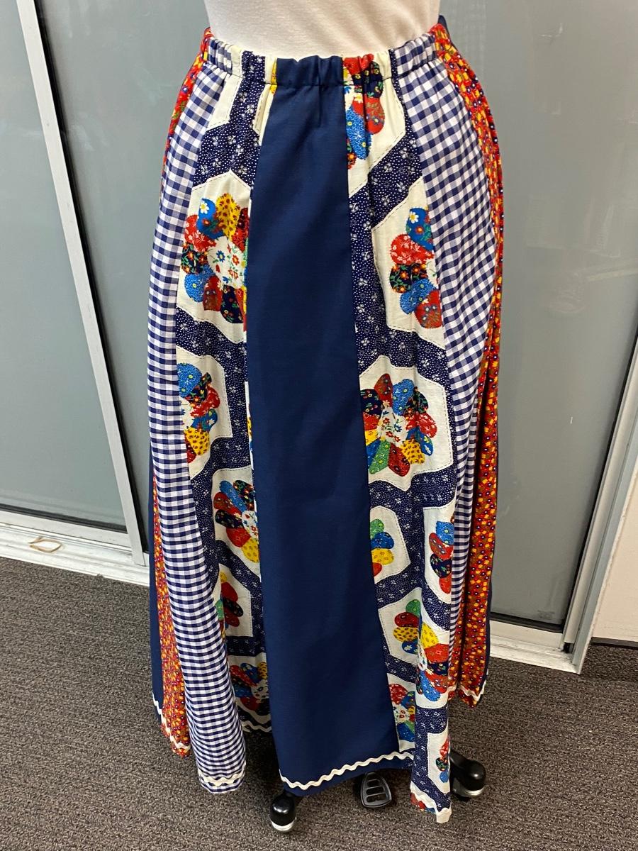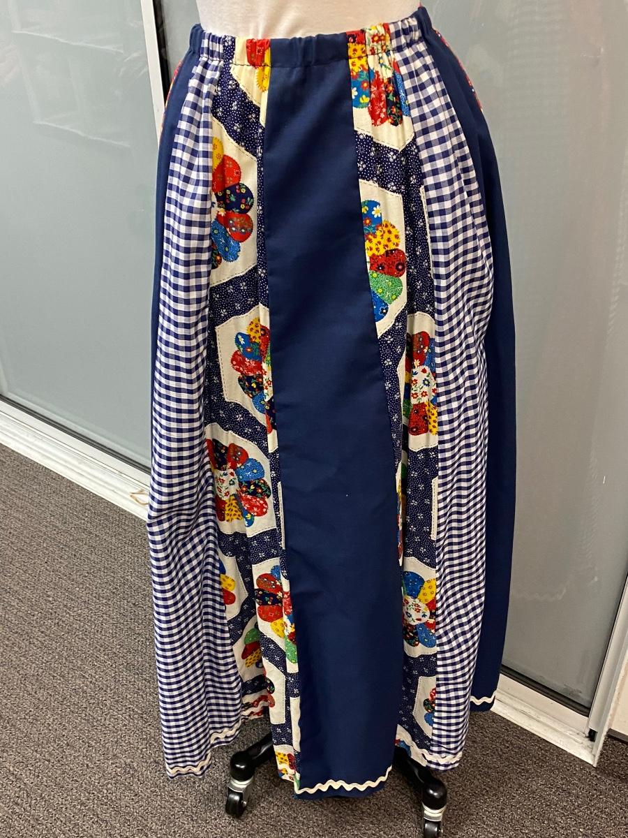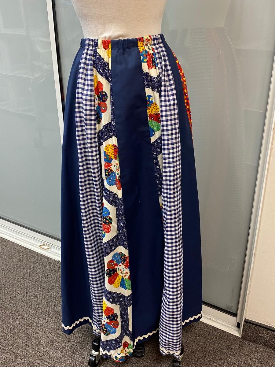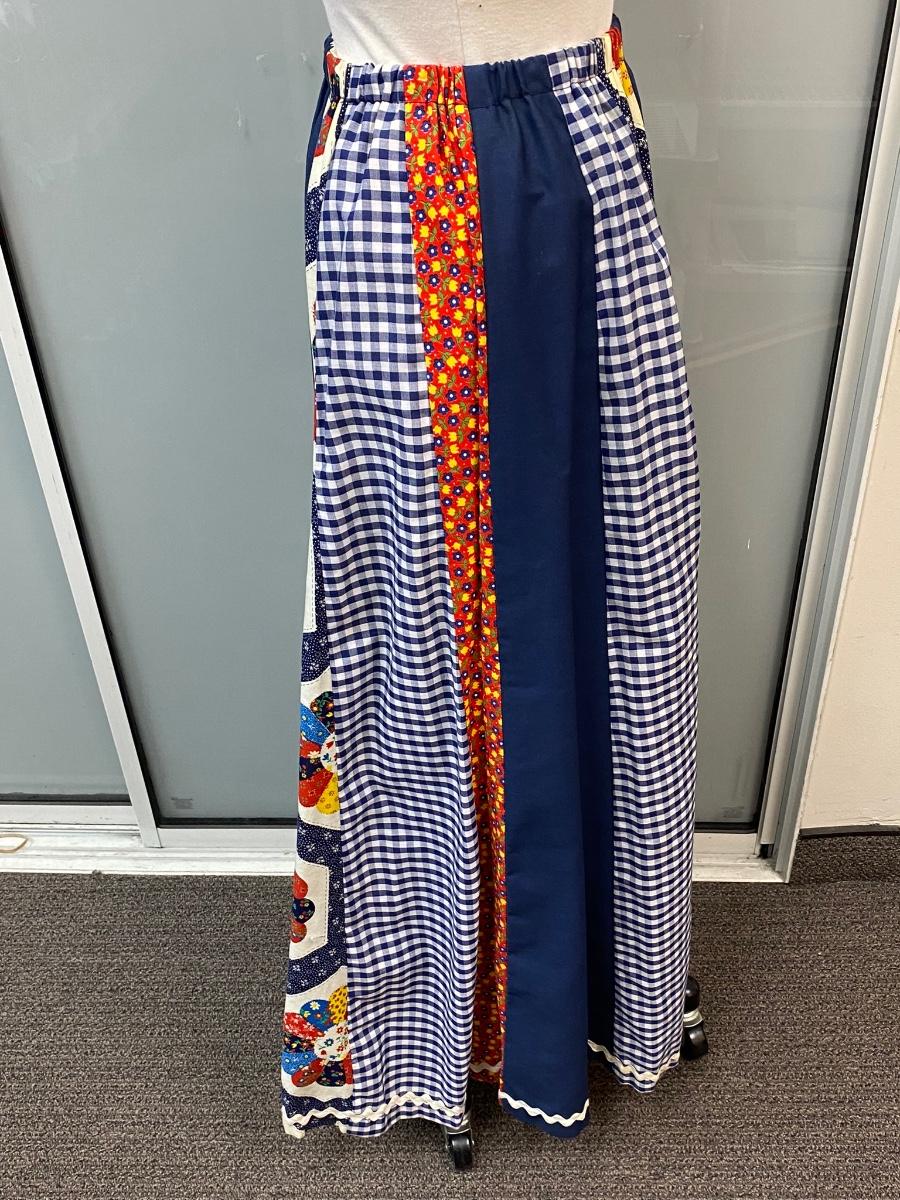 Vintage Striped Patchwork Maxi Skirt Elastic Waist with Tie Belt. In good condition. No size tags. Elastic waist measures about 12" unstretched. There is a long tie belt/sash, not shown found after pictures were taken, that is blue checkered like skirt.