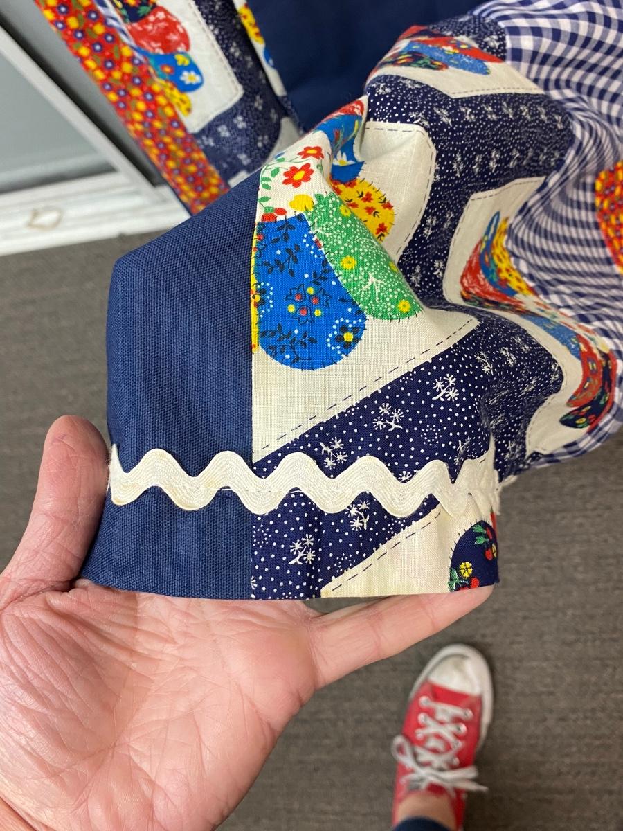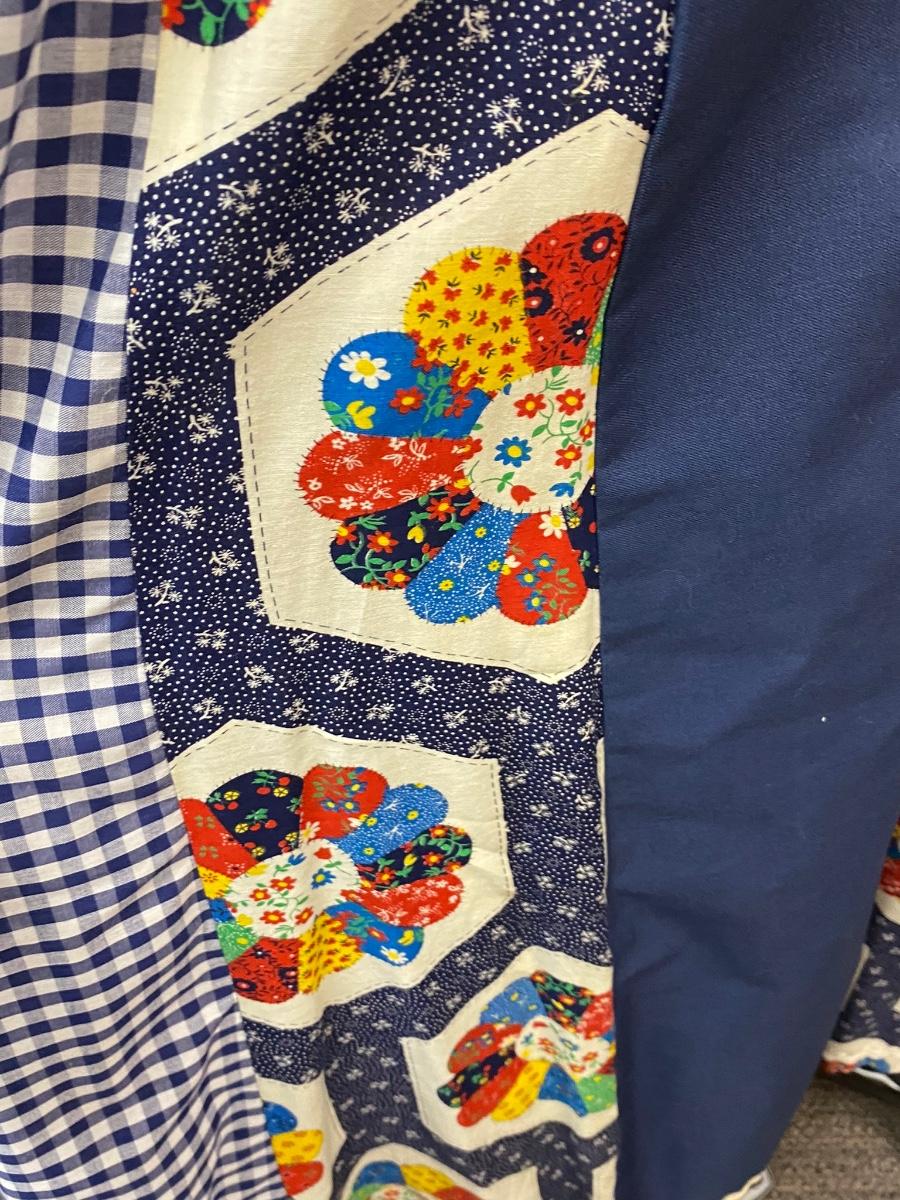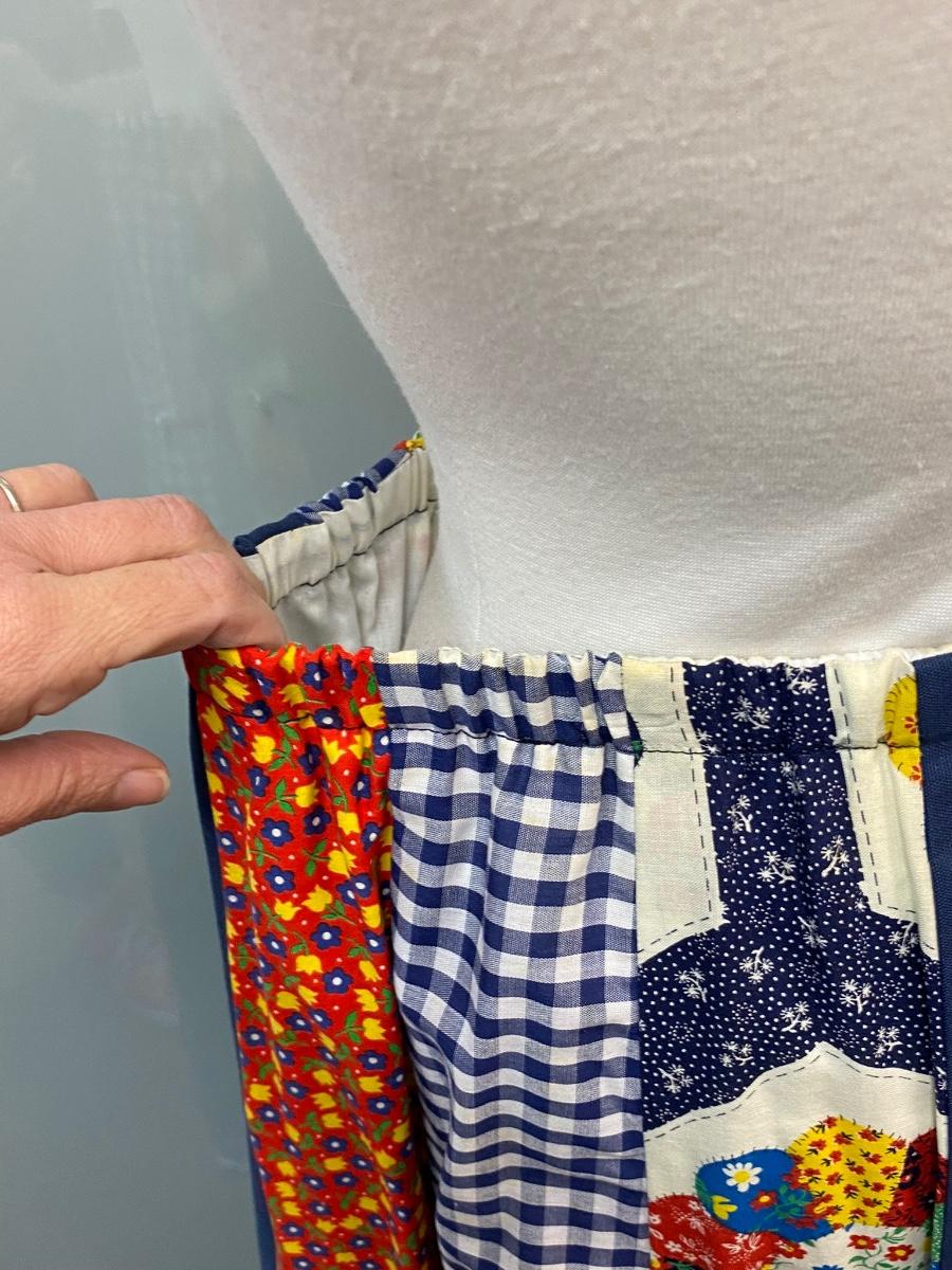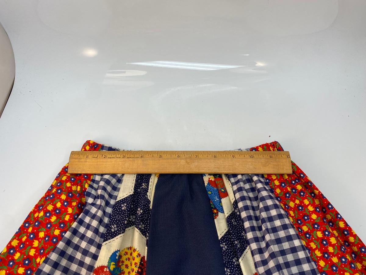 Vintage Striped Patchwork Maxi Skirt Elastic Waist with Tie Belt. In good condition. No size tags. Elastic waist measures about 12" unstretched. There is a long tie belt/sash, not shown found after pictures were taken, that is blue checkered like skirt.