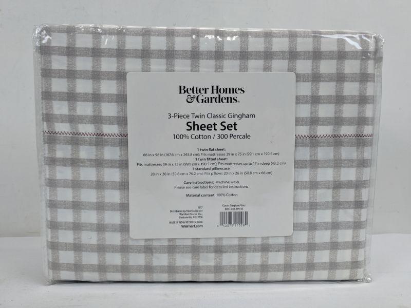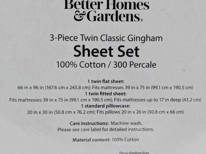 Better Homes & Gardens 3- Piece Sheet Set, Twin, Classic Gingham, 100% Cotton - New