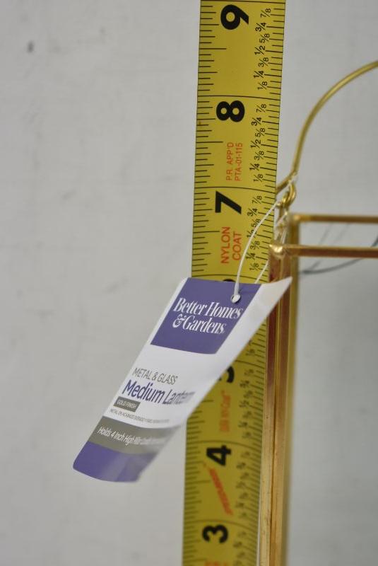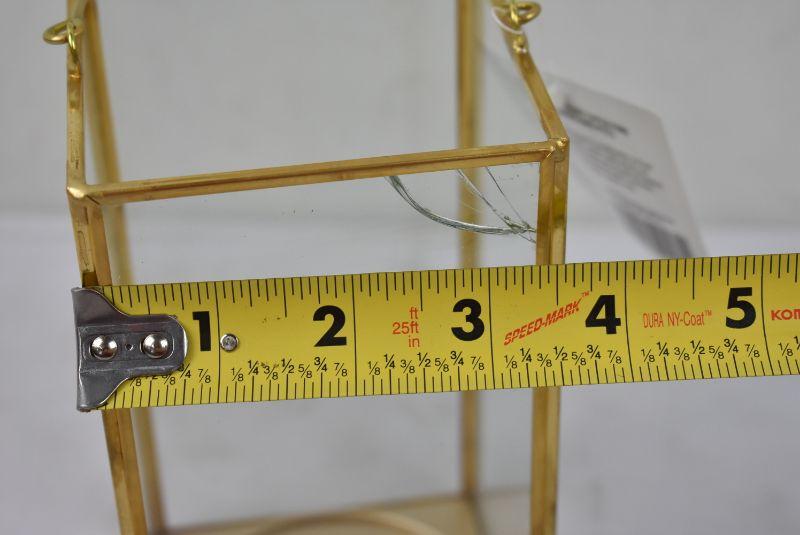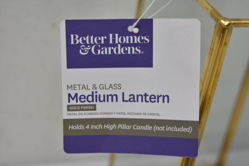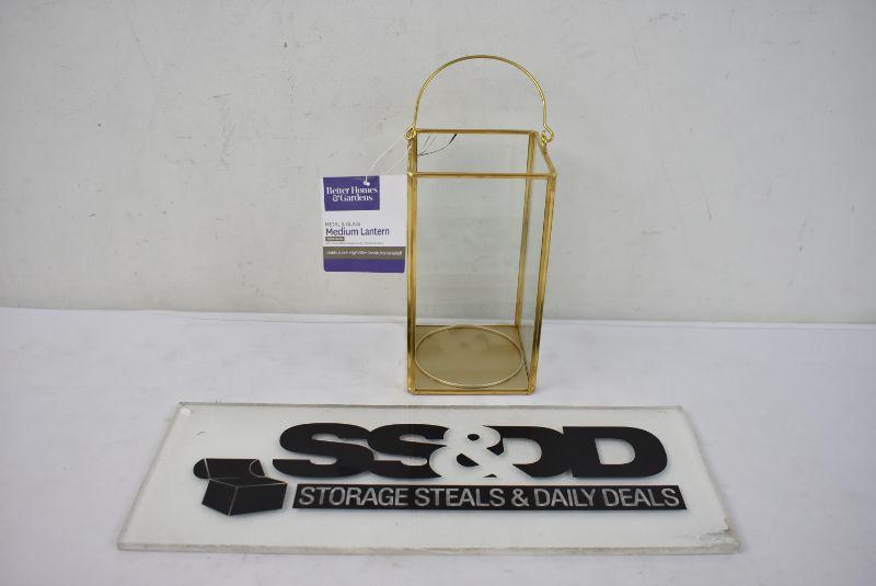 BH&G Glass and Gold Finish Medium Lantern. 1 glass panel is broken on the corner