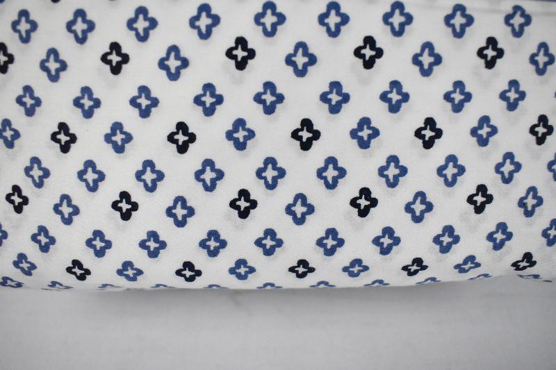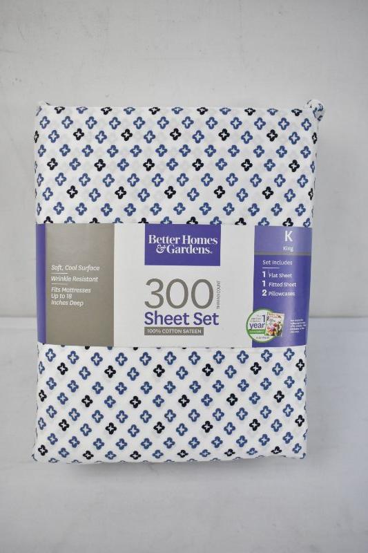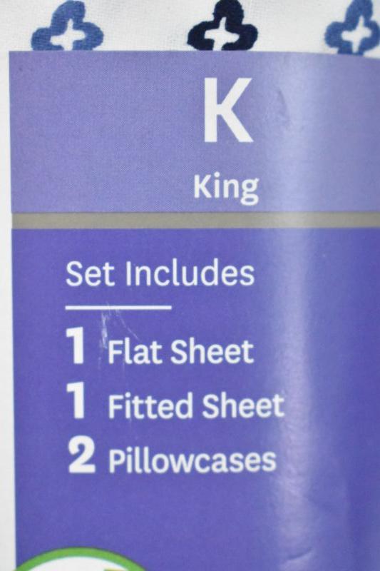 BH&G King Size Sheet Set: White With Blue & Navy Design - New