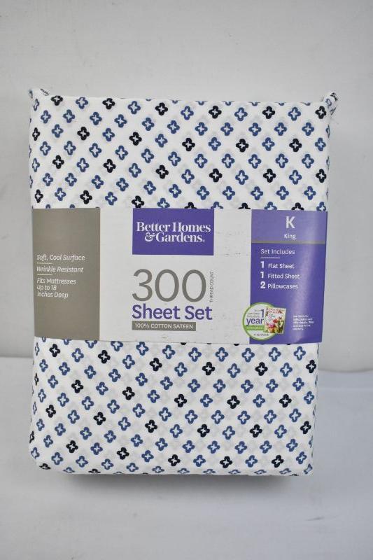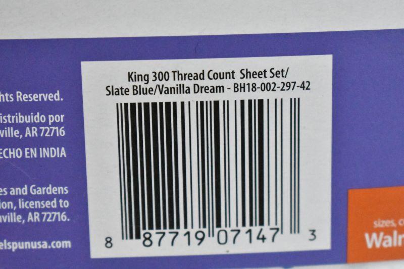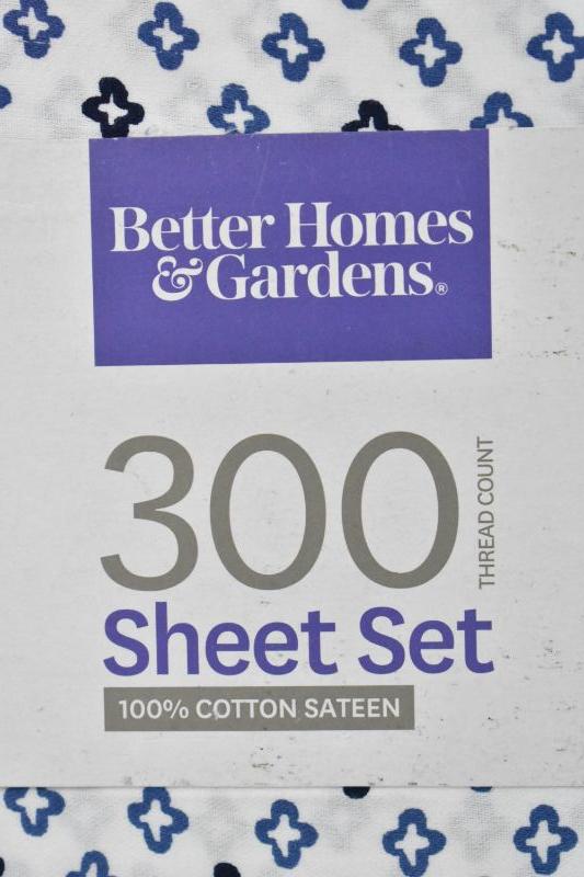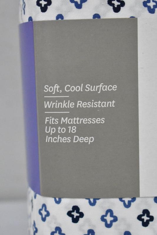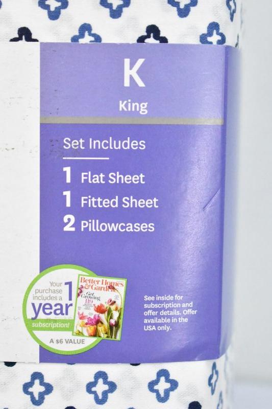 Better Homes and Gardens King Size Sheet Set, White with Blue & Dark Blue Designs - New