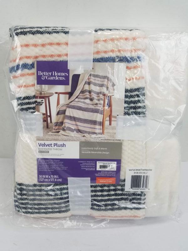 BH&G Velvet Plush Oversized Throw Multi Hickory Stripe Cream/Orange/Blue/Black 50" x 70" - New