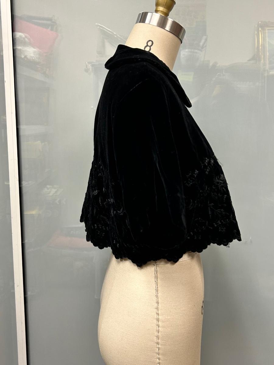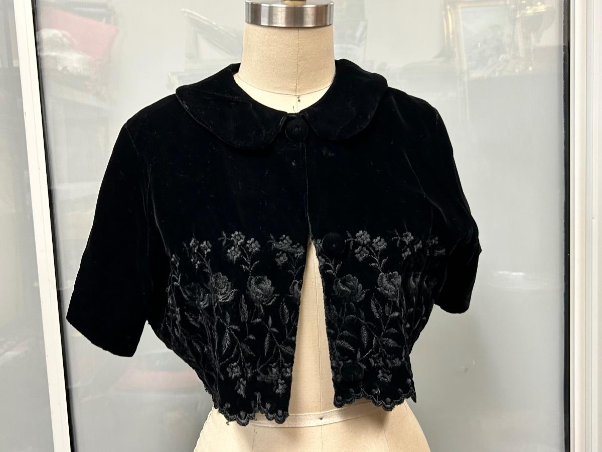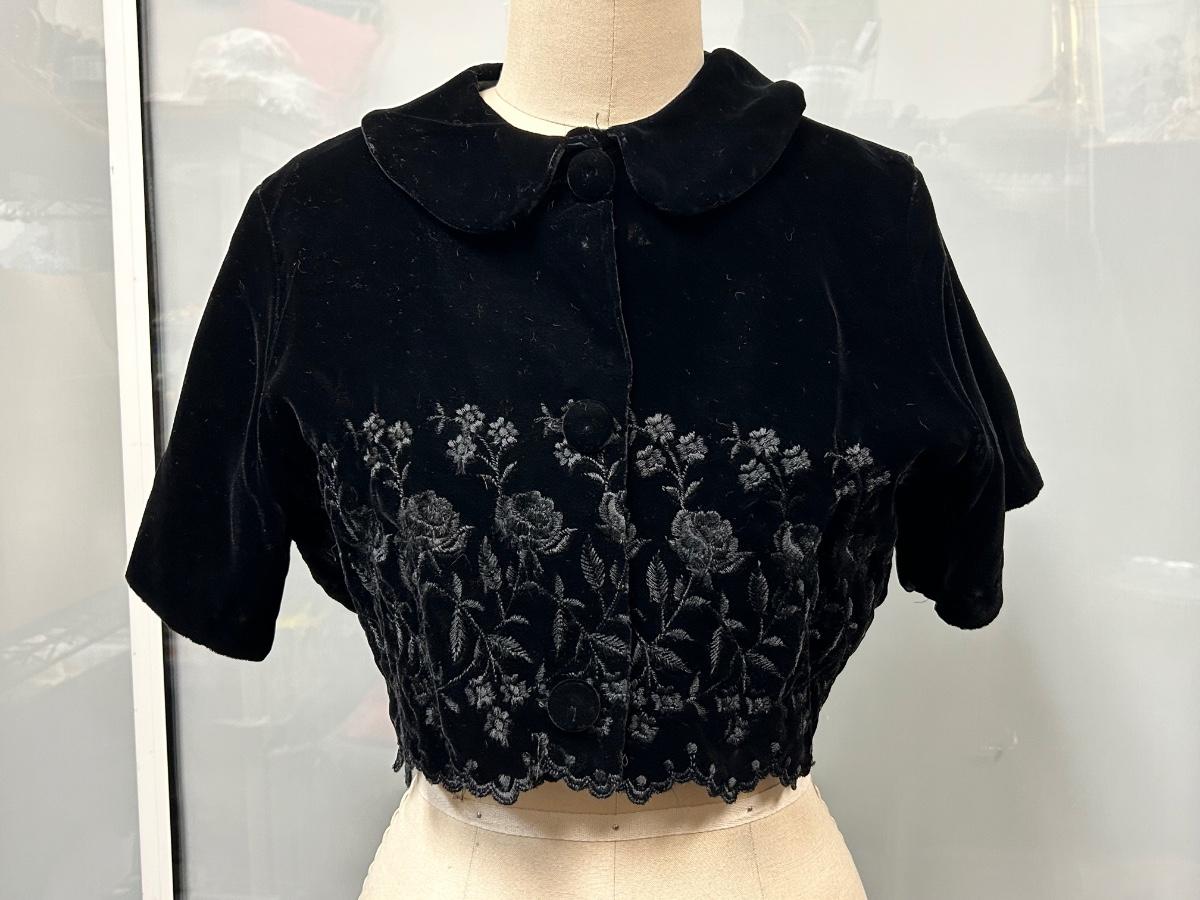 Vintage Style Black Velvet Bolero Cropped Coat with Embroidered Floral Design