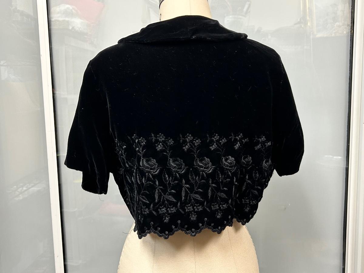 Vintage Style Black Velvet Bolero Cropped Coat with Embroidered Floral Design. In good condition, no tags, about a size medium/large.