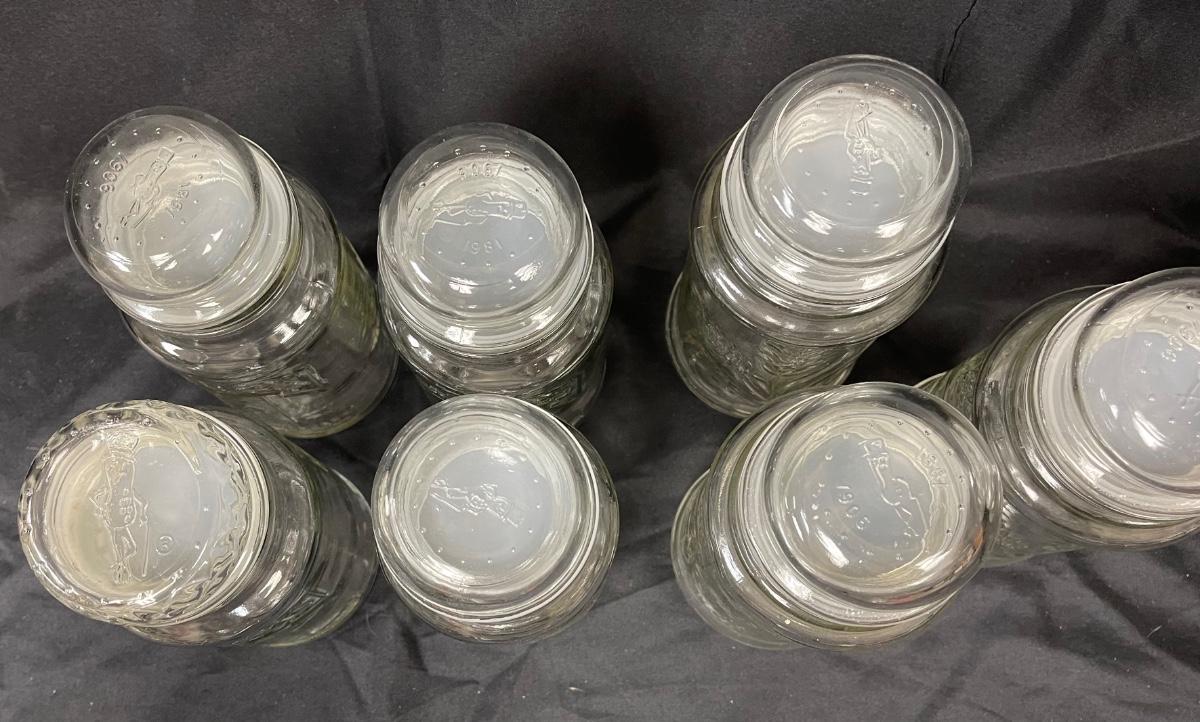 7 glass jars, advertising collectibles in good condition. Some still have glue residue that can be easily removed.