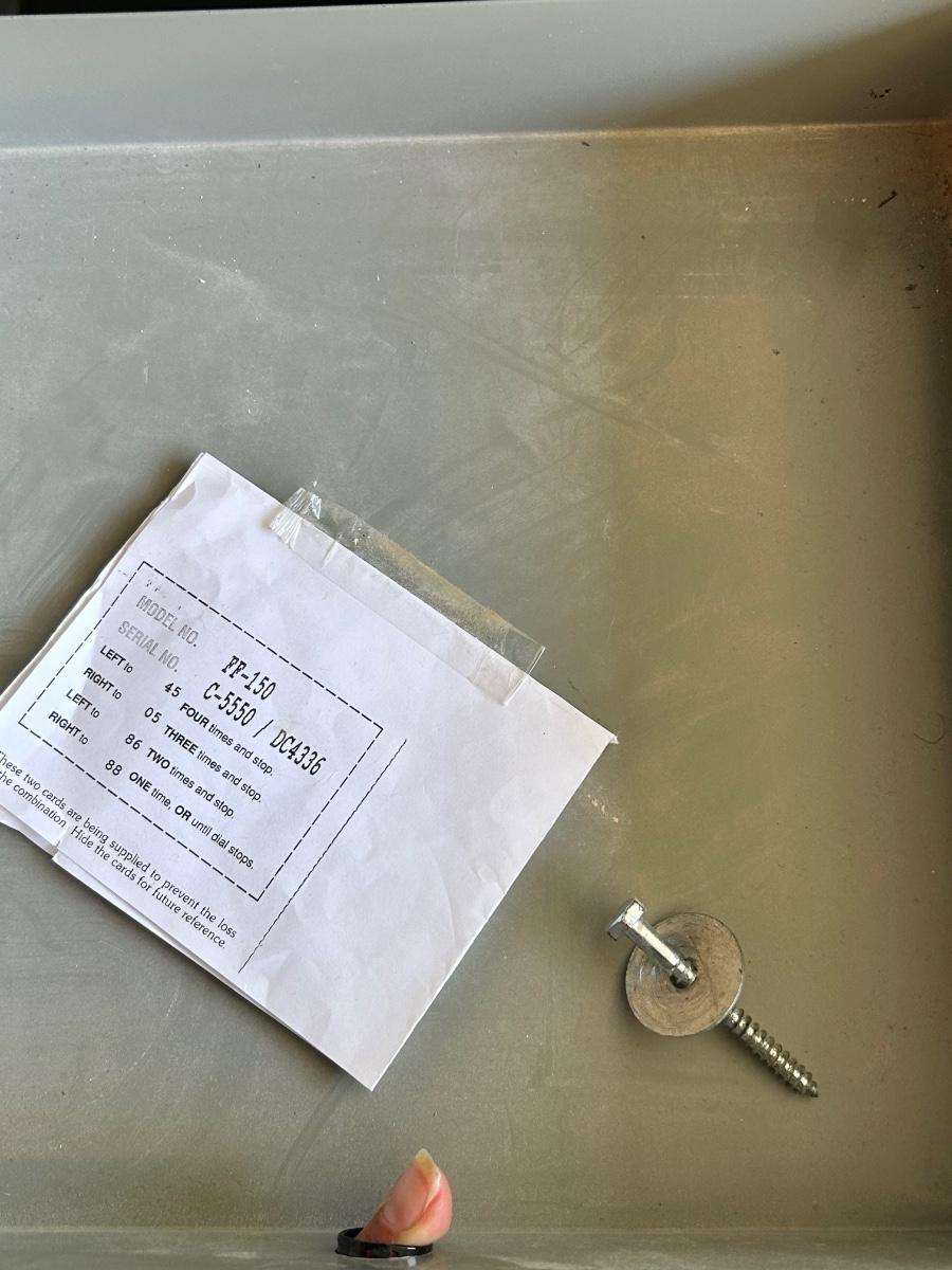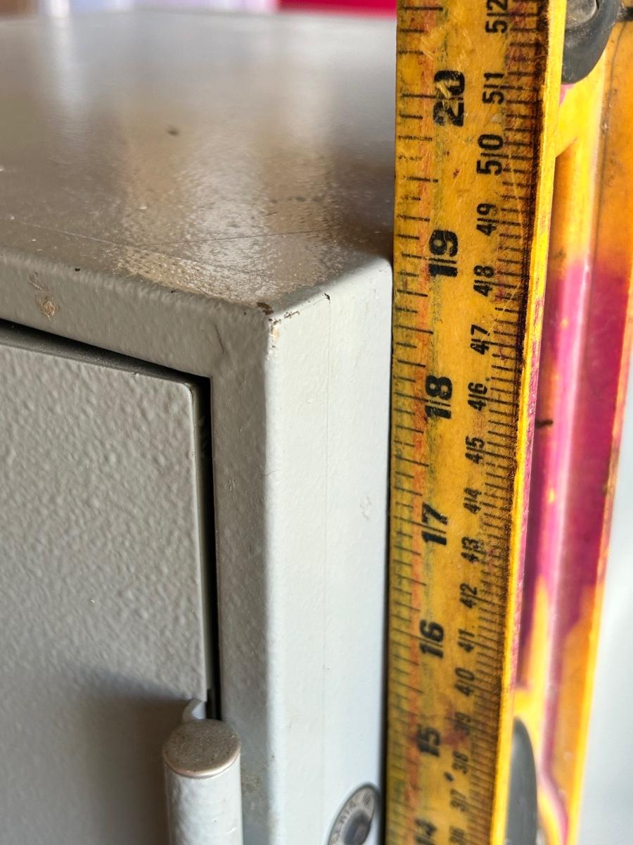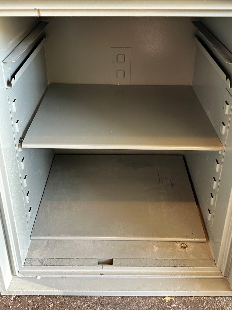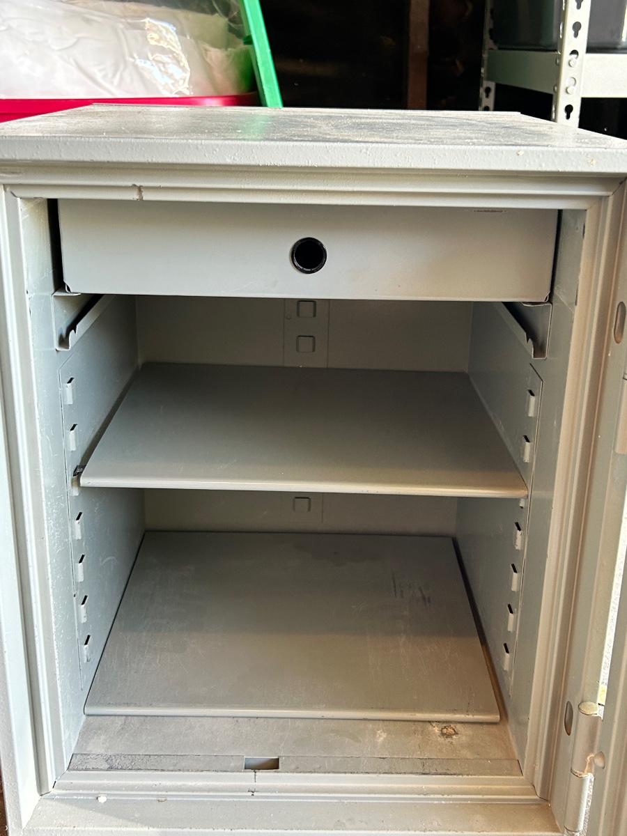 Fire Fyter Metal Combination Lock Safe. In good condition. Has combination and works. Very heavy. Has holes in bottom for bolting to floor. Adjustable shelves but missing one pair of brackets so only one shelf can be used. Has a small drawer that slides out at the top. Outside measurements 19hx18wx17d. **PICK UP REQUIRED IN GARDEN GROVE, CLOSE TO DISNEY. MUST SCHEDULE WITH JENN2**