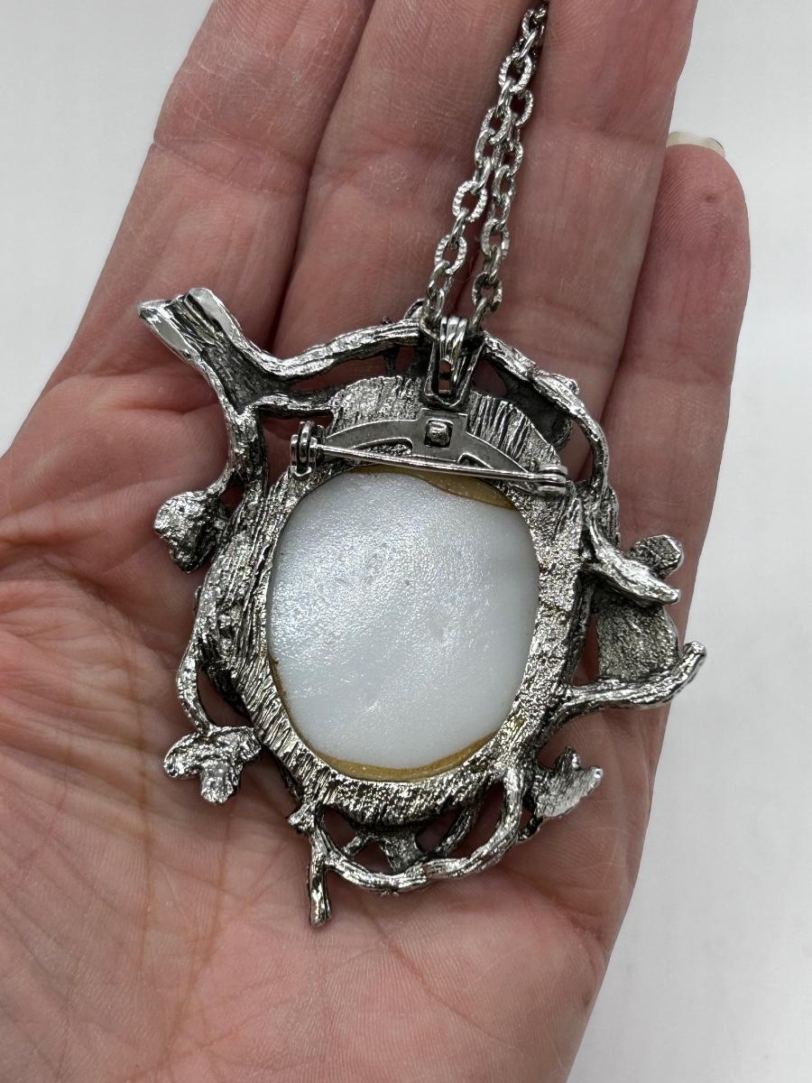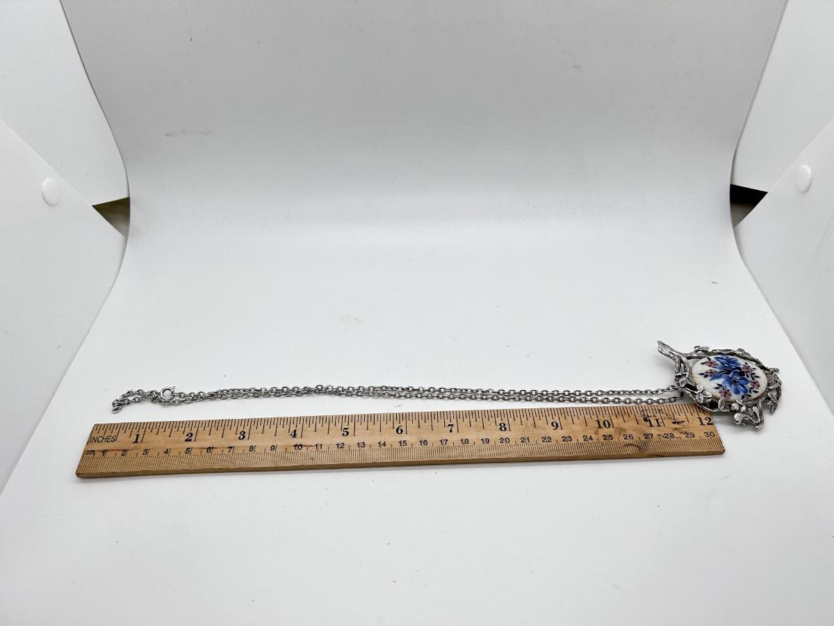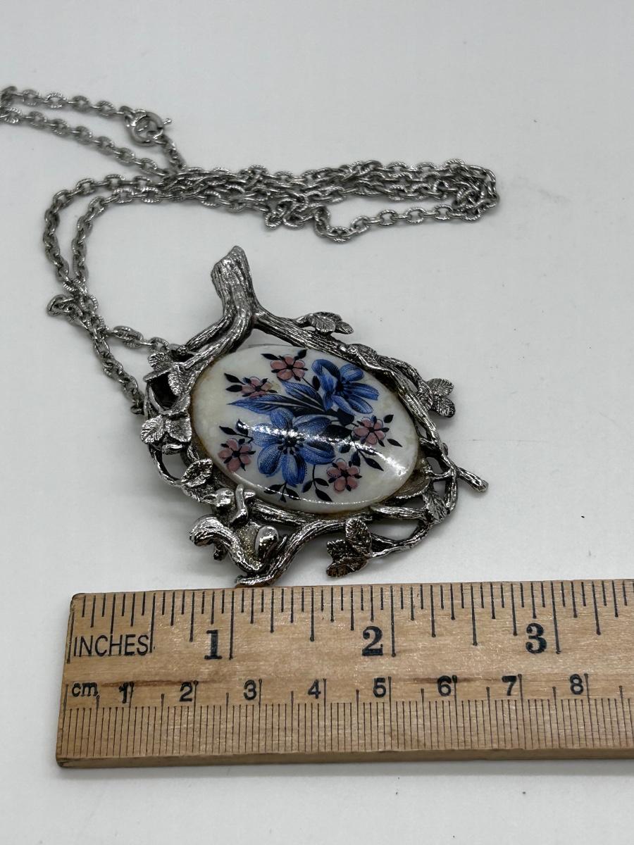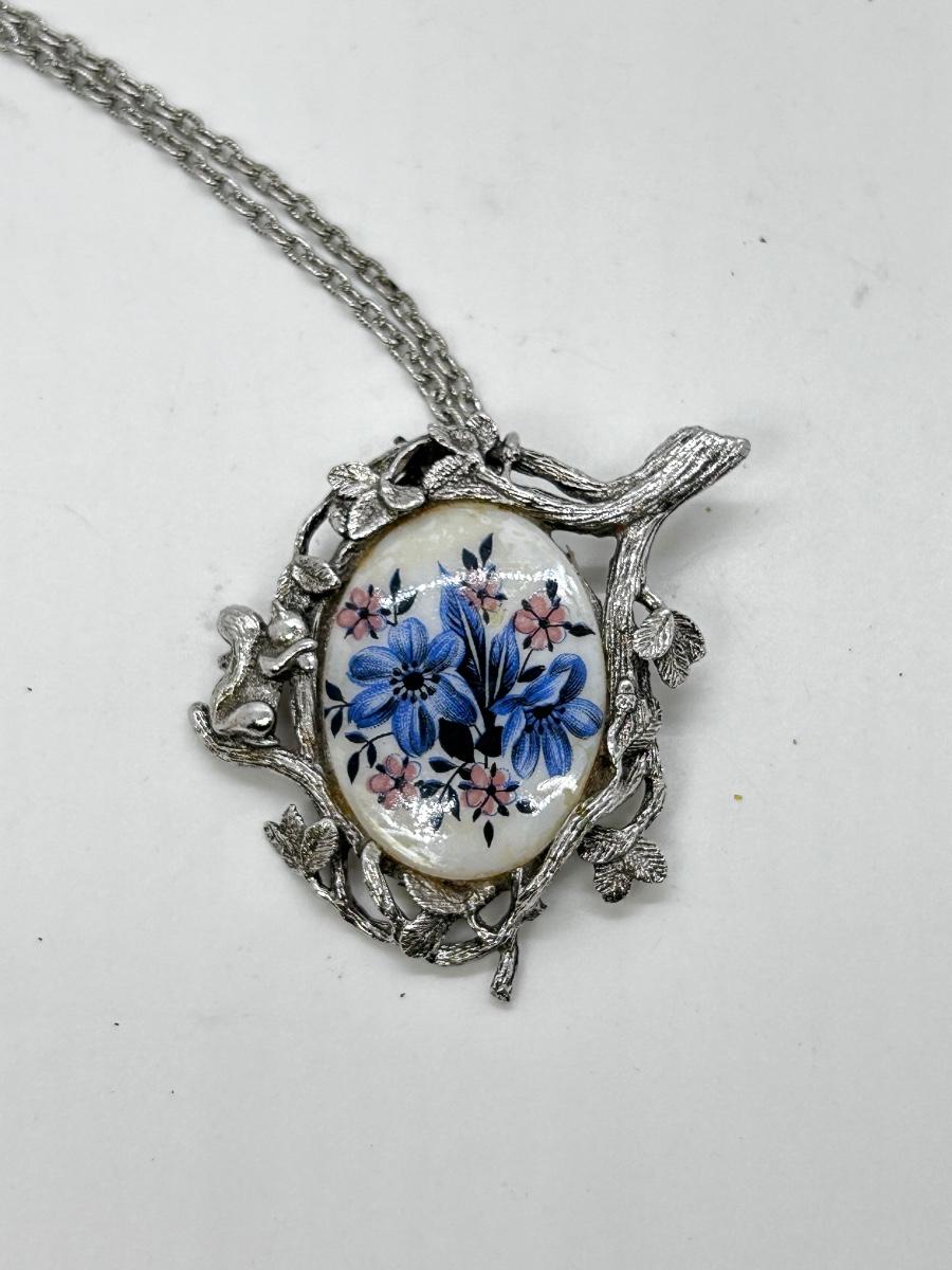 Blue Flower Painted Glass Medallion Pendant Pin Brooch with Chain. Silver tone metal setting. In good condition. Can be worn on chain or as pin.