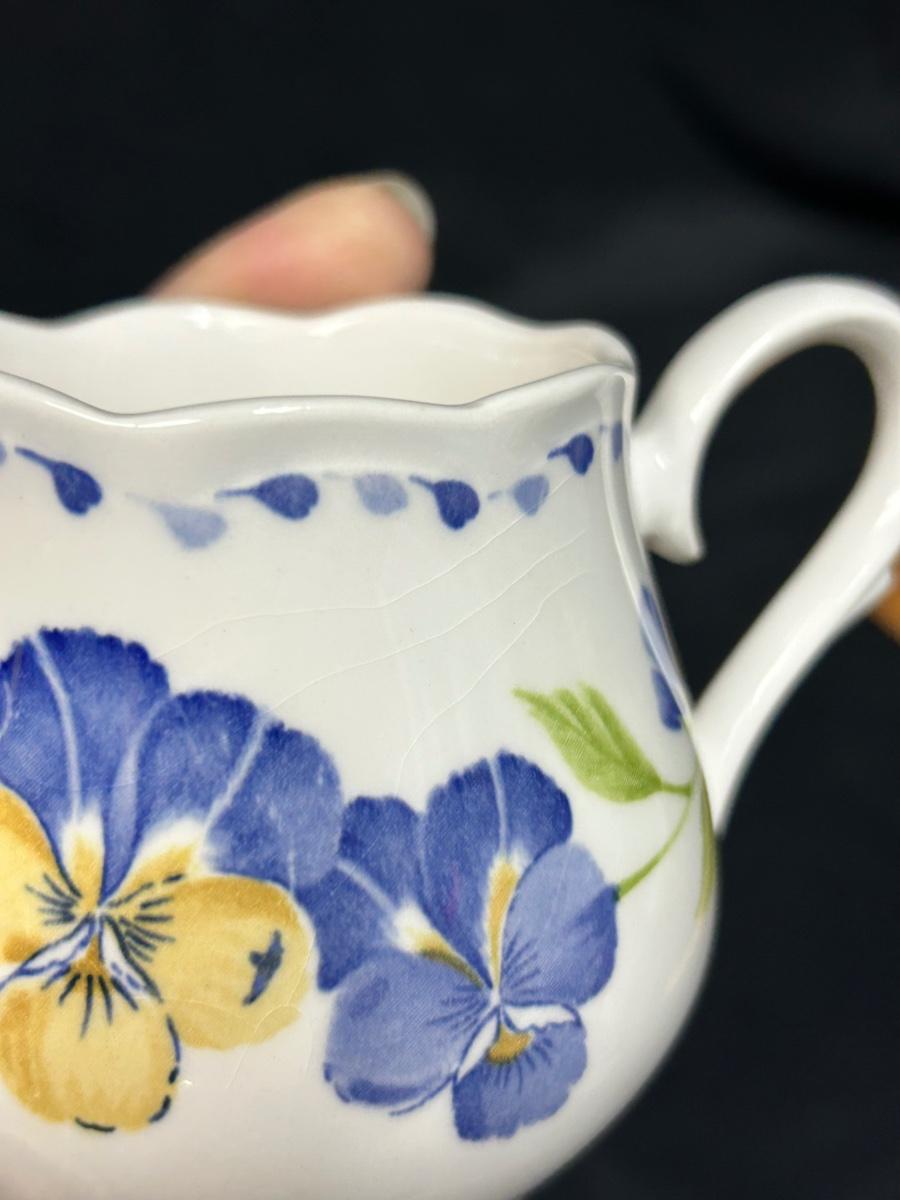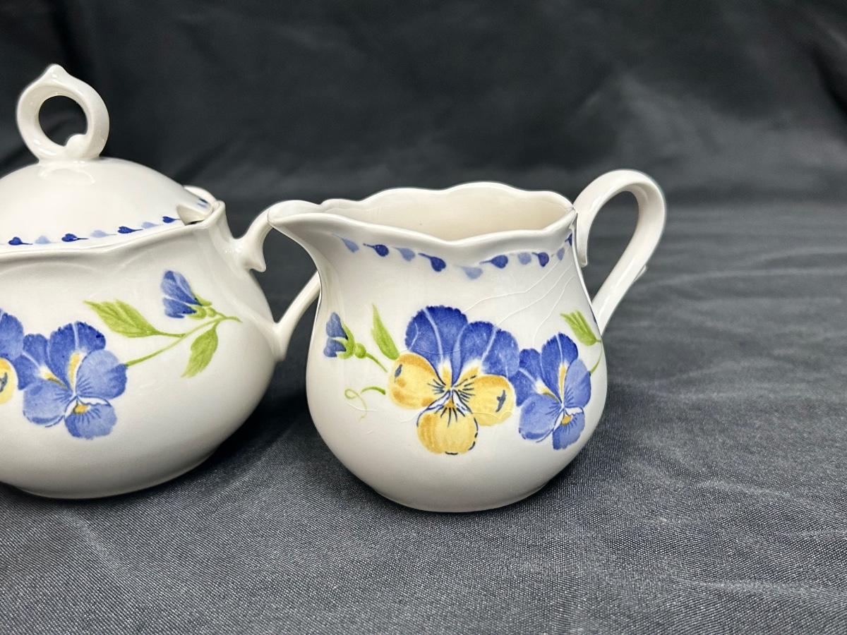 Casual Living Nikko Tableware Pansy Flower Floral Creamer and Lidded Sugar Bowl. In good used condition. Thre is crazing on the outside of pieces. Display nicely.