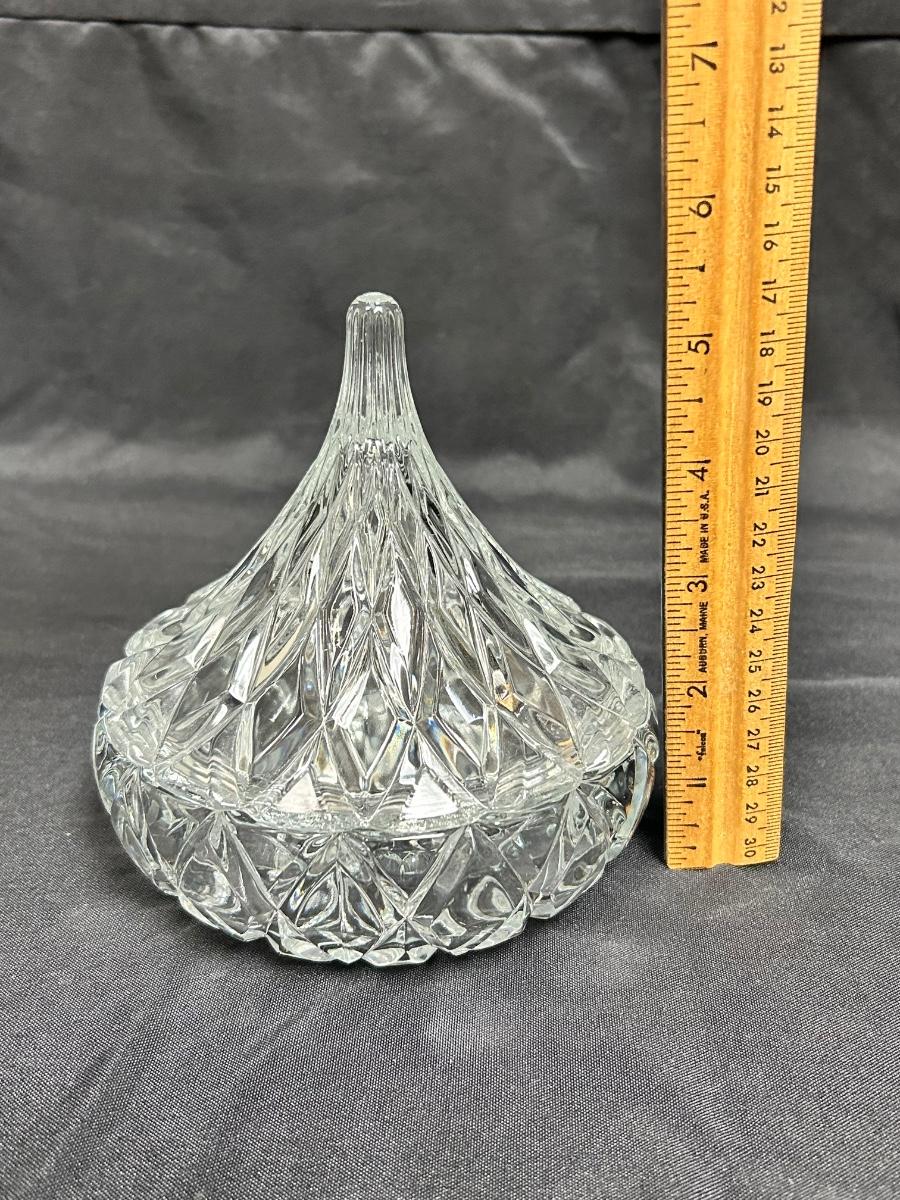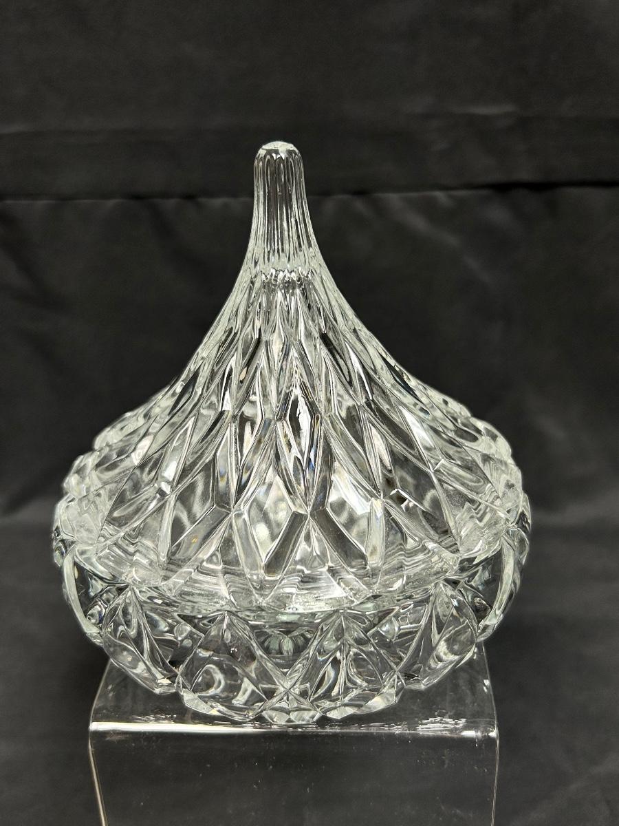 Cut Crytal Hershey Kiss Shaped Lidded Candy Dish. In good condition. Displays nicely. About 6" size.