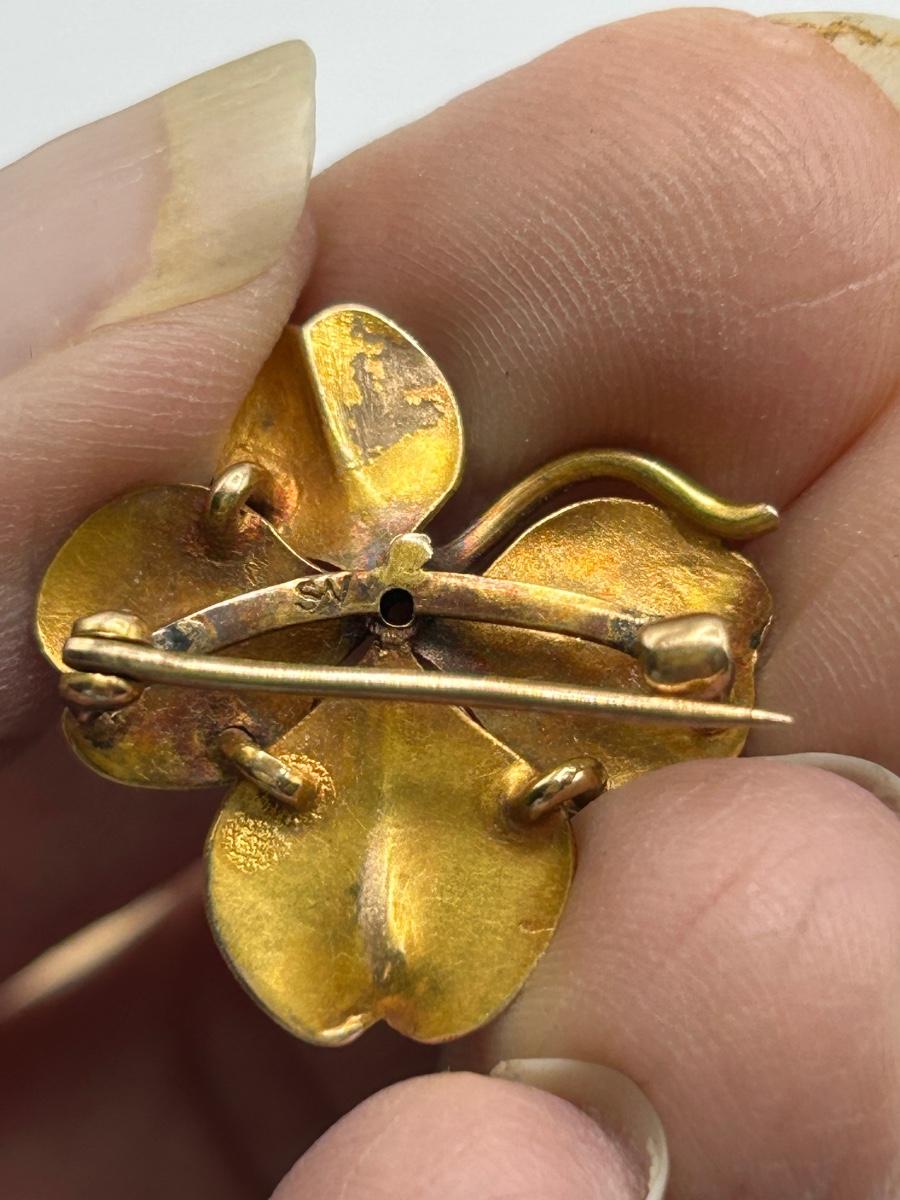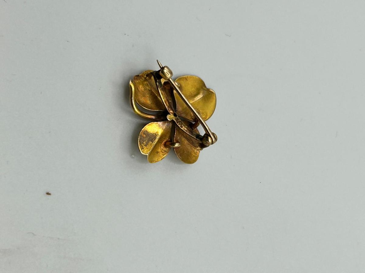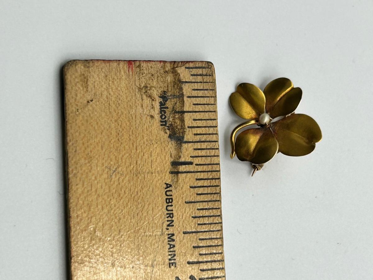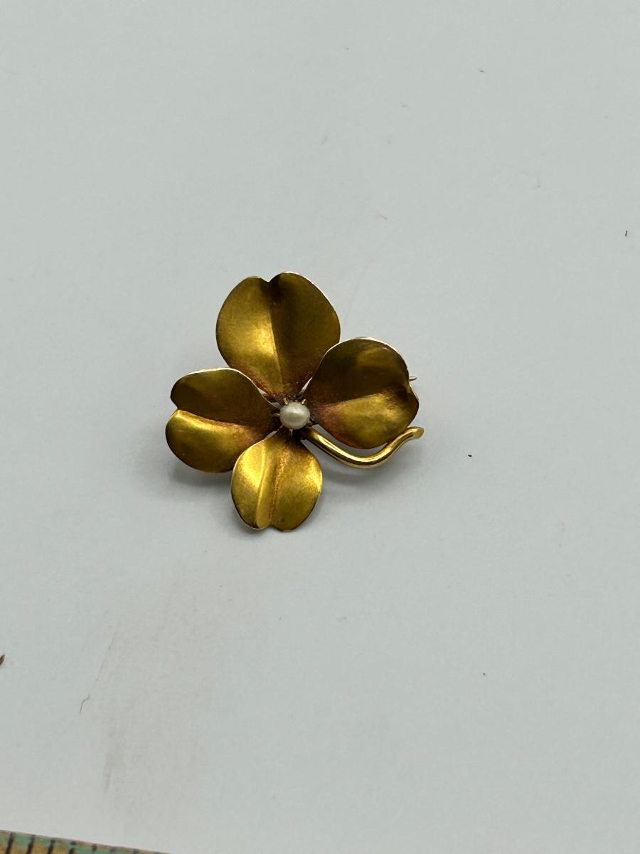 Vintage Gold Tone Four Leaf Clover with Faux Pearl Center Good Luck Pin Brooch. In good condition. About 1" size.