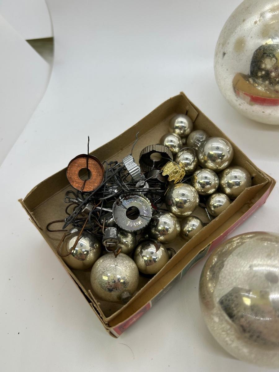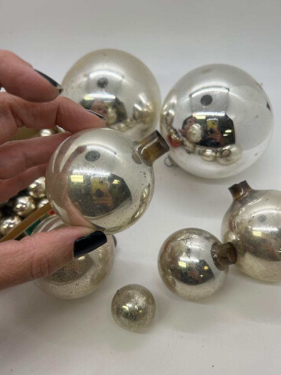 Mixed Size Lot of Vintage Blown Glass Christmas Holiday Ornaments Silver Balls Bulbs. 3" to 3/4" size. Some are missing the metal hanging top piece but there is a mixed lot of those included. Signs of age to the finish but no broken bulbs. Great for decor or holiday crafts.