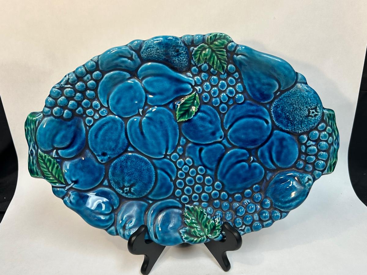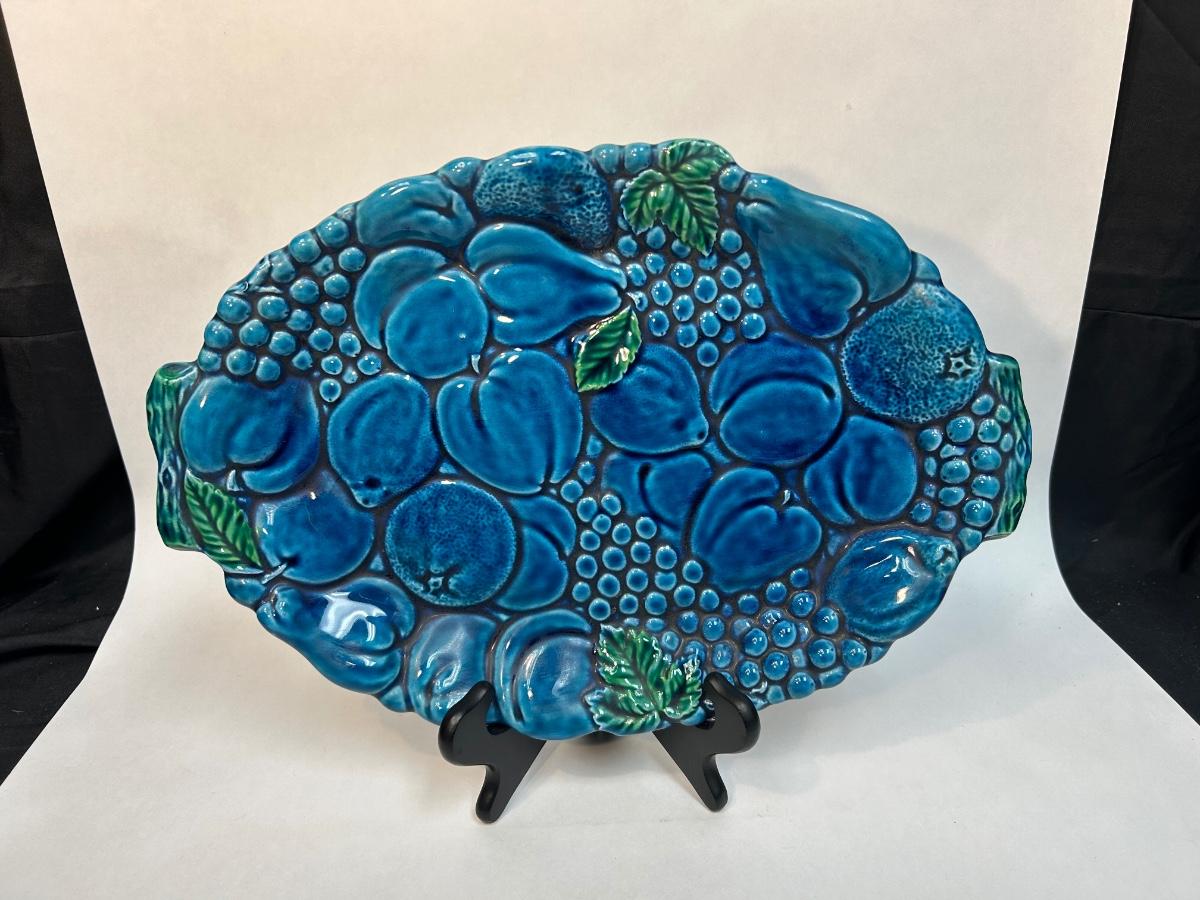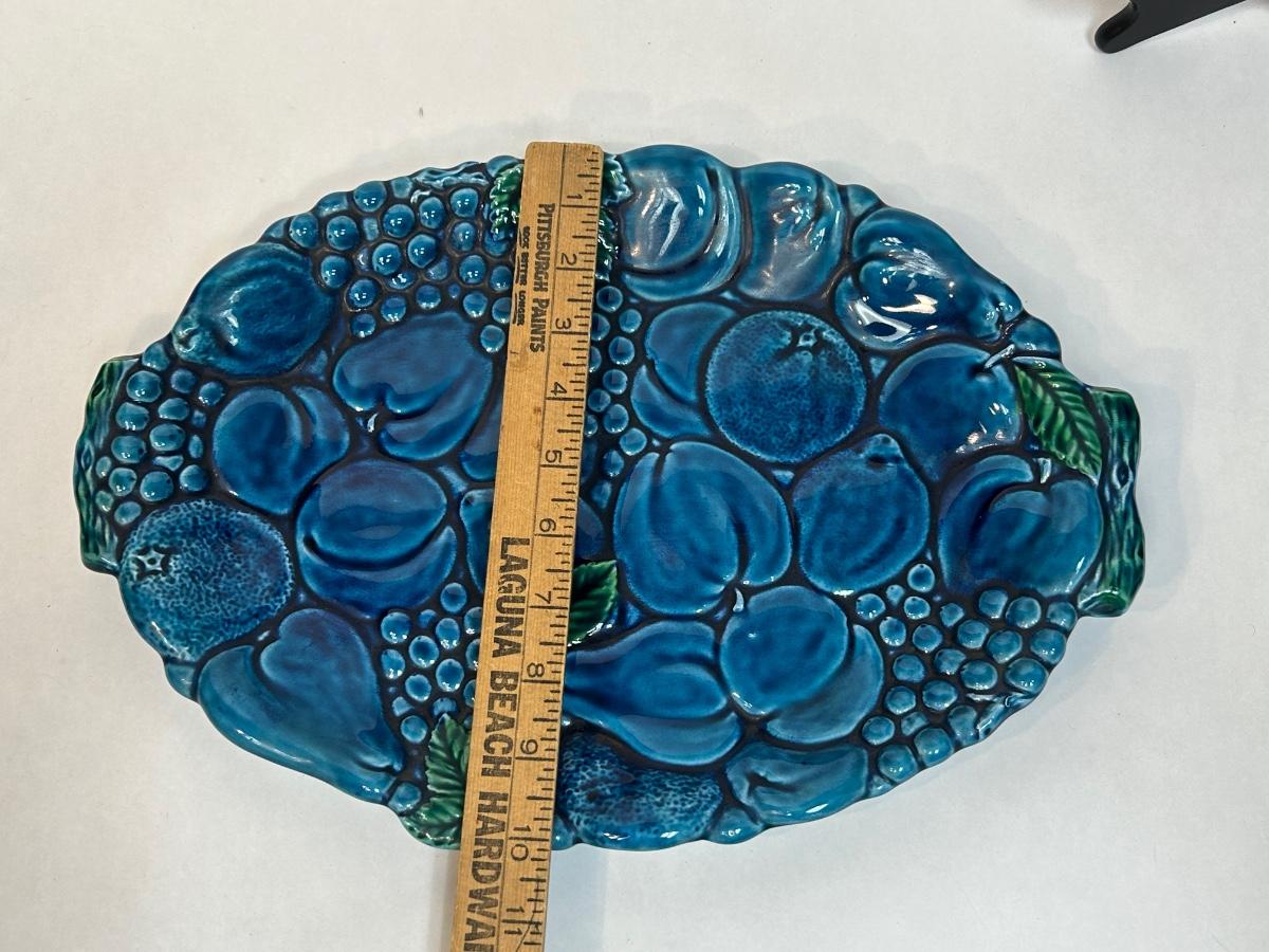 Vintage Turquoise Blue Majolica Fruit Pattern Serving Tray Inarco Pottery E3443. In good vintage condition. Displays great. About 15" size.