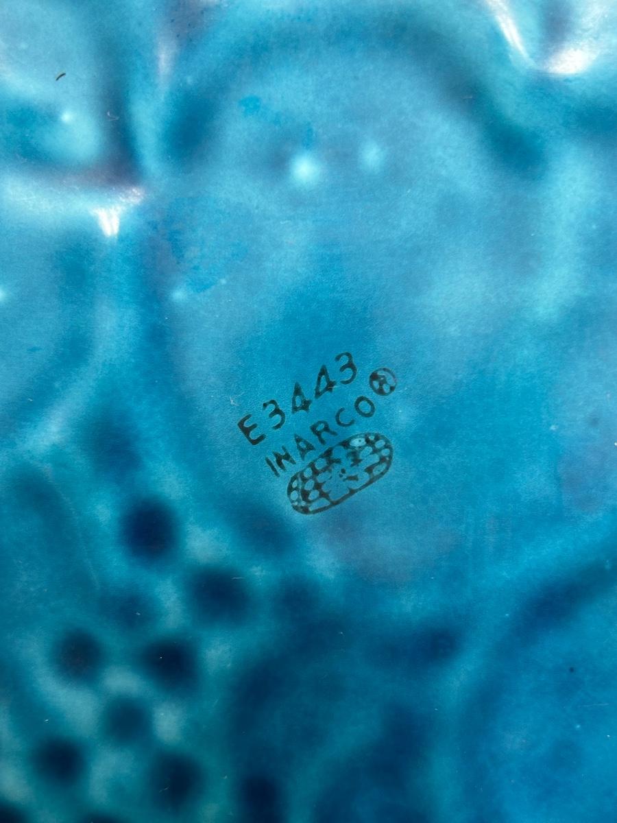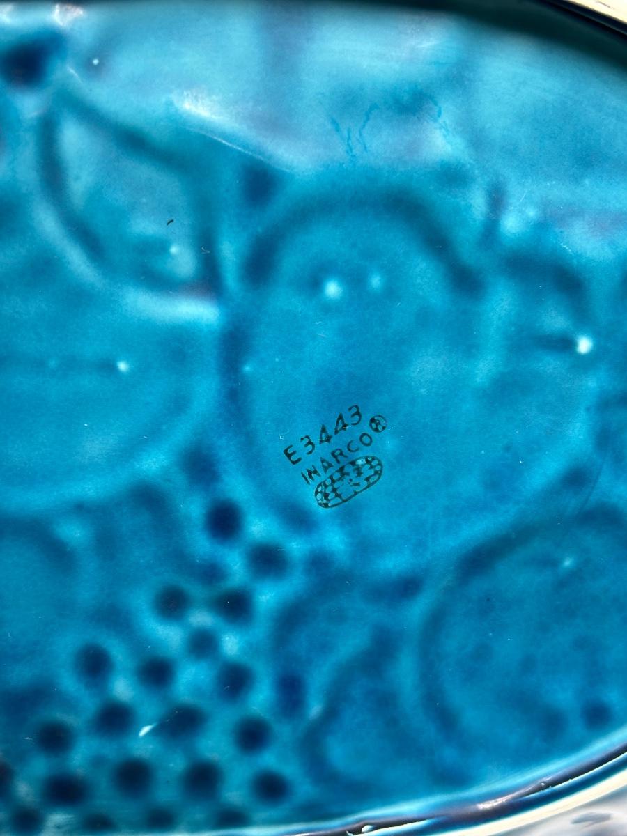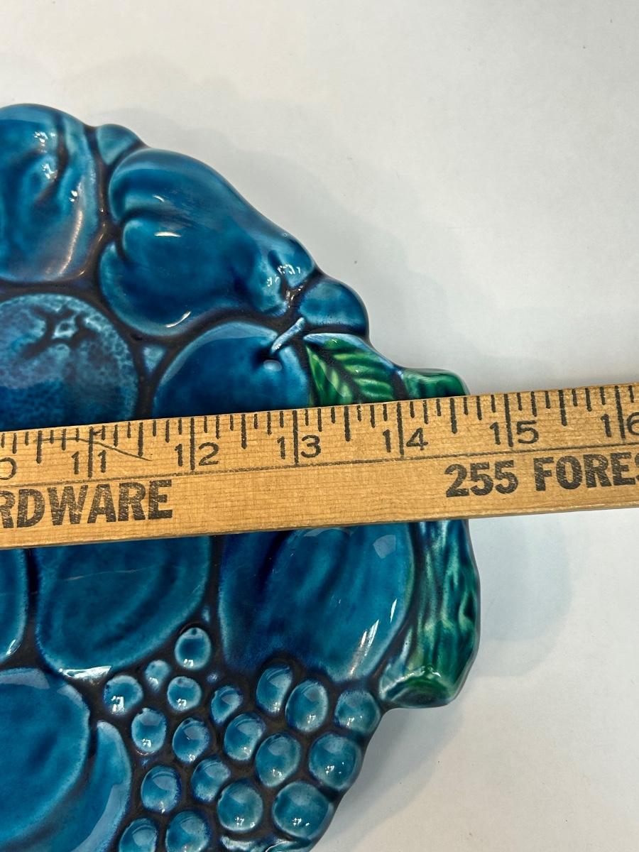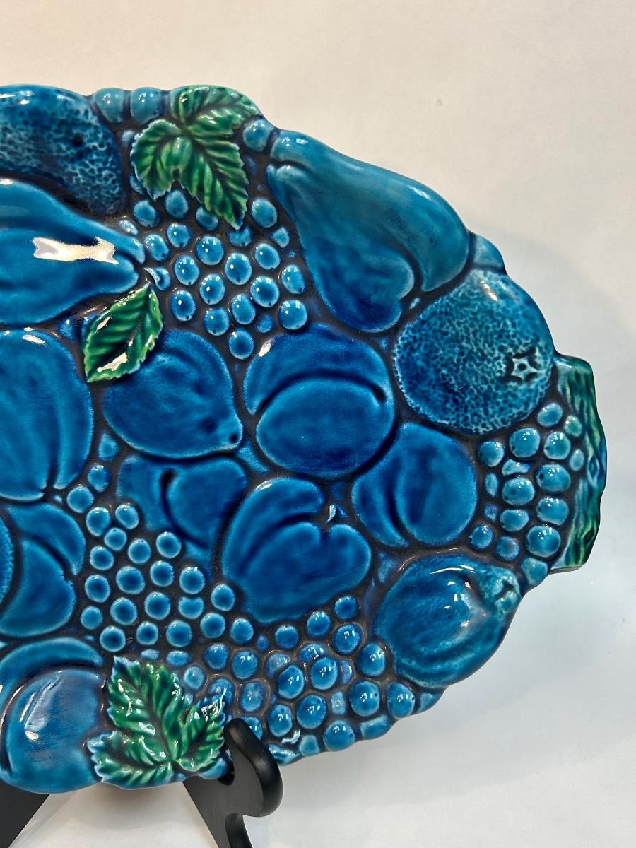 Vintage Turquoise Blue Majolica Fruit Pattern Serving Tray Inarco Pottery E3443. In good vintage condition. Displays great. About 15" size.