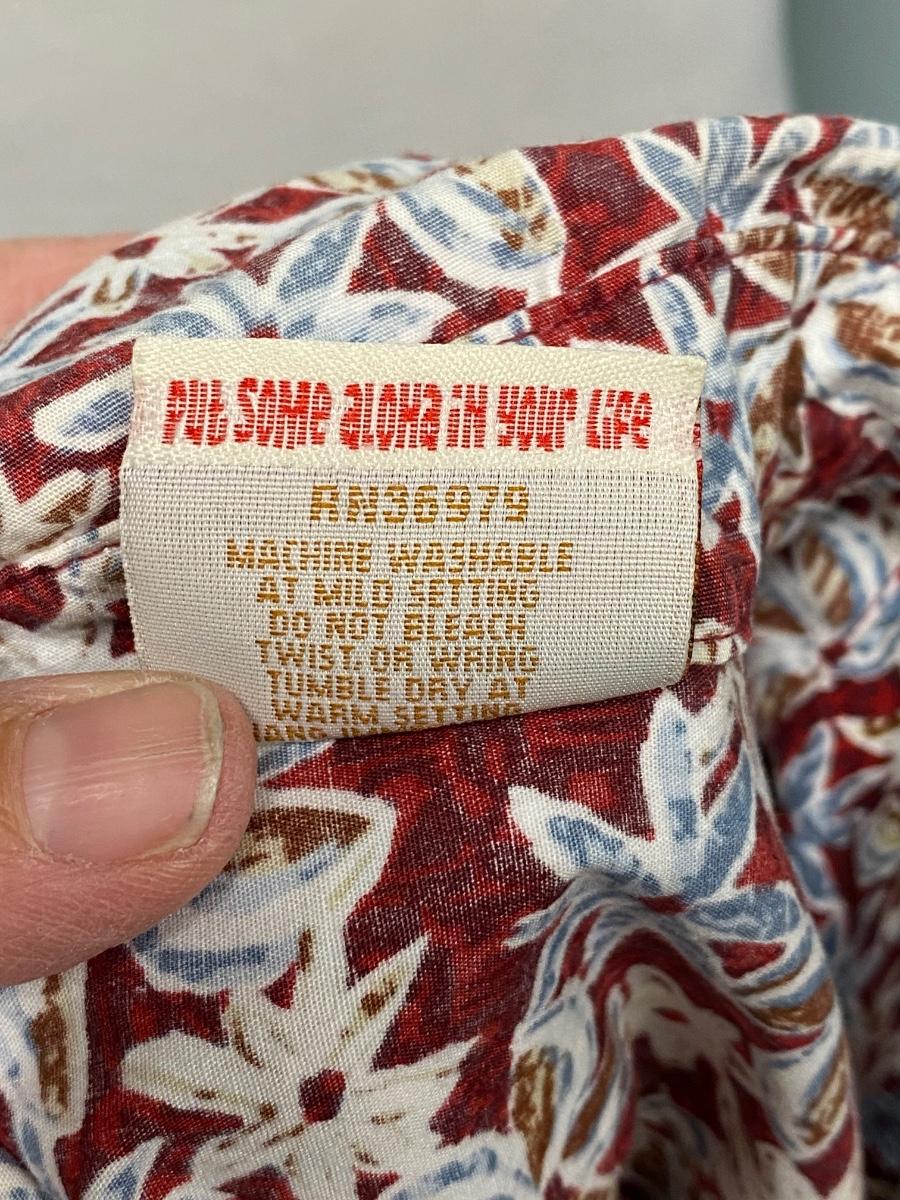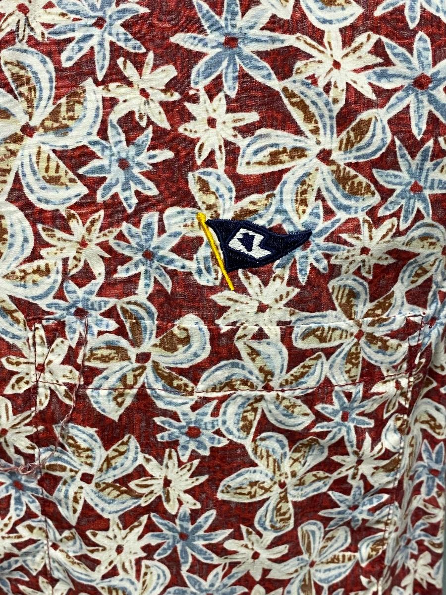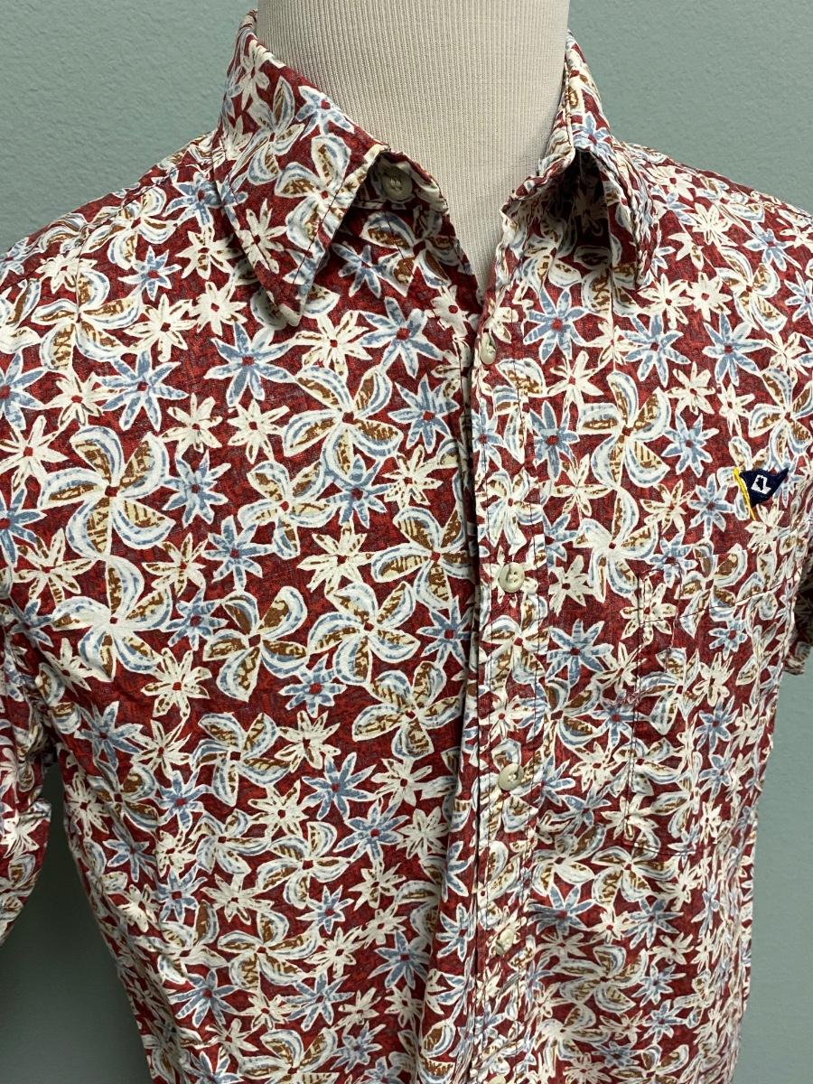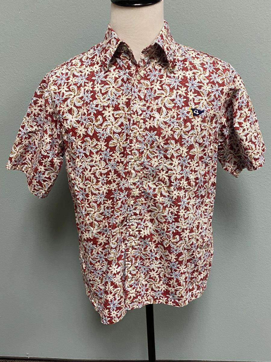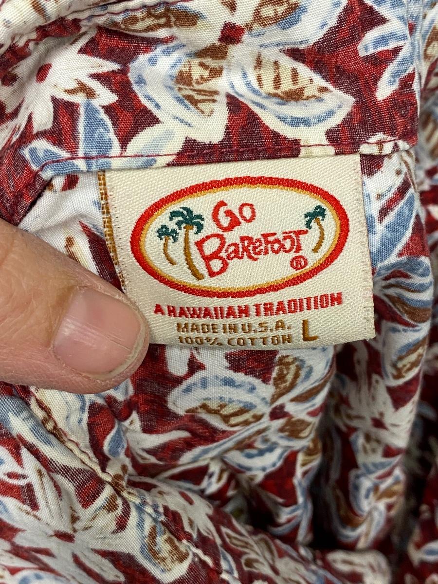Men's Go Barefoot Red Hawaiian Button Front Shirt Size Large. Has a flag emblem stitched above pocket; previous owner may have been a club member somewhere. In good condition.