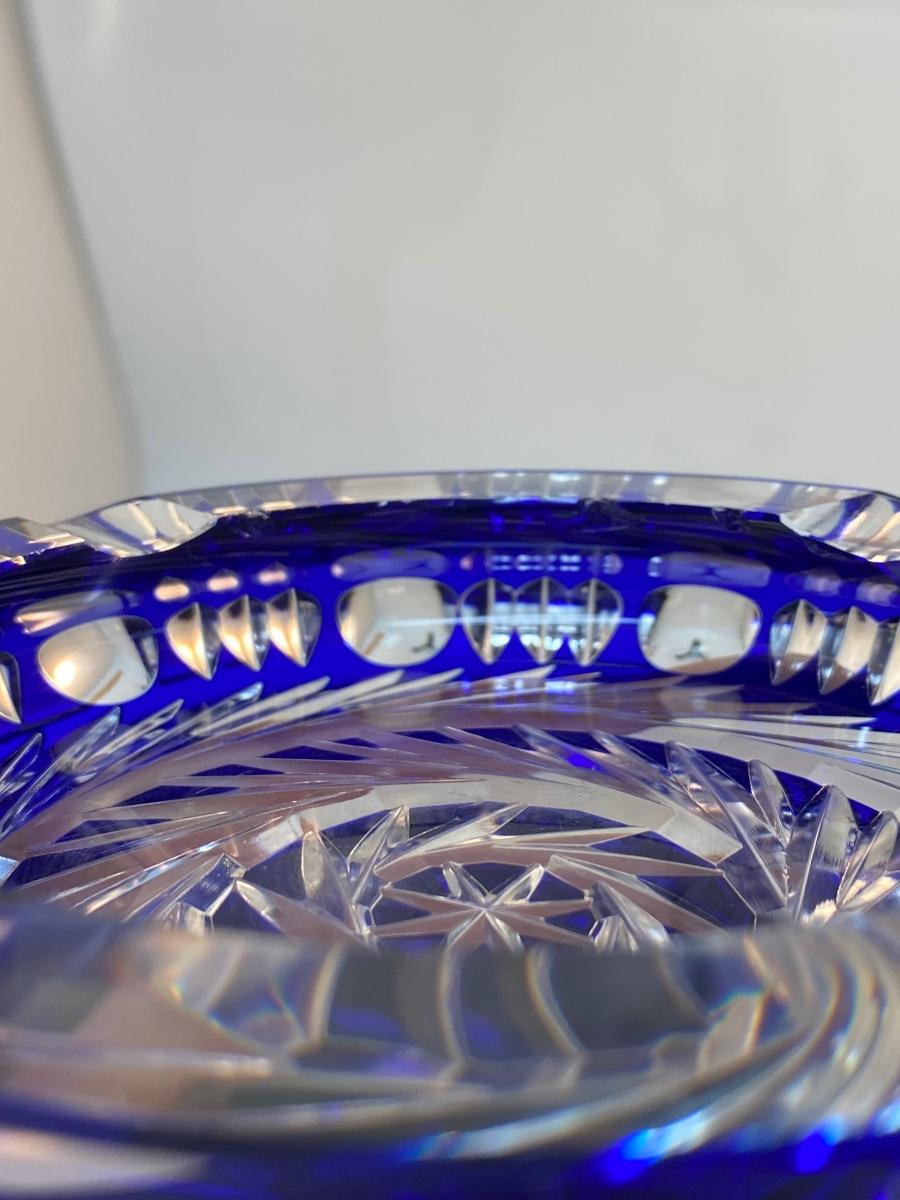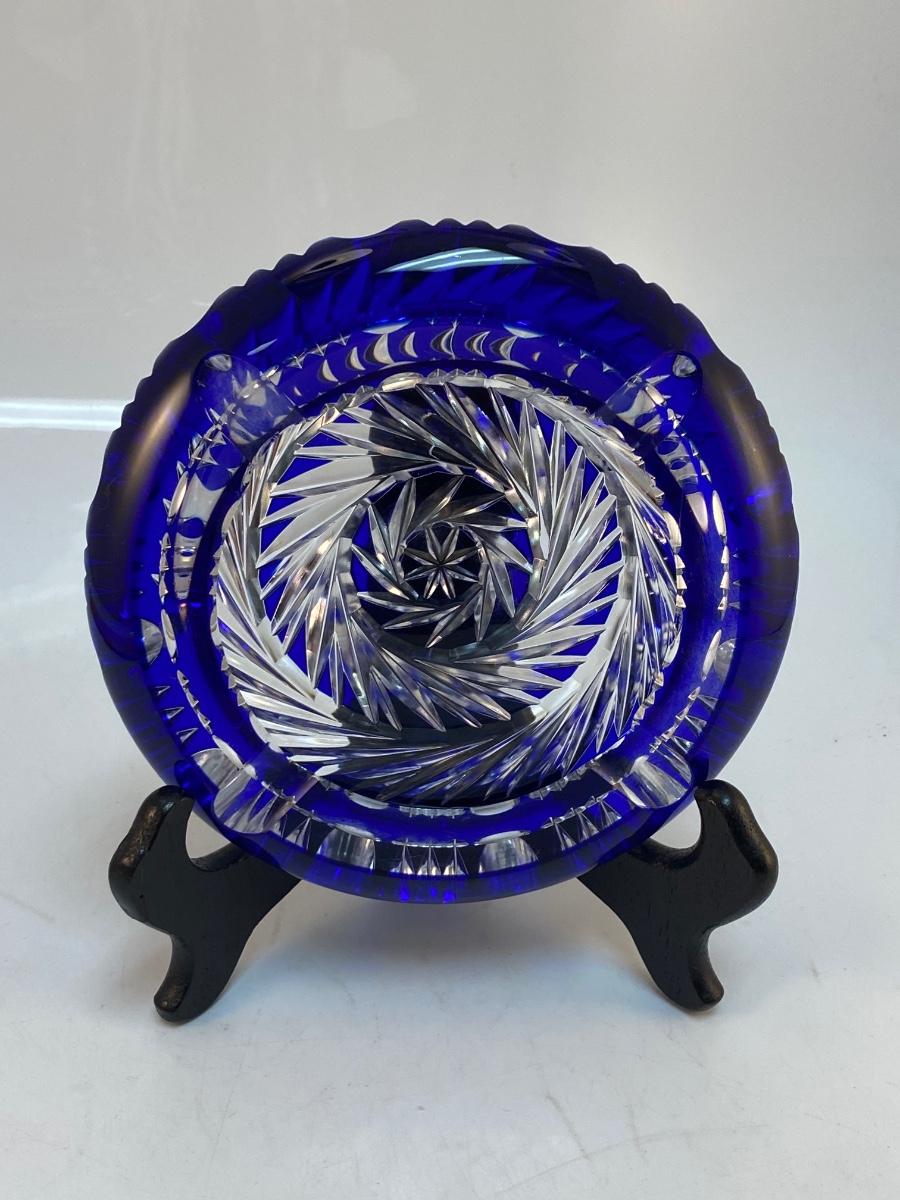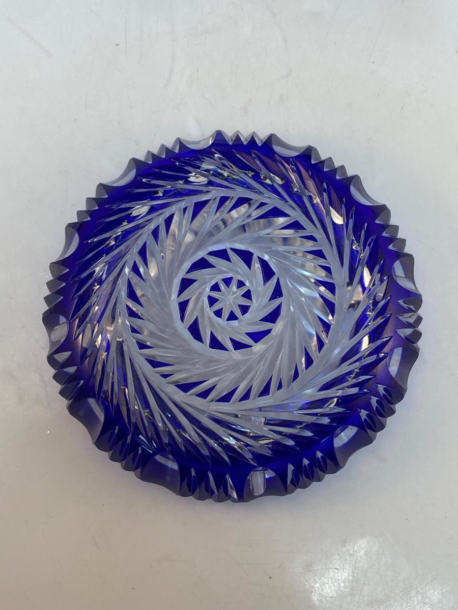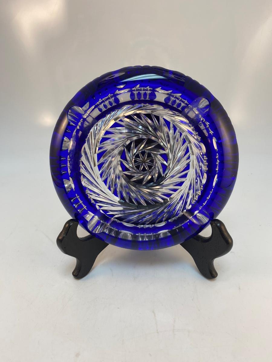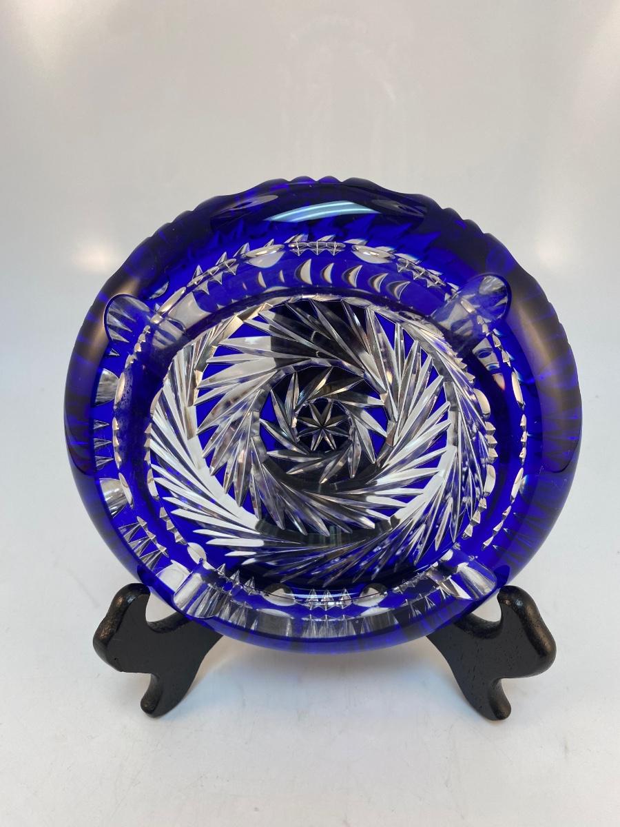 Vintage Cobalt Blue Cut to Clear Heavy Crystal Round Ashtray. Beautiful pinwheel spiral cut design. Displays nicely. There is some chipping along the underside edge of inside lip, you can feel more than see it. 6" diameter.