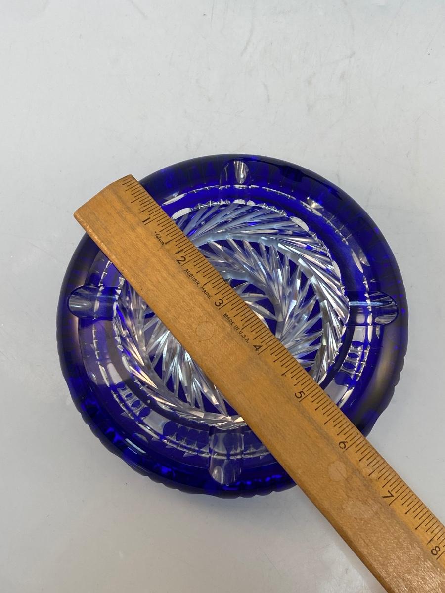 Vintage Cobalt Blue Cut to Clear Heavy Crystal Round Ashtray