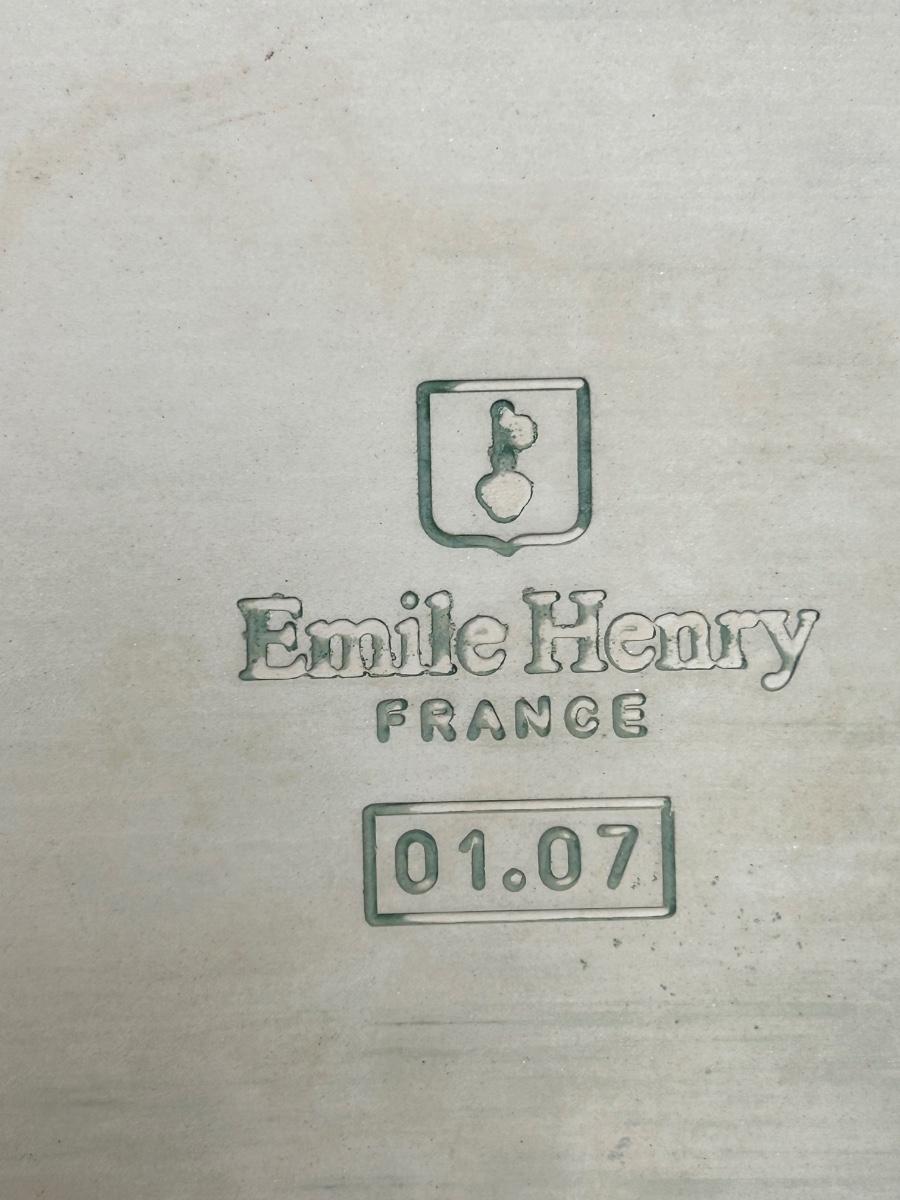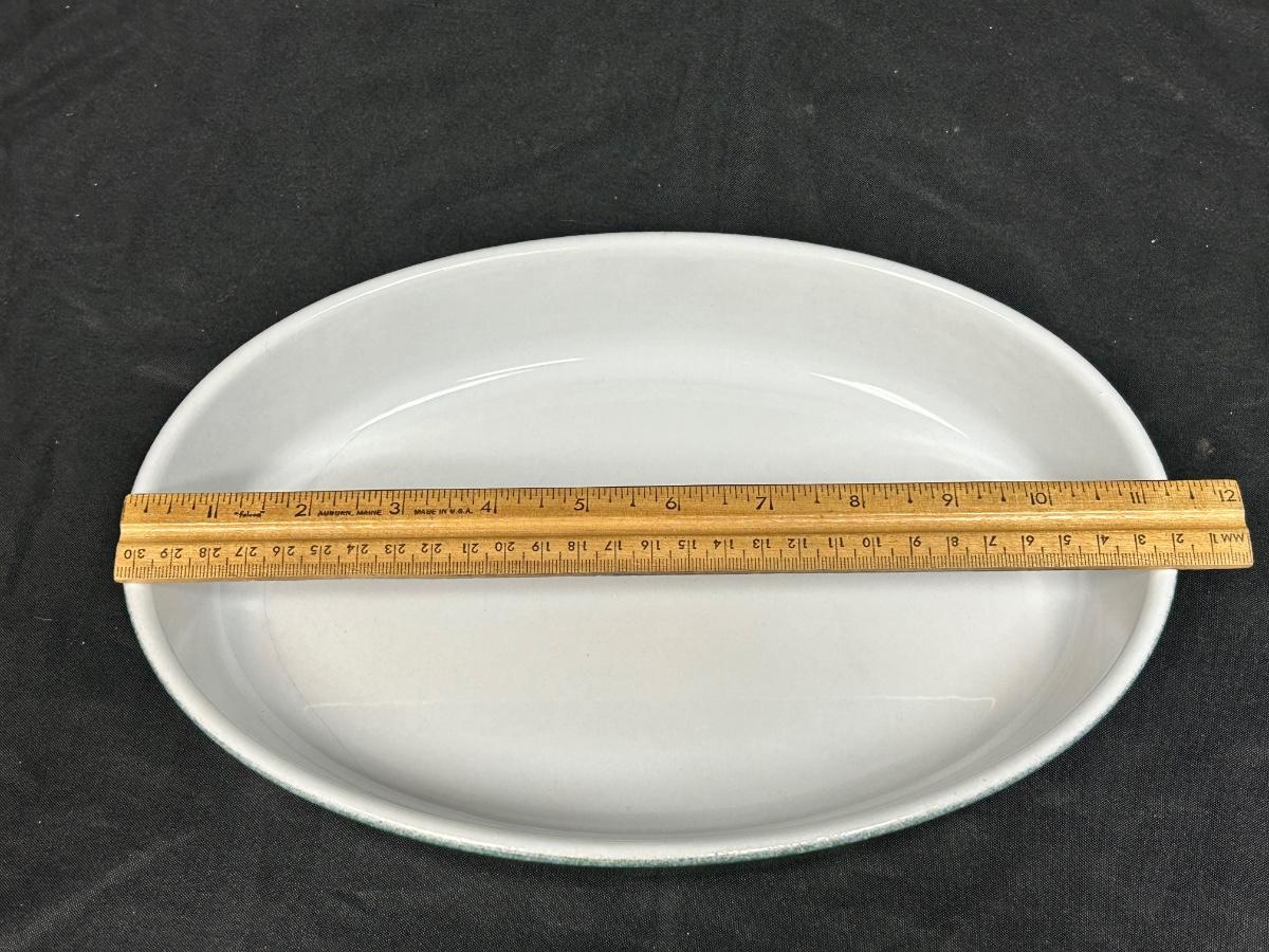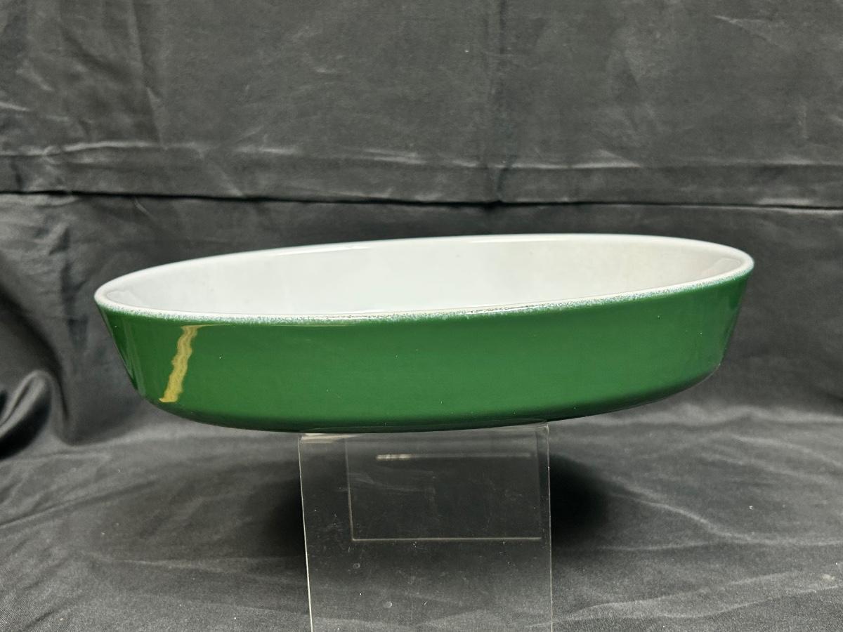 Vintage Emile Henry France Green and White Oval Casserole Dish. In used condition. There does seem to be a crack along the side on the bottom that looks to go all the way through. May work good for serving piece, not sure if oven use would worsen the crack.