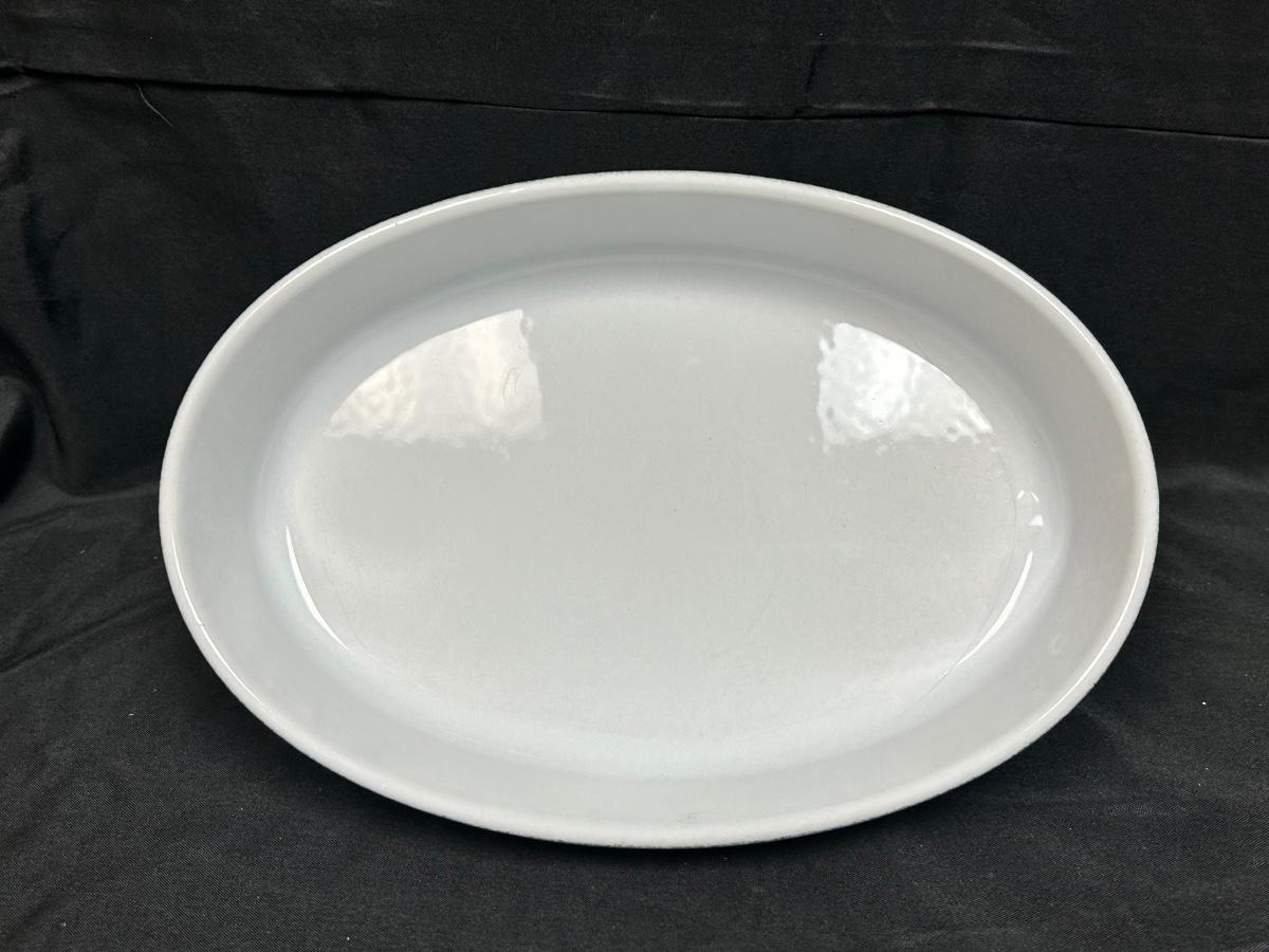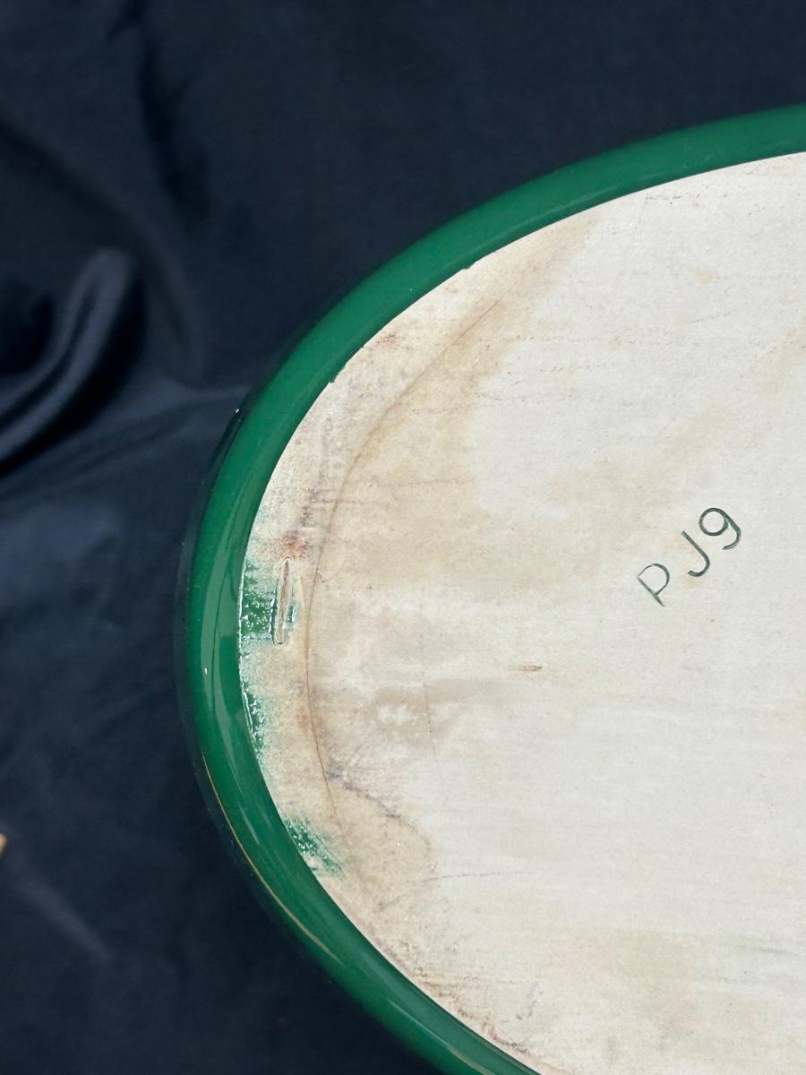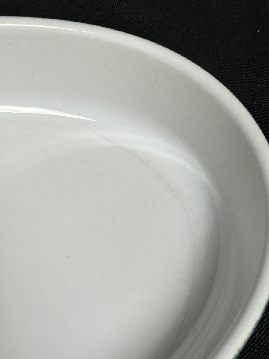 Vintage Emile Henry France Green and White Oval Casserole Dish. In used condition. There does seem to be a crack along the side on the bottom that looks to go all the way through. May work good for serving piece, not sure if oven use would worsen the crack.