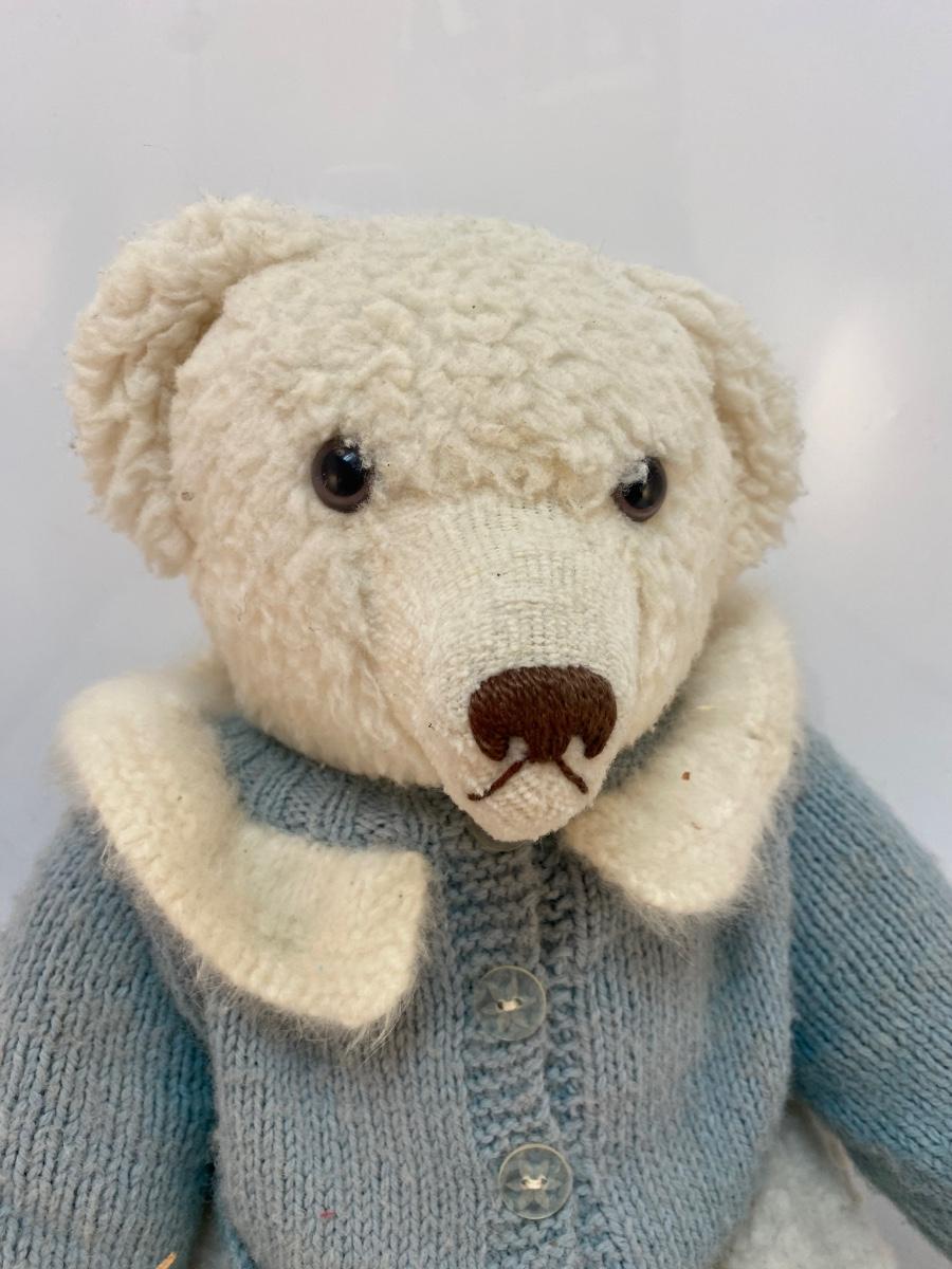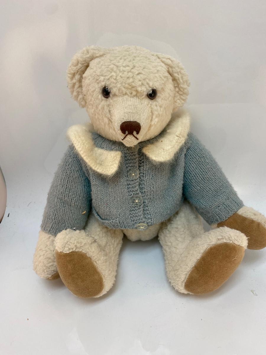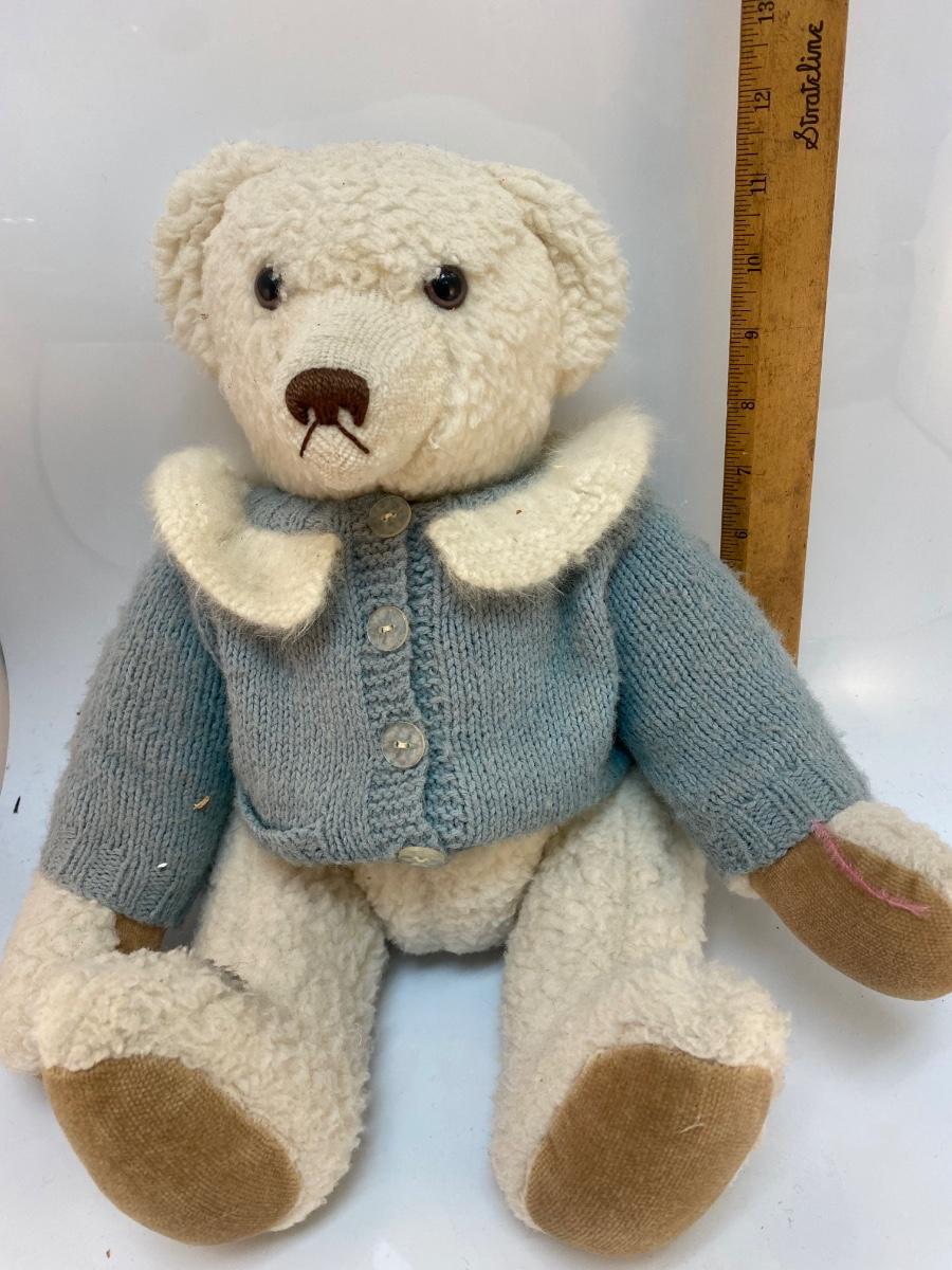 Vintage Jointed White Fur Teddy Bear Plush with Blue Sweater. In vintage well-loved condition. Some light discolor and a smudge on foot. About 16" size.