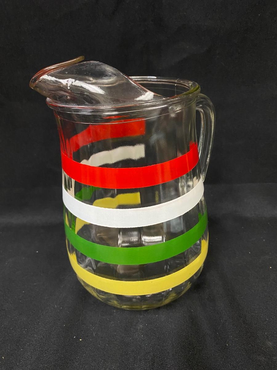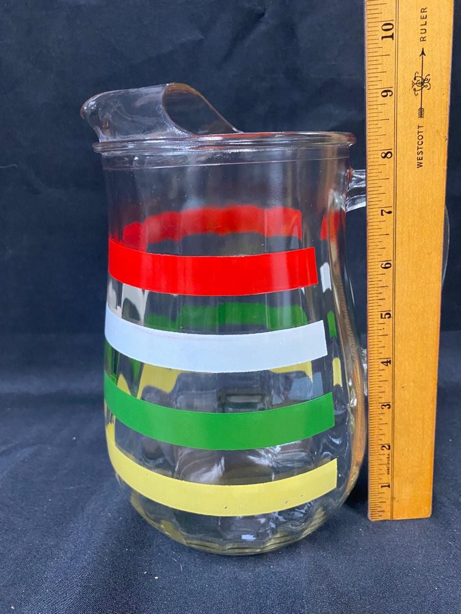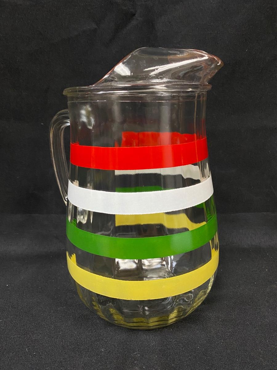 Retro Red White Green Yellow Mod Color Striped Ribbed Glass Iced Tea Water Pitcher
