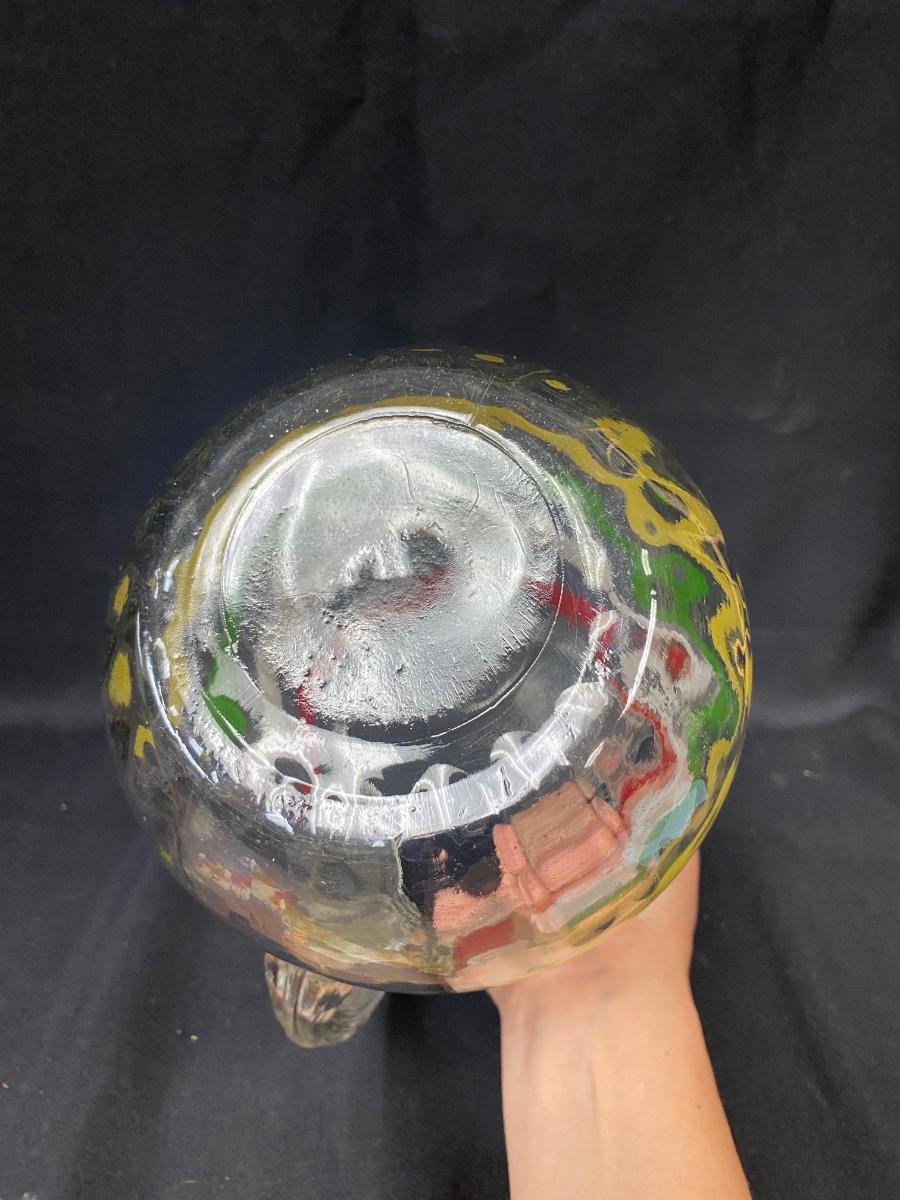 Retro Red White Green Yellow Mod Color Striped Ribbed Glass Iced Tea Water Pitcher. In great condition.