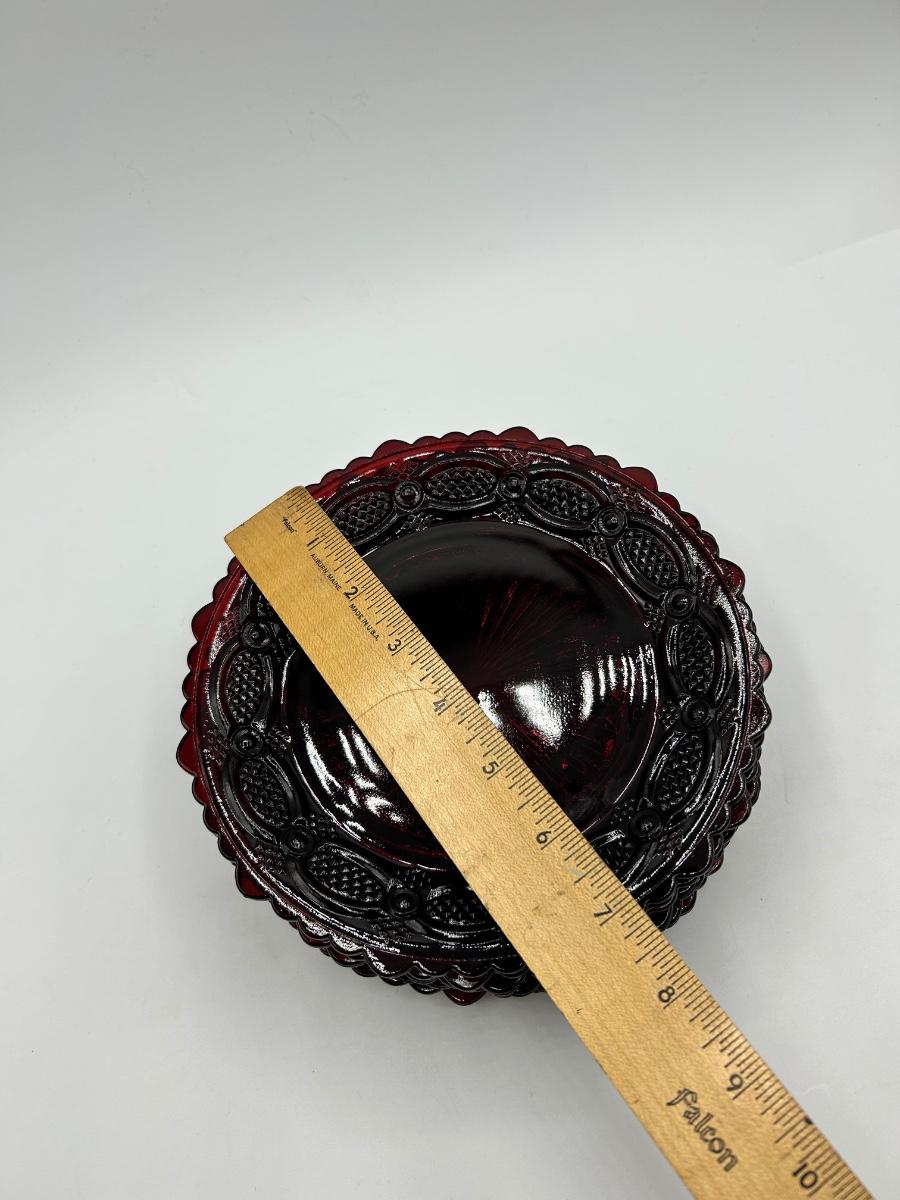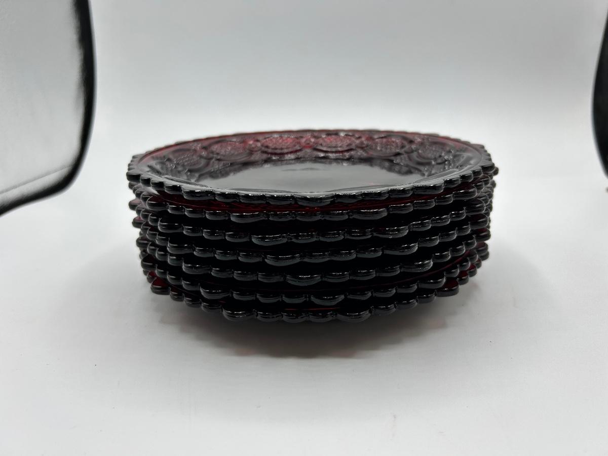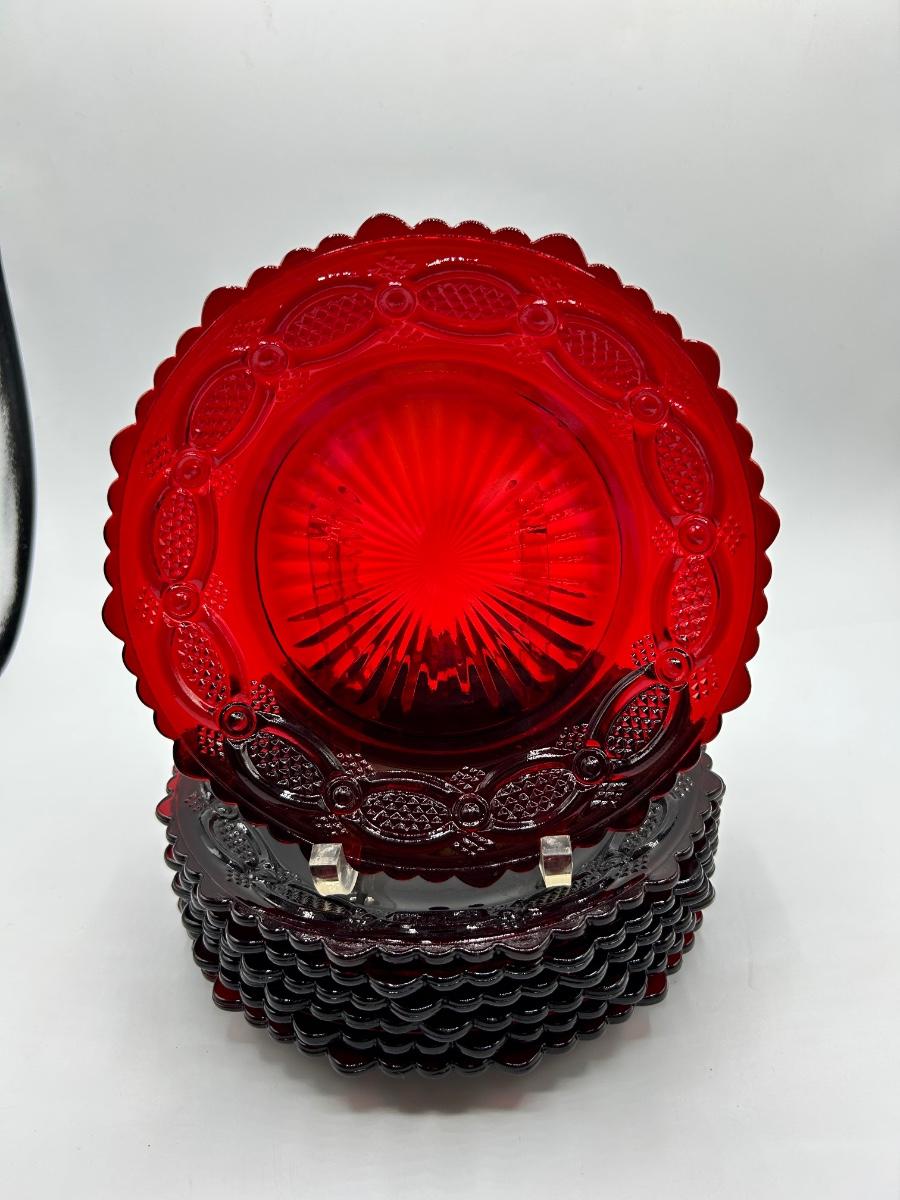 Vintage Ruby Red Avon Glass Salad Dessert Plates Cape Cod Pattern Pressed Glass 1970s. In previously used condition. No major chips noticed but may have a flea bite here and there. About 7" size. Set of 7.