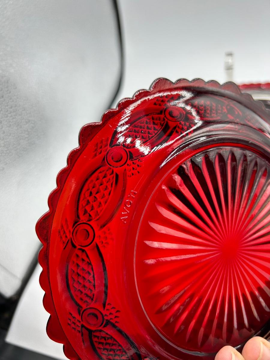 Vintage Ruby Red Avon Glass Salad Dessert Plates Cape Cod Pattern Pressed Glass 1970s
