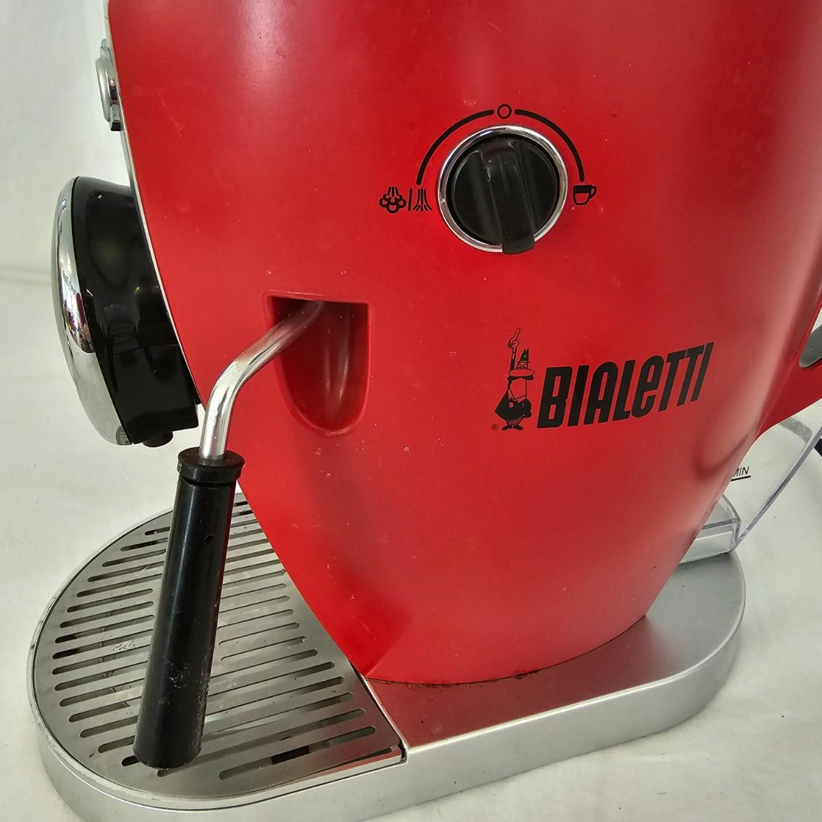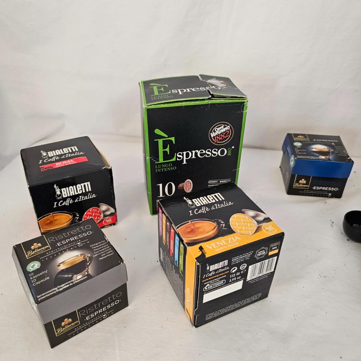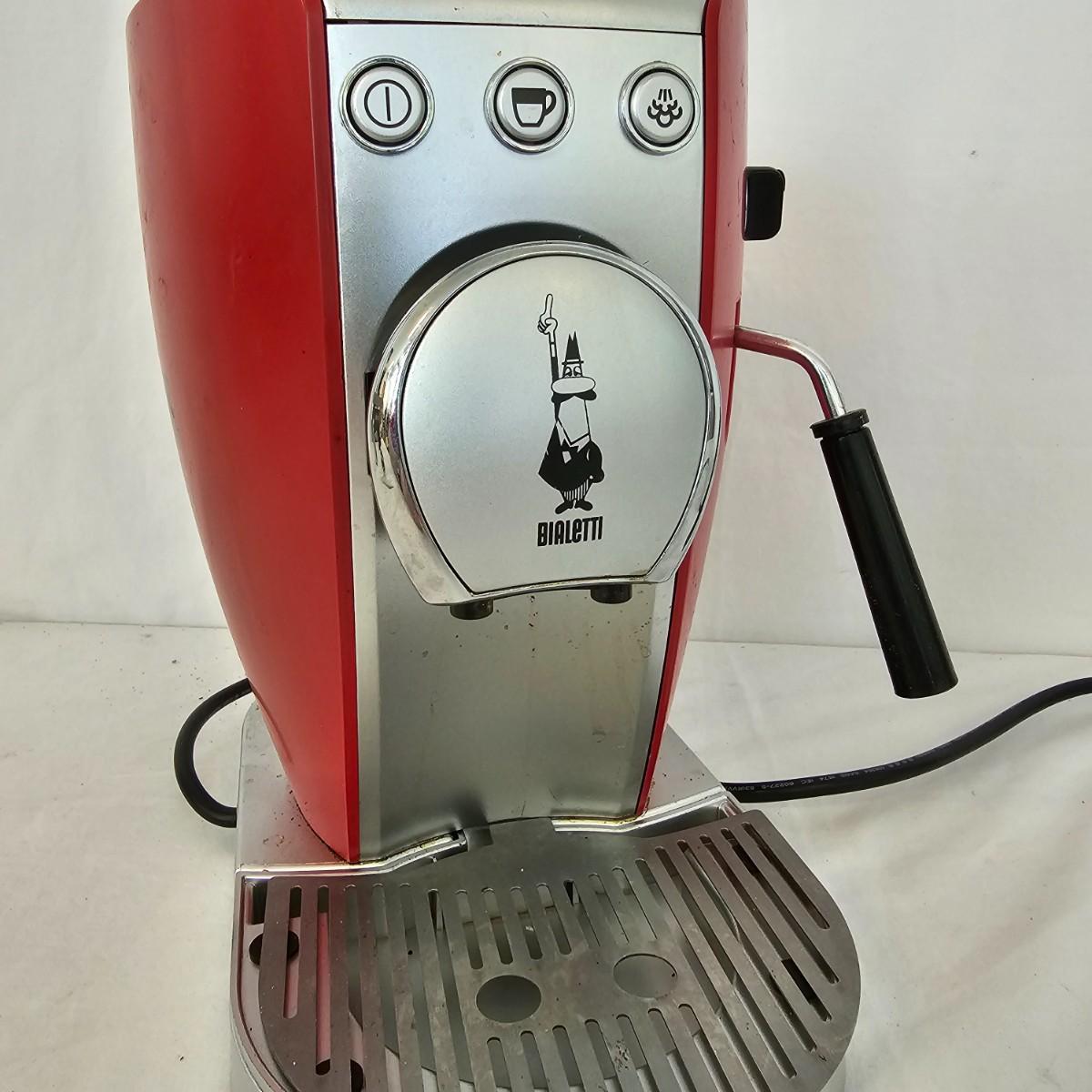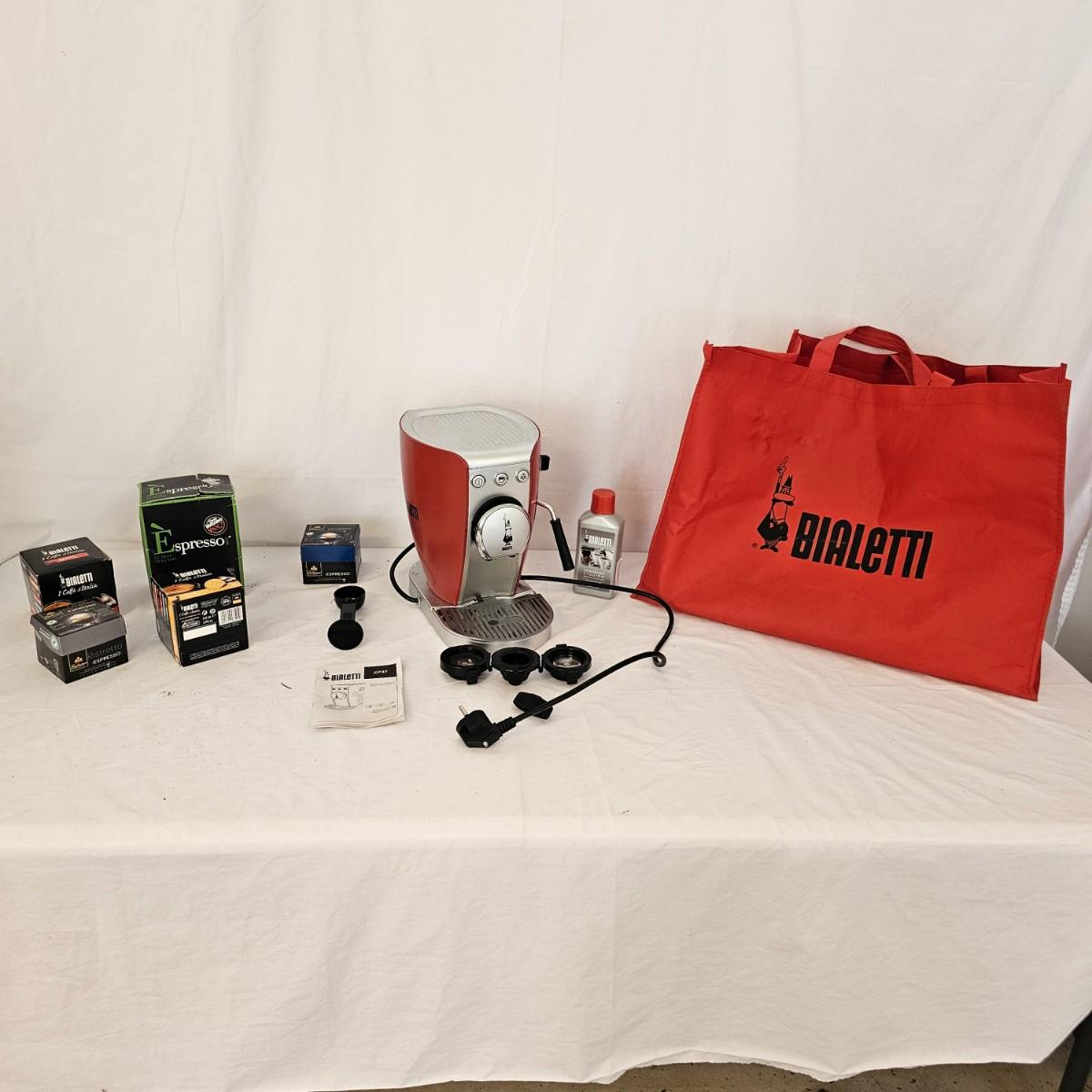 The Bialetti Trio System machine. Uses capsules, pods or ground coffee. Comes with an assortment of coffee pods and in original packaging. Includes Bialetti bag. Unable to test unit as it has European style plug and will require an adapter to use in the USA. All items in red bag measure approximately 20.5" x 10" x 15"H Shipping available.