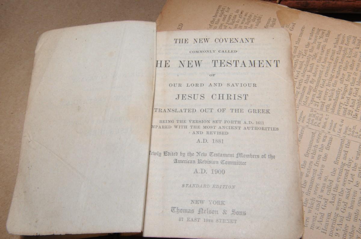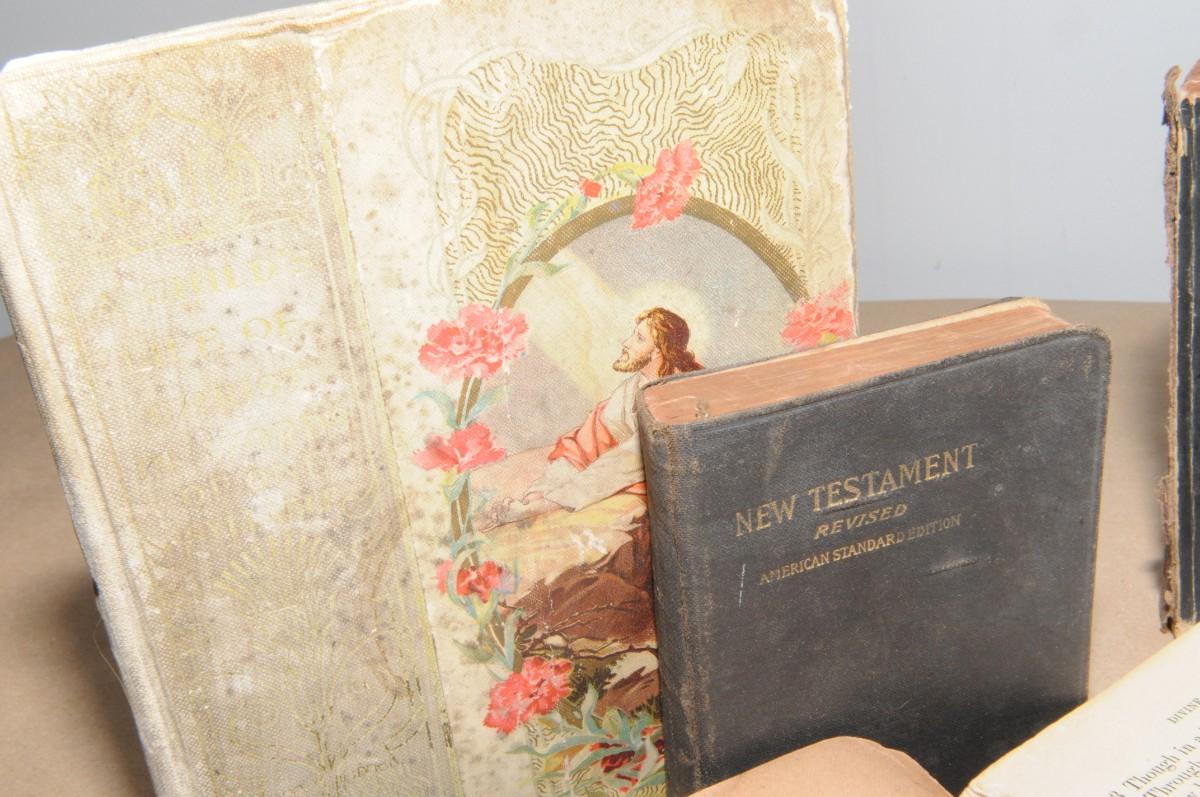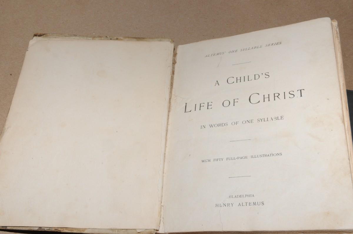 A Child's life of Christ by Henry Altemus. New Testament Revised AS edition, copywright 1901 by Thomas Nelson. The Holy Bible printed at university press oxford. 1843 Psalms and Hmns Presbyterian Church Book (Missing front pages). Antique Holy Bible (missing front and Back cover and first pages)