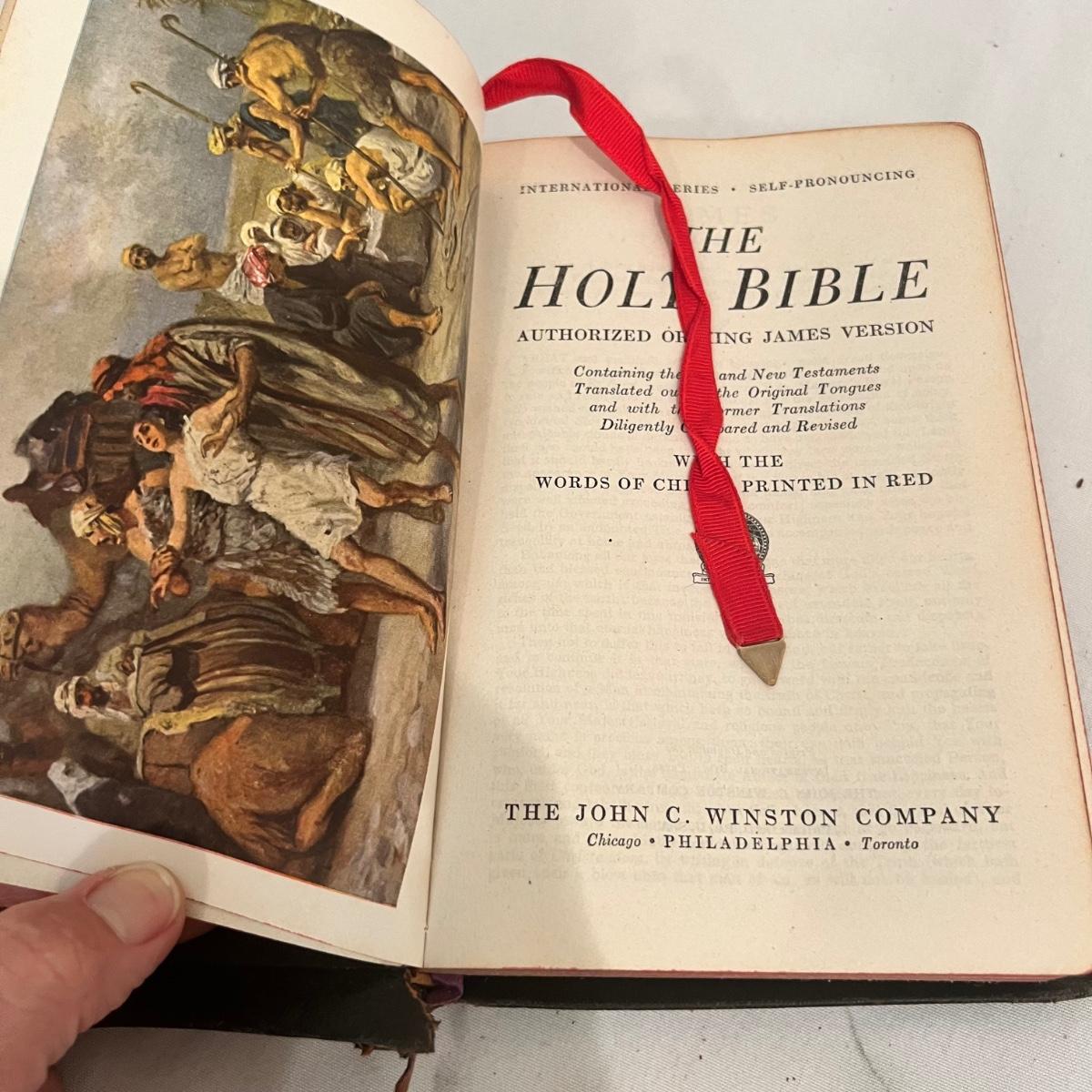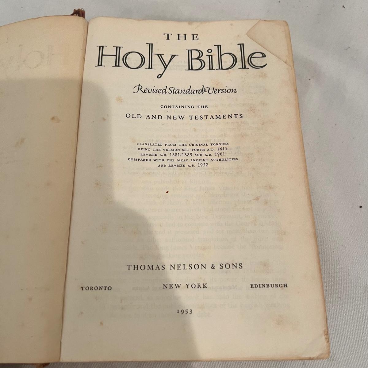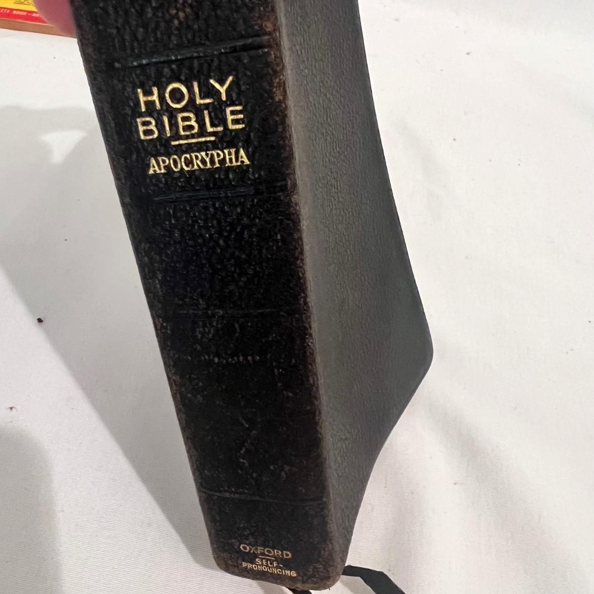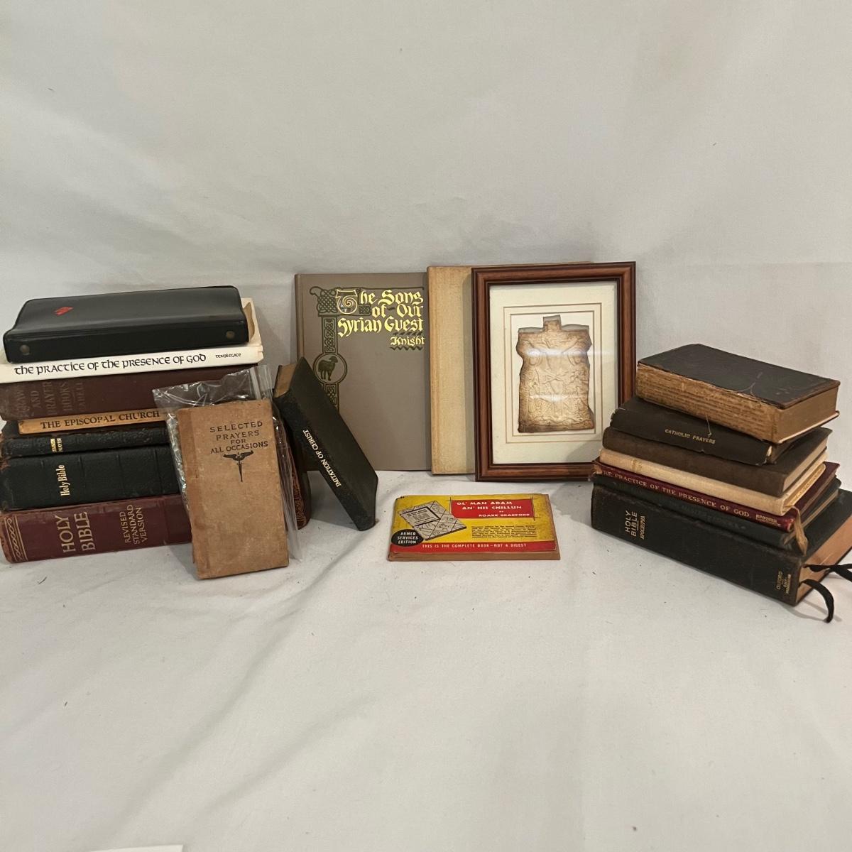 Many religious teaching books, including the Bible and Practices and Prayers in Christianity, among others. See photographs for exact titles. Many are over 100 years old. Some are more worn than others, please see photos for condition information.