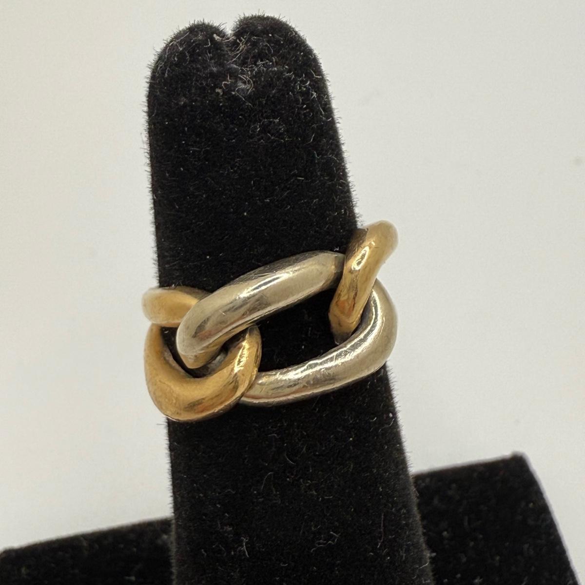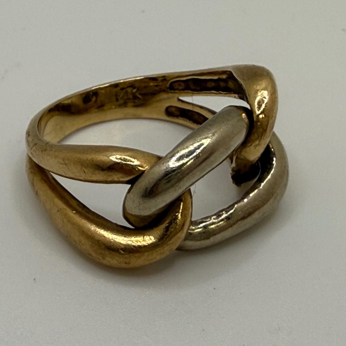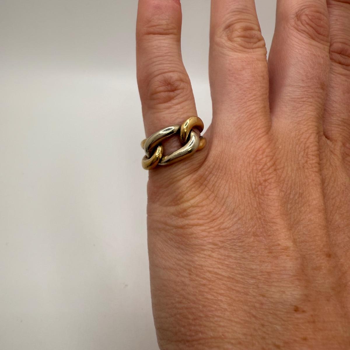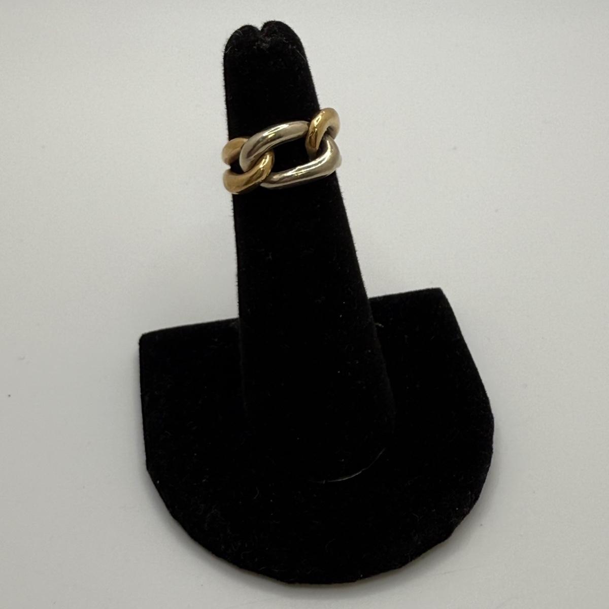 Bicolor Ring with a chainlink style. Yellow gold part is stamped 14K. White gold part is not stamped, but did register as 14K on our gold tester. Ring appears to be size 4.5. It needs a good cleaning on the inner band.