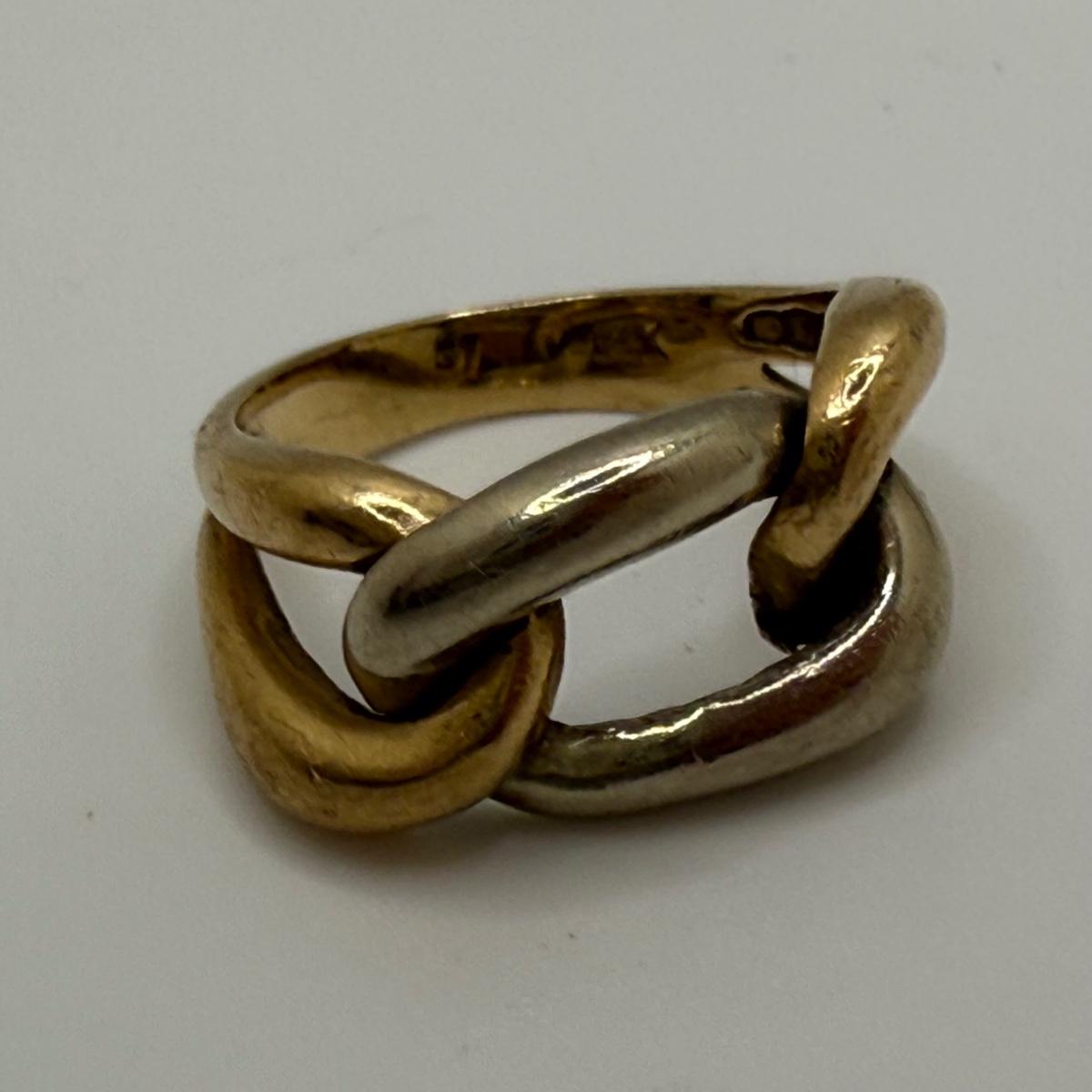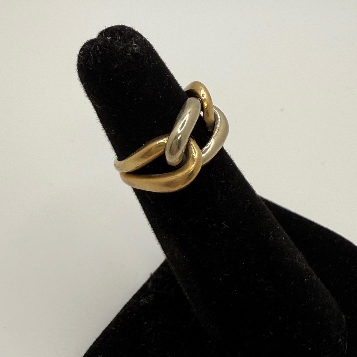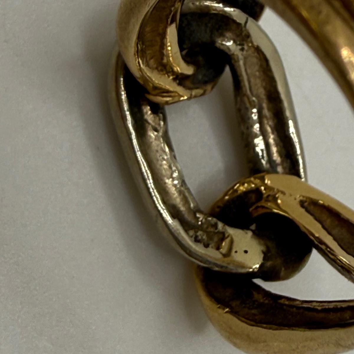 Bicolor Ring with a chainlink style. Yellow gold part is stamped 14K. White gold part is not stamped, but did register as 14K on our gold tester. Ring appears to be size 4.5. It needs a good cleaning on the inner band.