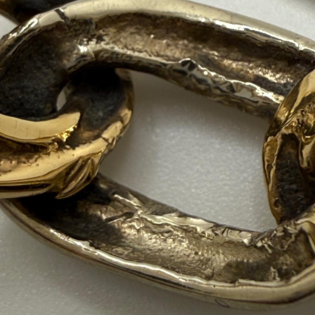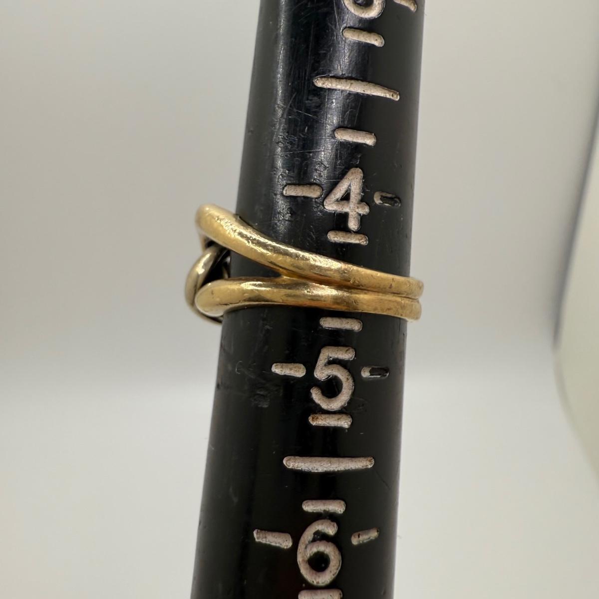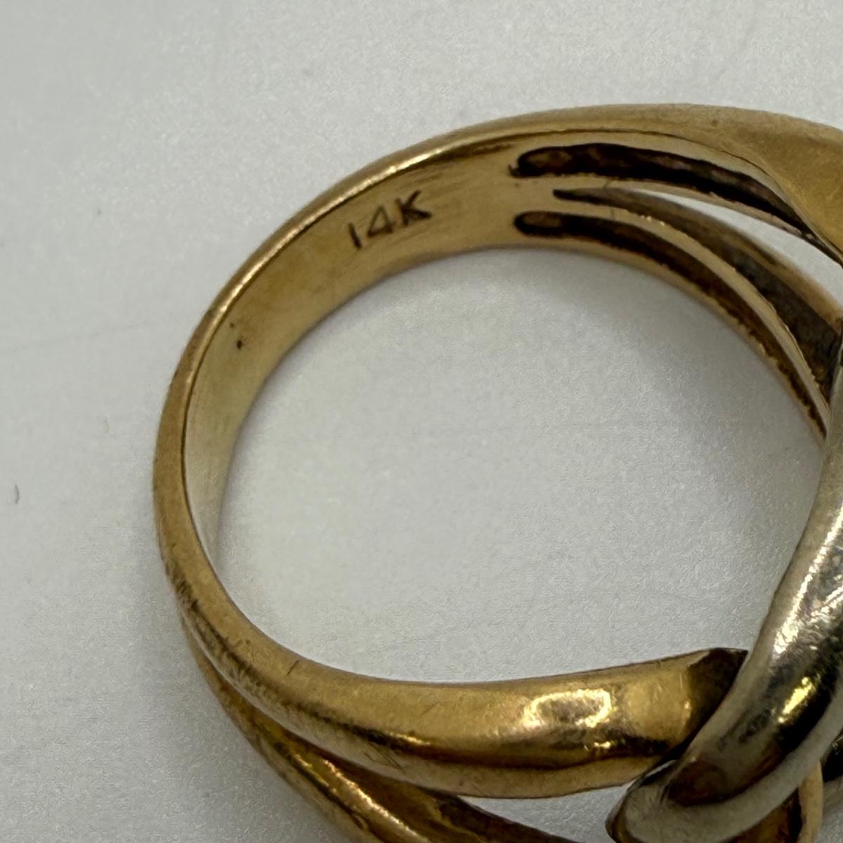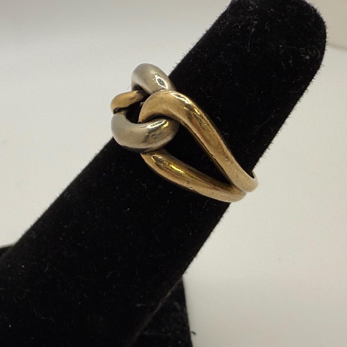 Bicolor Ring with a chainlink style. Yellow gold part is stamped 14K. White gold part is not stamped, but did register as 14K on our gold tester. Ring appears to be size 4.5. It needs a good cleaning on the inner band.