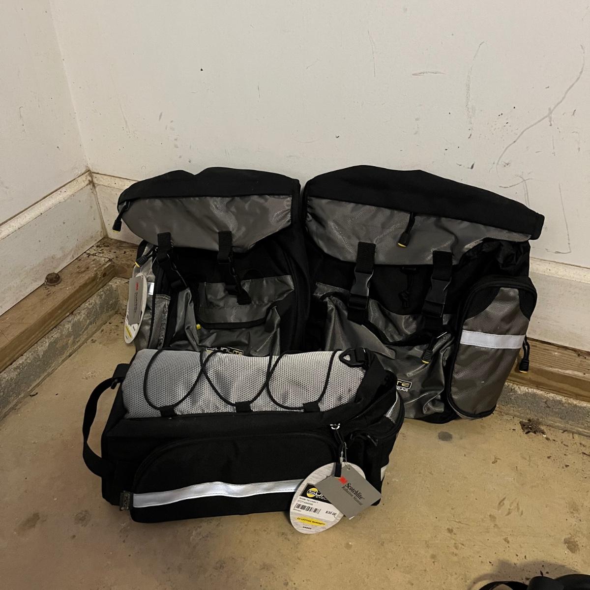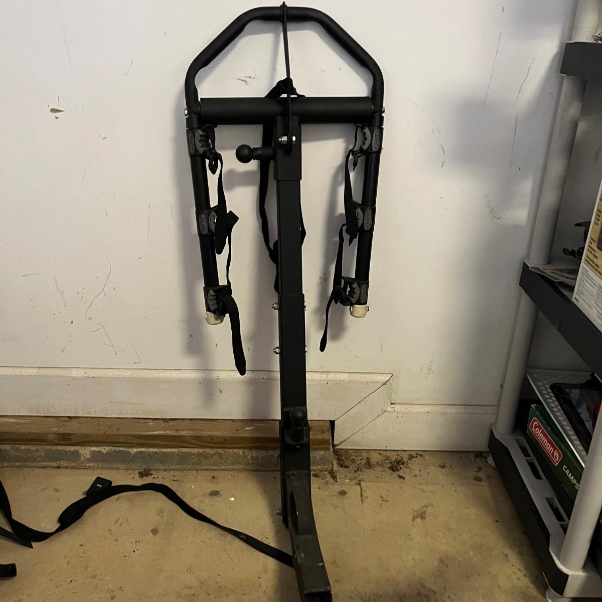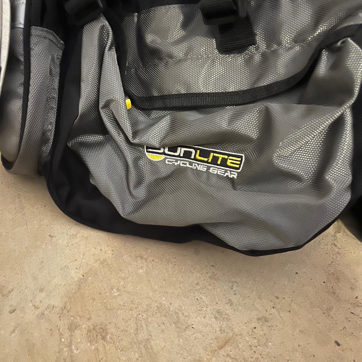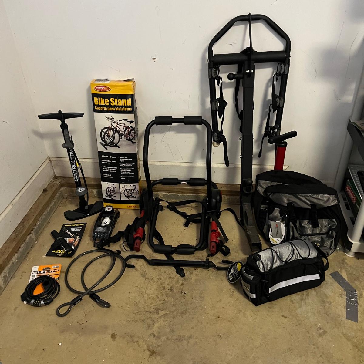 Lot includes bike stand, Allen three bicycle receiver hitch bike rack, Bell bike rack, Giant air pump, Sunlite panniers and rack bag, lock and more.