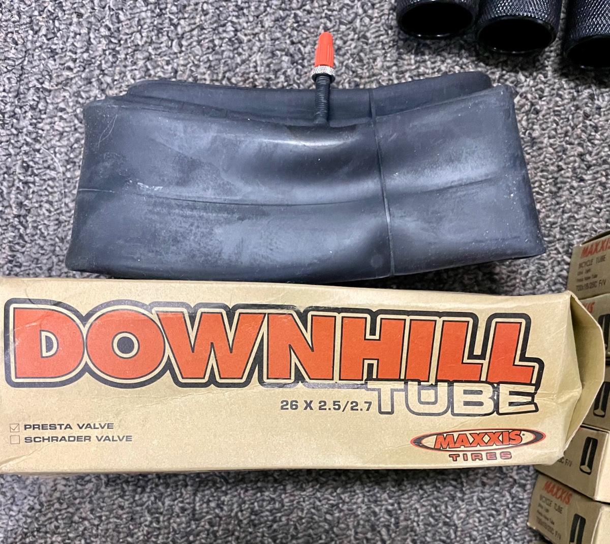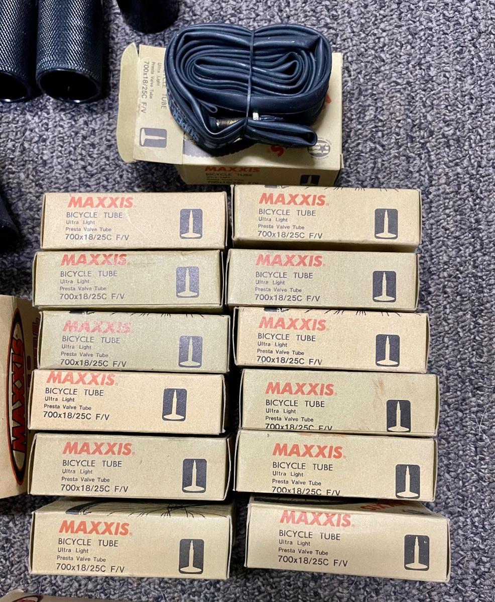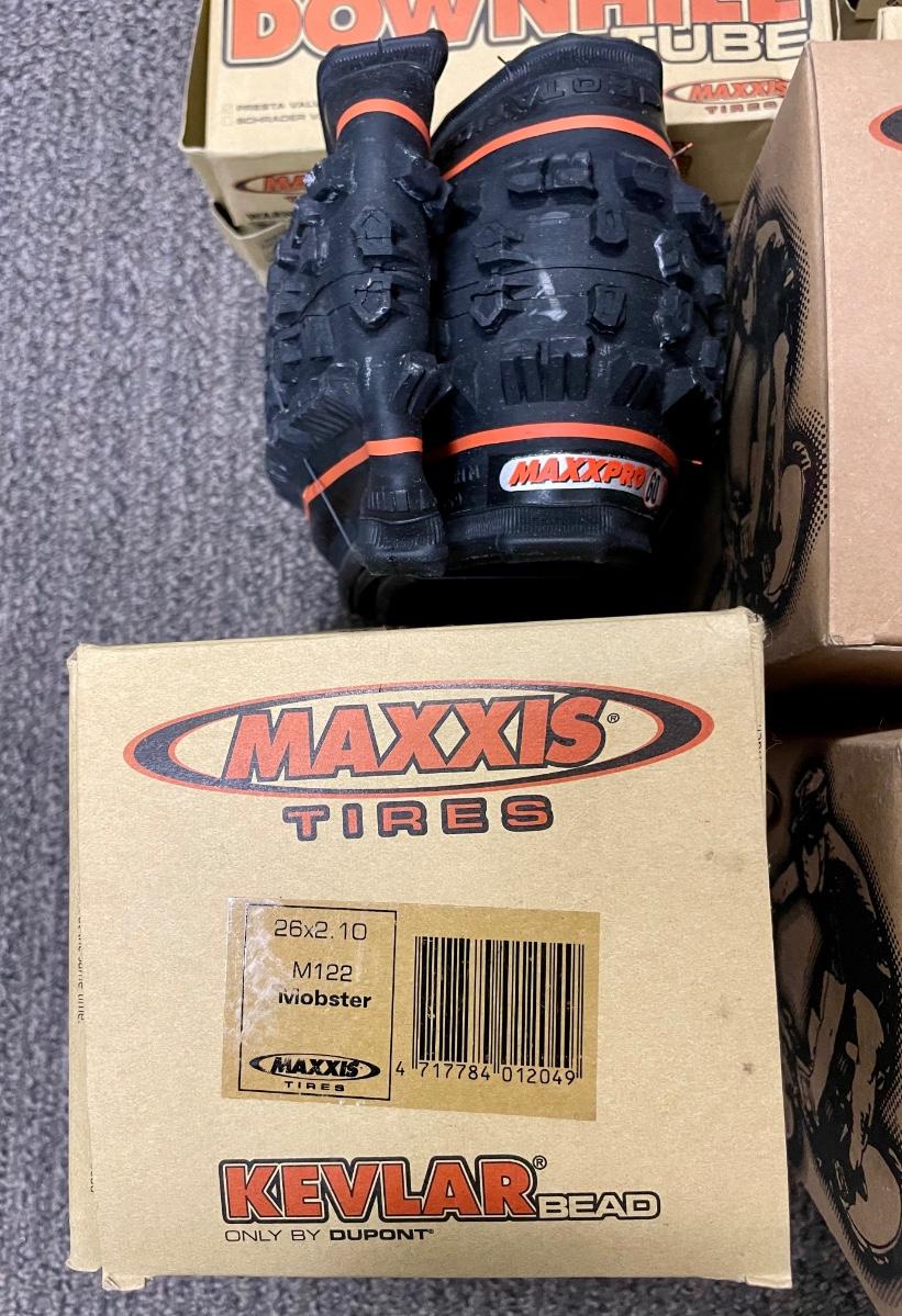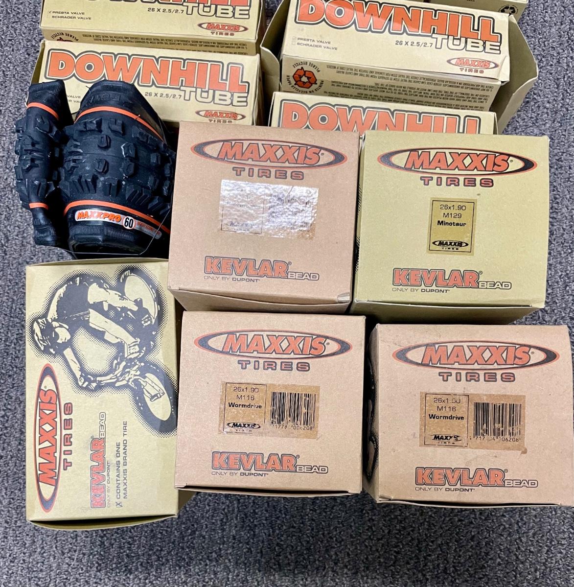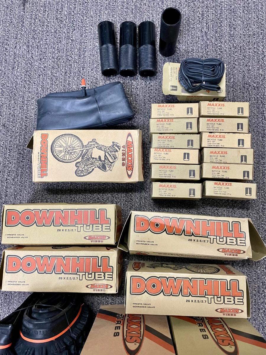 Lot includes new in box tires, inner tubes, and 4 steel footpegs. Tires are 26" x 1.90", tubes are 26" x 2.5/2.7 and 7.00 x 18/25C. All appear to be new and unused.