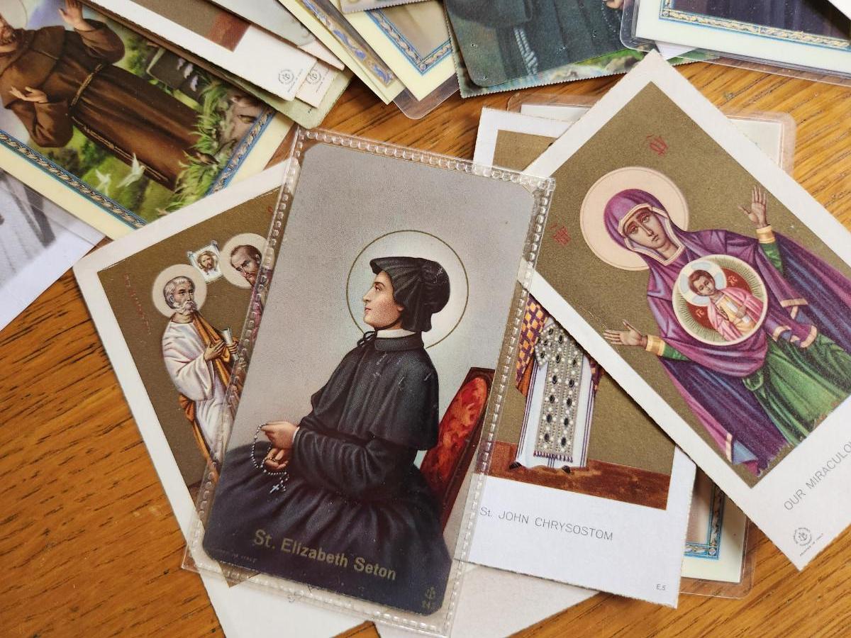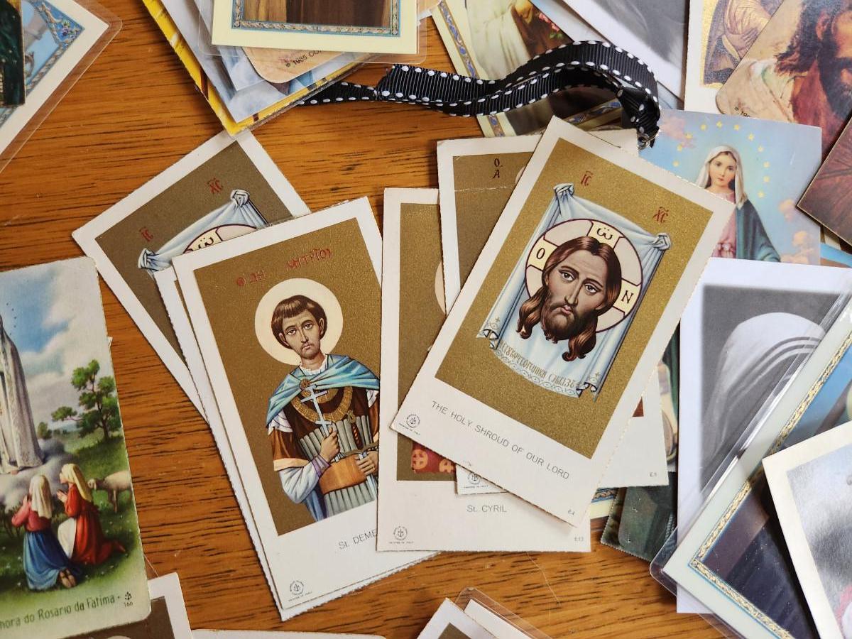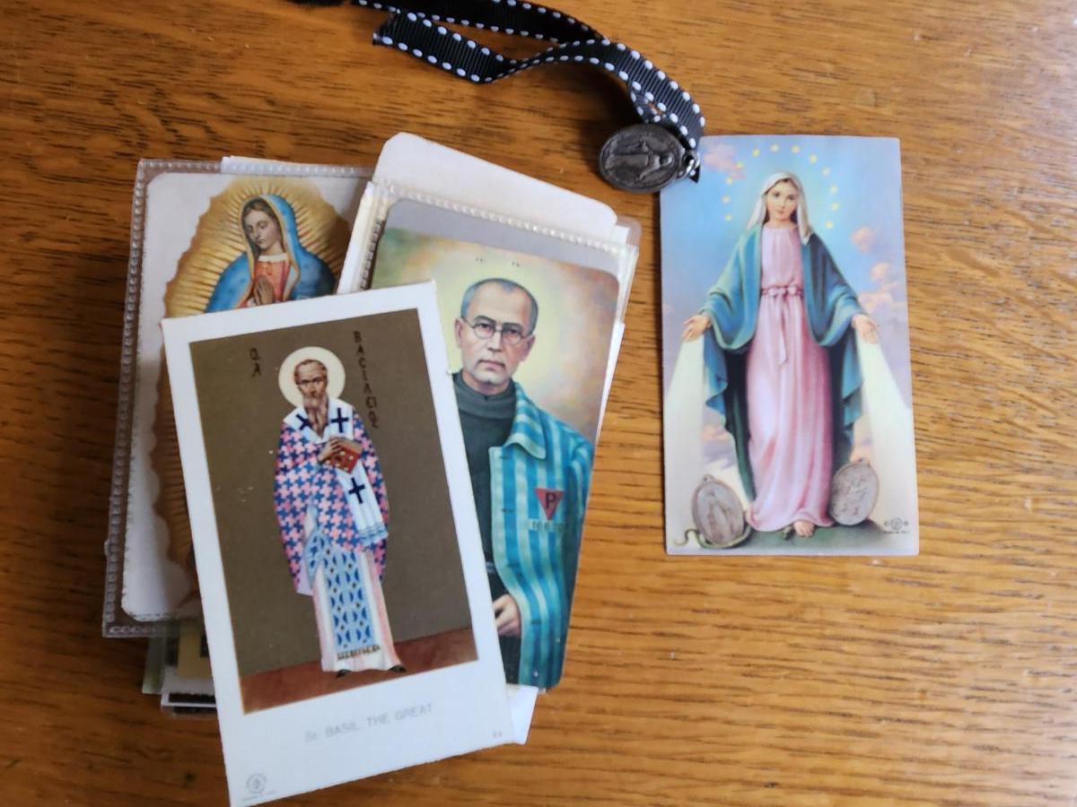 This auction lot is for a Big Bag of Holy Cards. All of these were gleaned from the estate of Fr. McGill. Many various kinds, some old, some new - all very interesting and some quite unusual. One has a religious medal attached.
