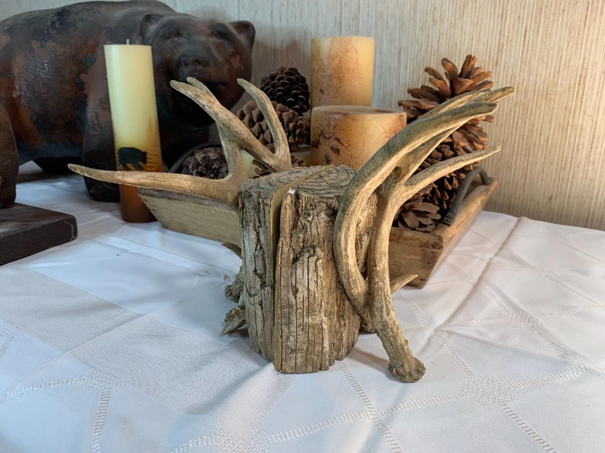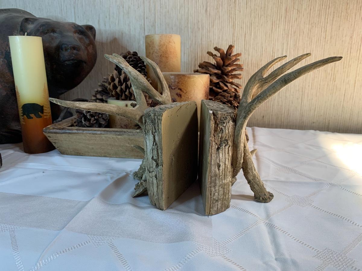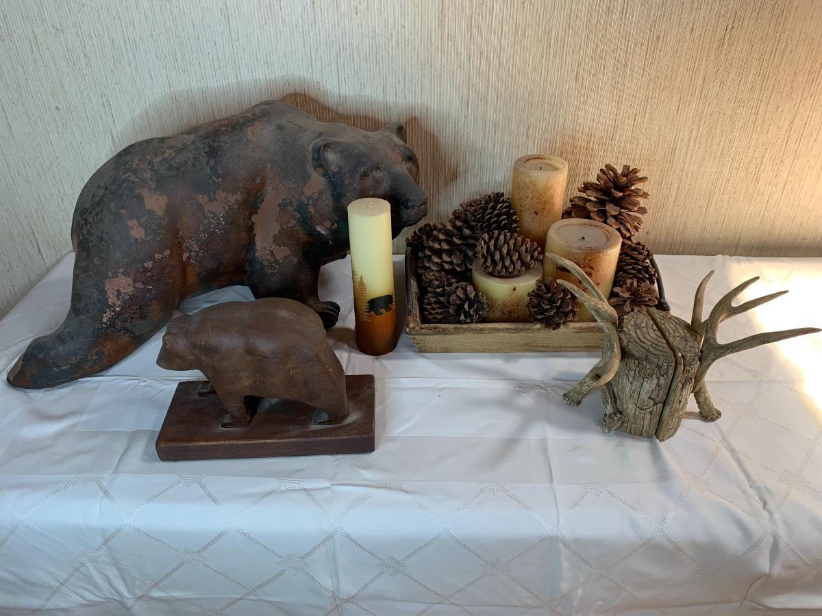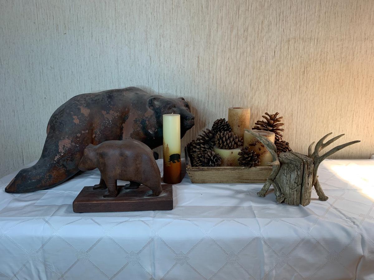 Large Ceramic Bear, other small wood bear, decorative pine cone and candle basket, decorative bear candle, deer antler book ends. Deer antler book ends have a very small and unnoticeable chip at the top. Large Bear is about 1ft and 3 in long (it is large, but not heavy)