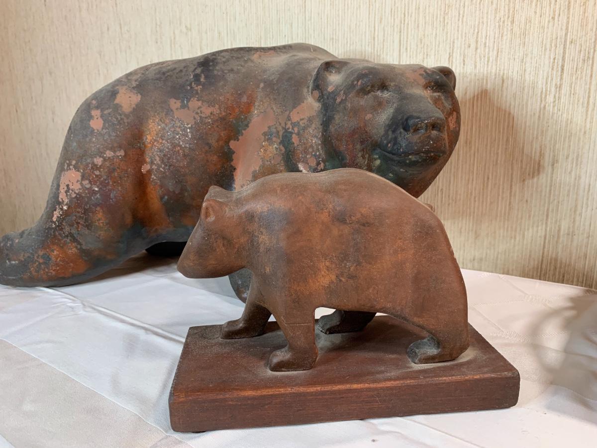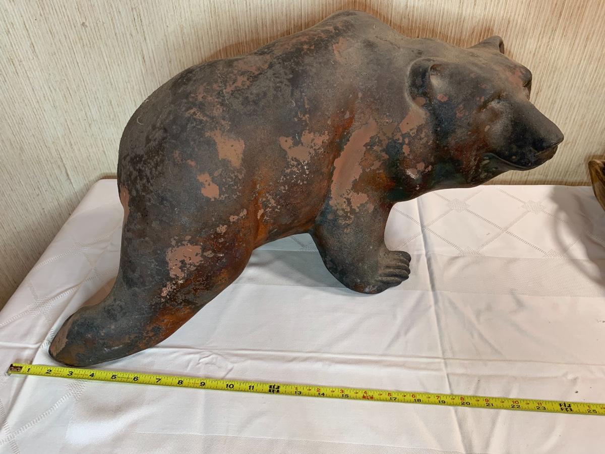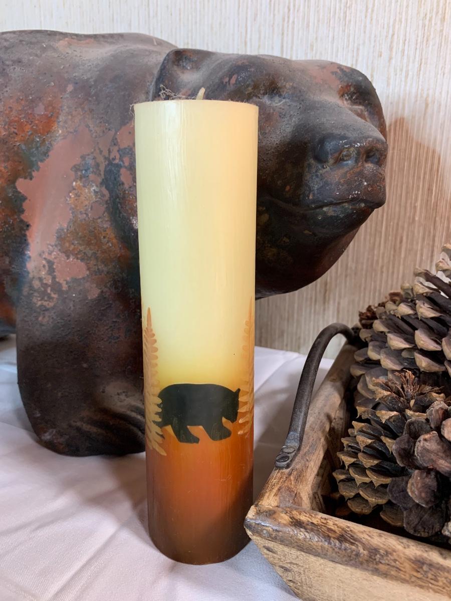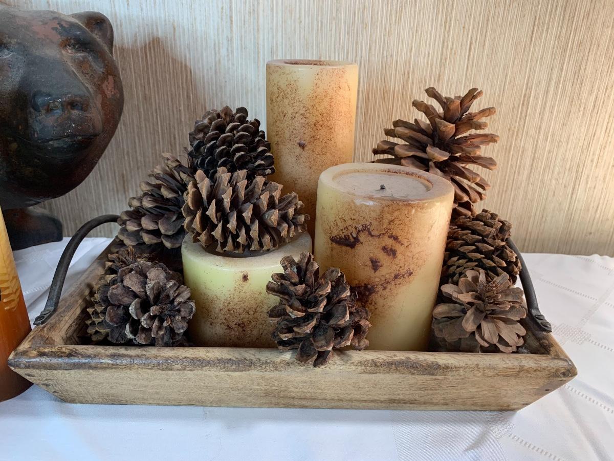 Large Ceramic Bear, other small wood bear, decorative pine cone and candle basket, decorative bear candle, deer antler book ends. Deer antler book ends have a very small and unnoticeable chip at the top. Large Bear is about 1ft and 3 in long (it is large, but not heavy)