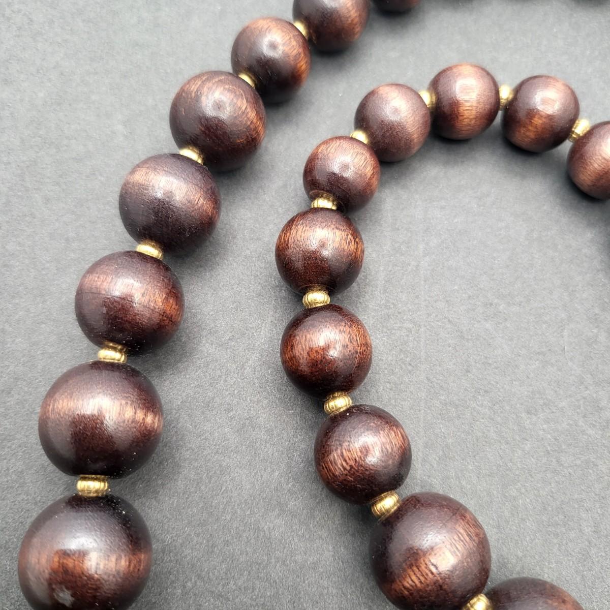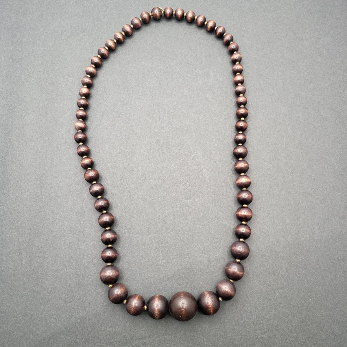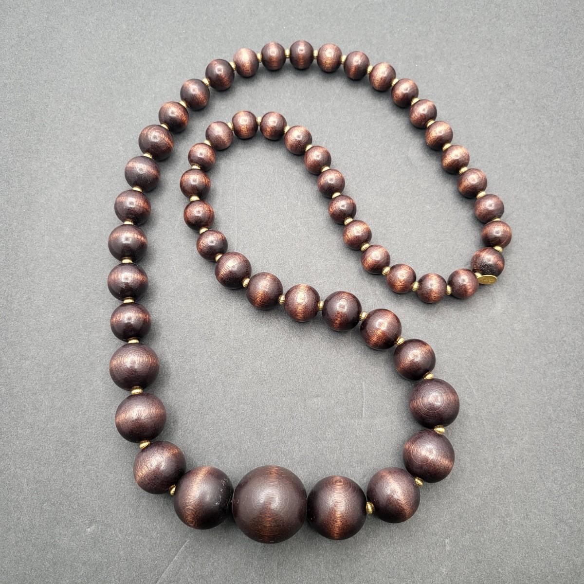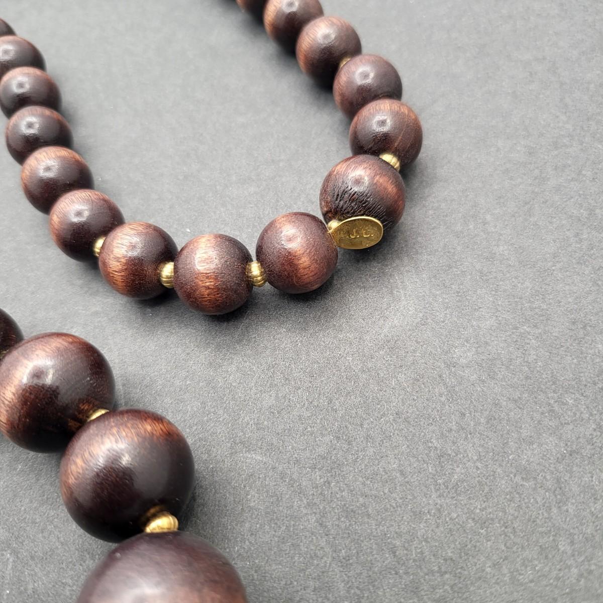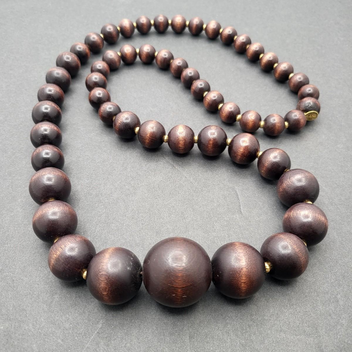KJL graduated wood bead necklace. No clasp, just slips over head. Measures 35". The beads are 1/2" to 1 1/4" chocolate brown wood beads with gold tone spacers.