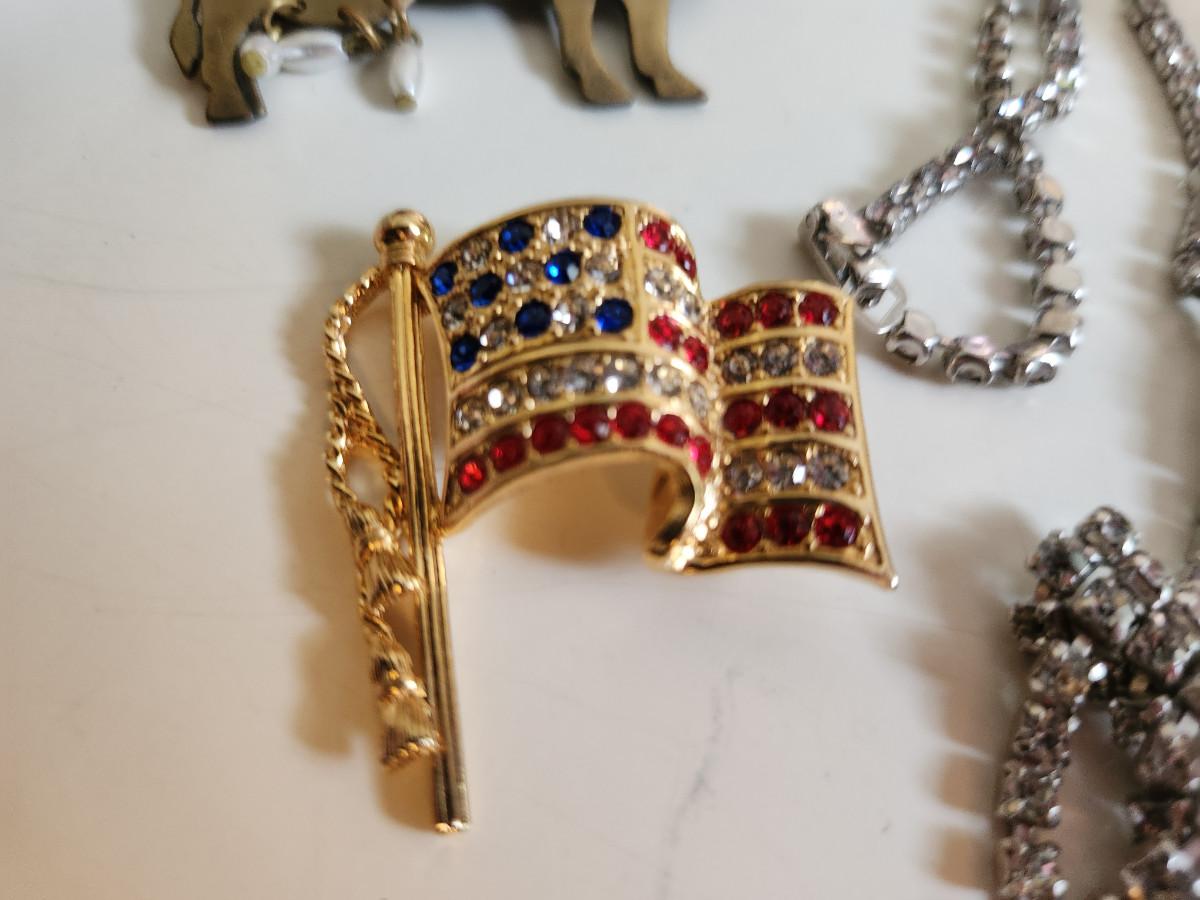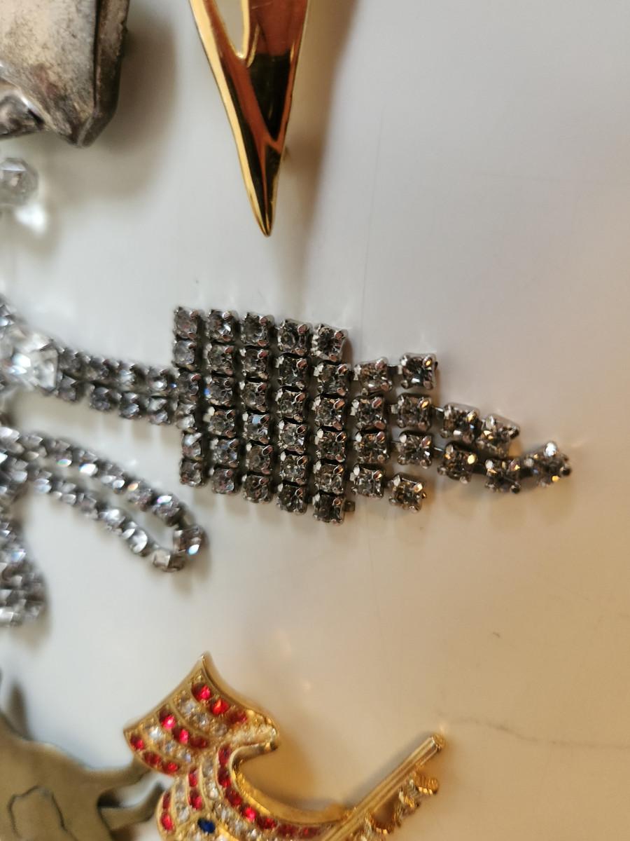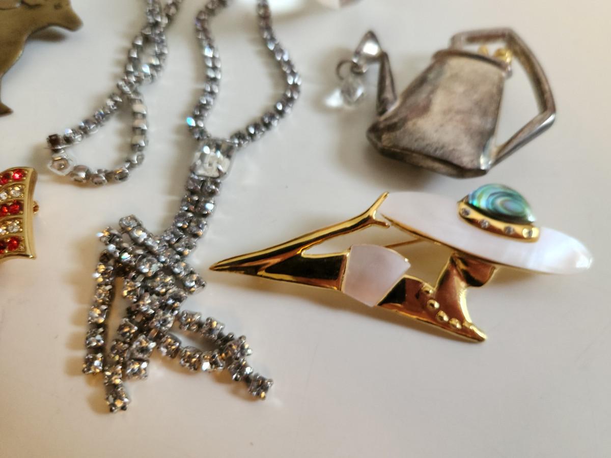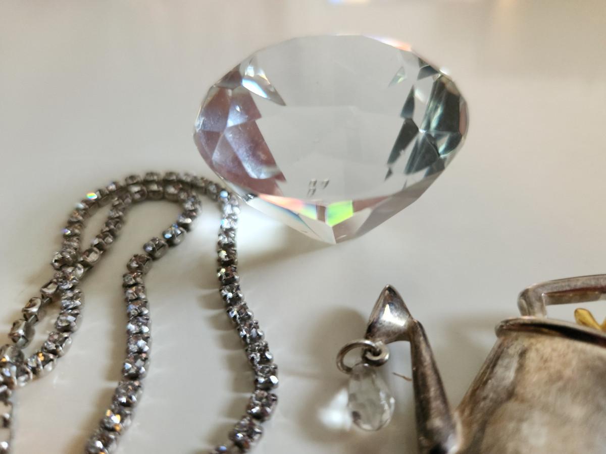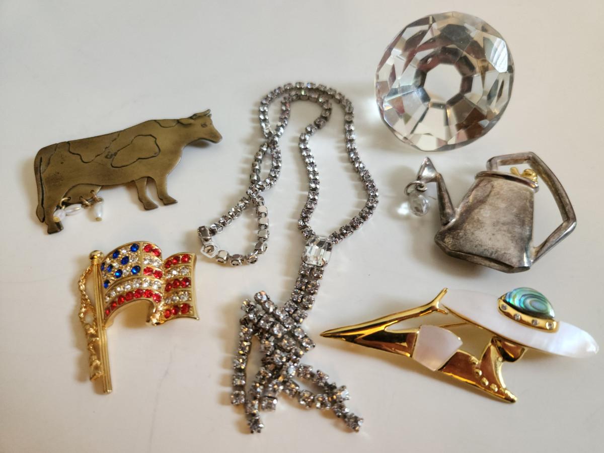 This auction lot is for a Big Glass Diamond Plus Pins for All Occasions and a Vintage costume 20"s-style necklace. That sweet and humongus gemstone is nice and hefty. Great little fun grouping.