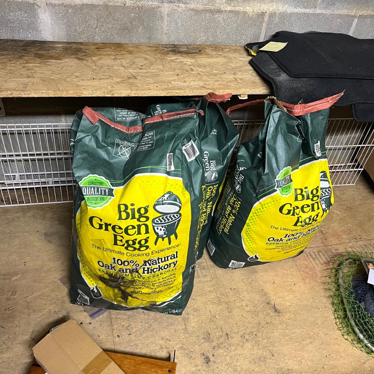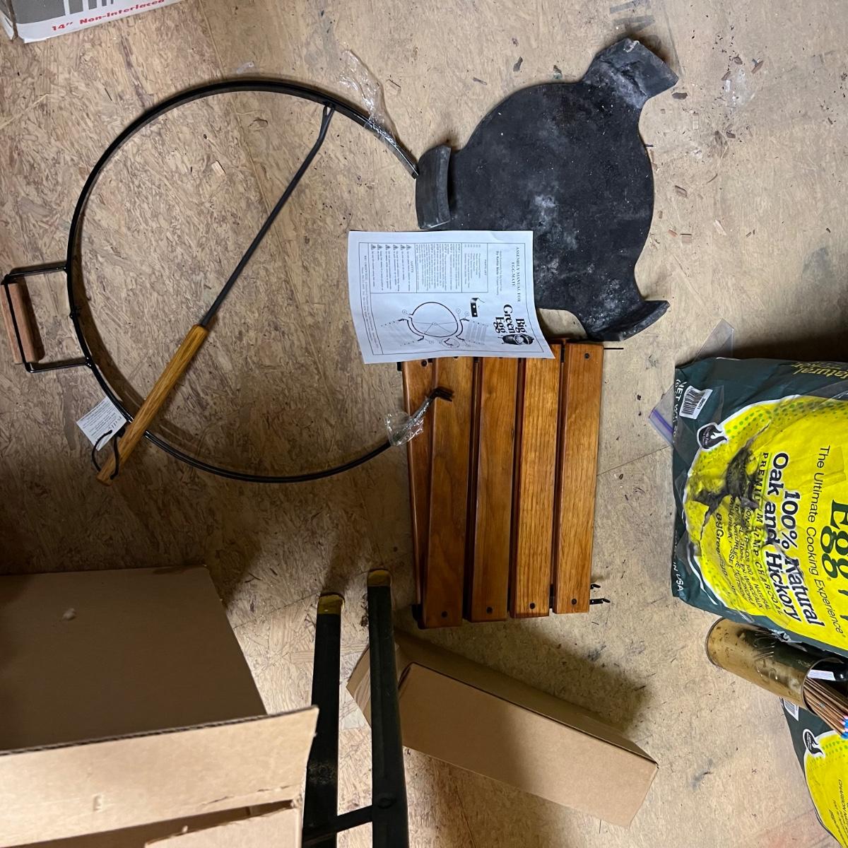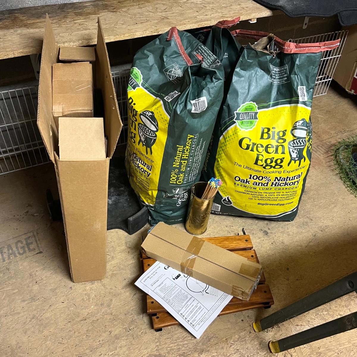 Of these three bags of charcoal, two are unopened and the third has barely been used. Accessories includes two wooden stands to attach to the side of the grill plus a thermometer and more. The Green Egg itself is available in another lot in this sale. The black item is a heavy metal base that we believe is for this grill.