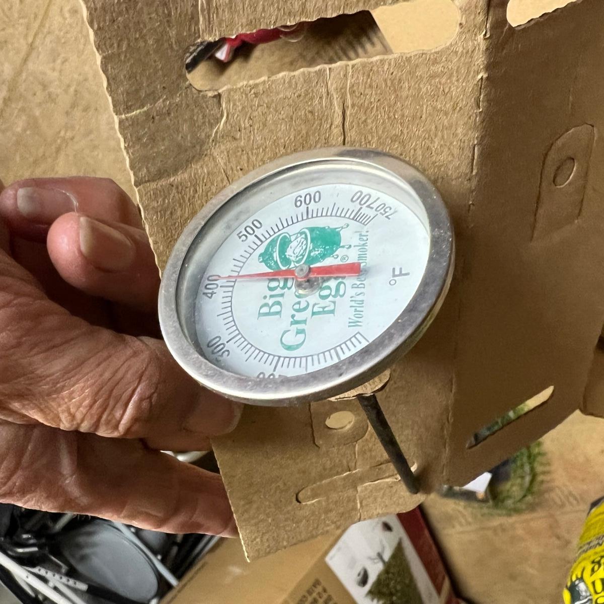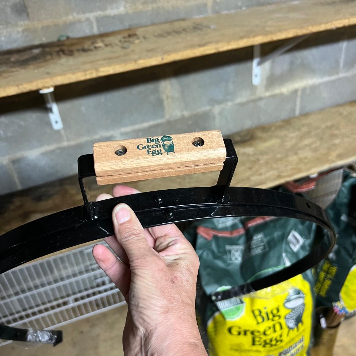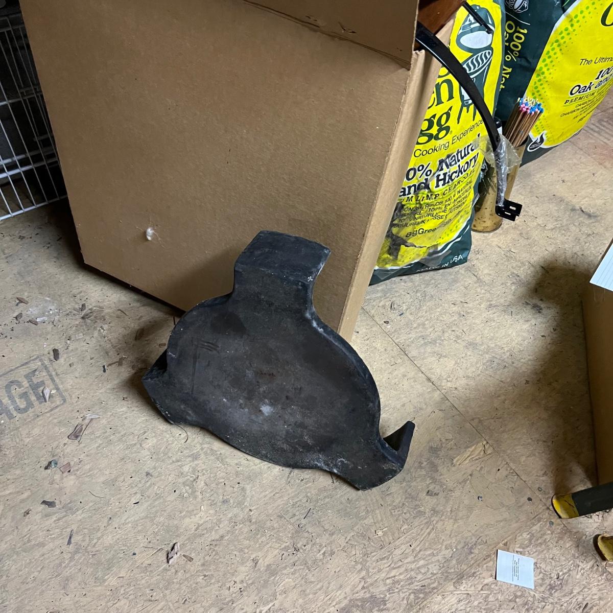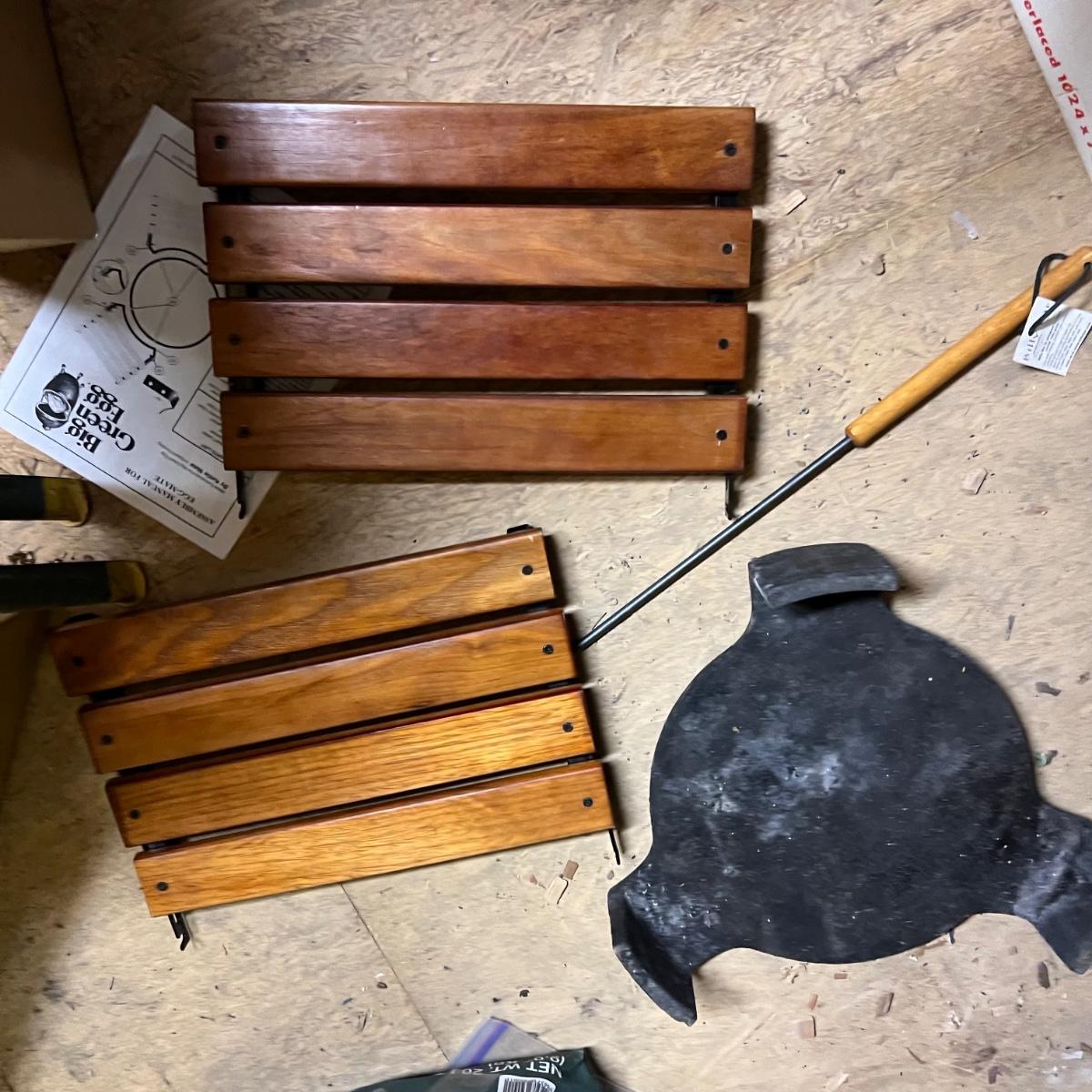 Of these three bags of charcoal, two are unopened and the third has barely been used. Accessories includes two wooden stands to attach to the side of the grill plus a thermometer and more. The Green Egg itself is available in another lot in this sale. The black item is a heavy metal base that we believe is for this grill.
