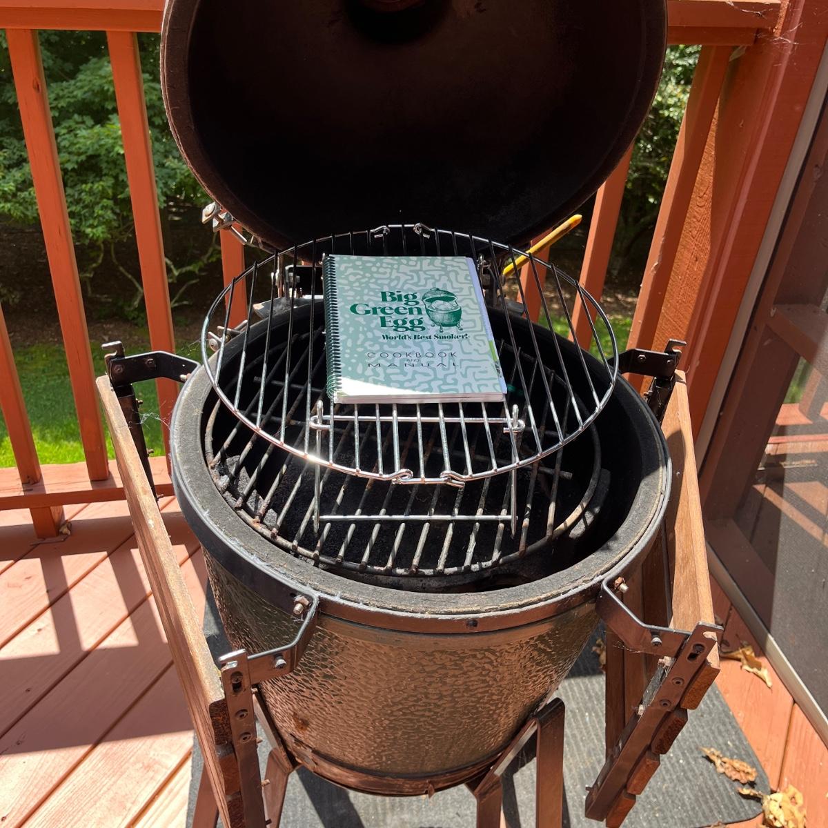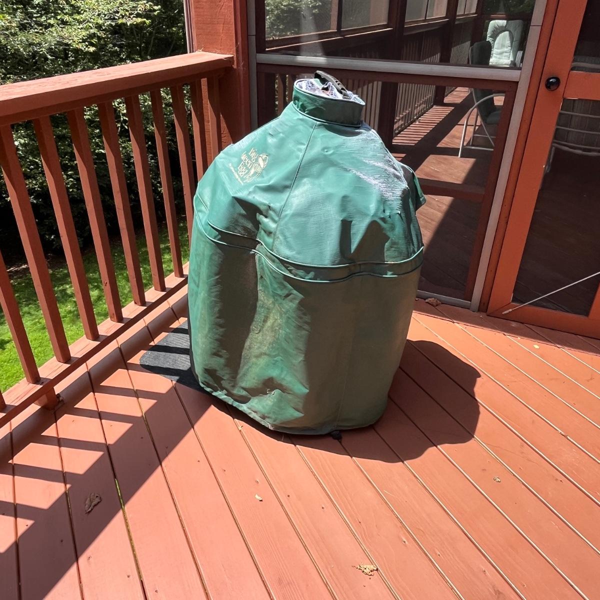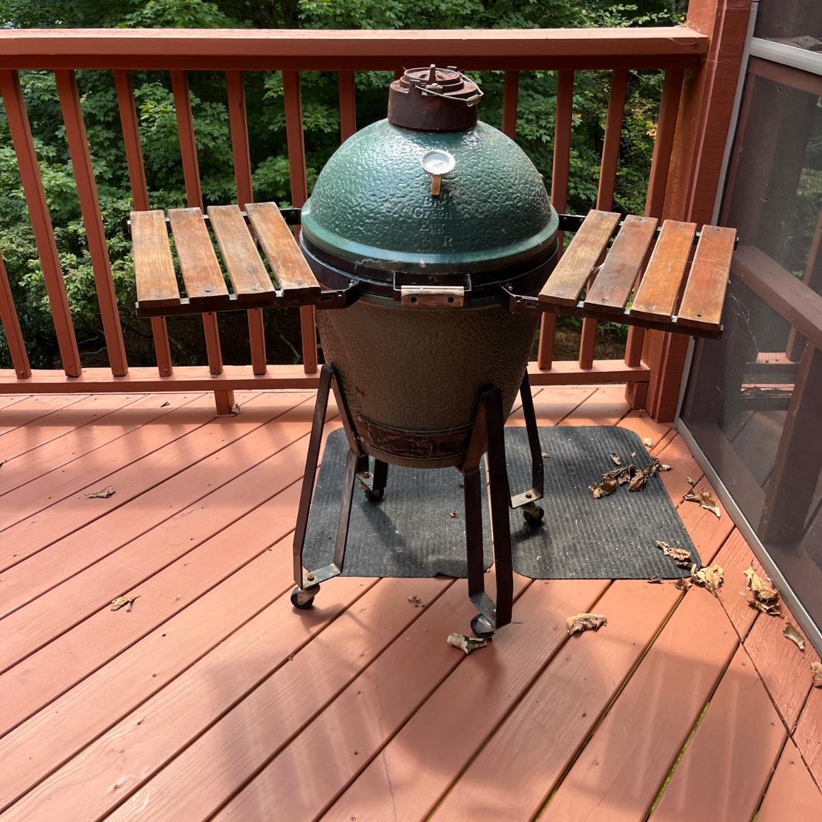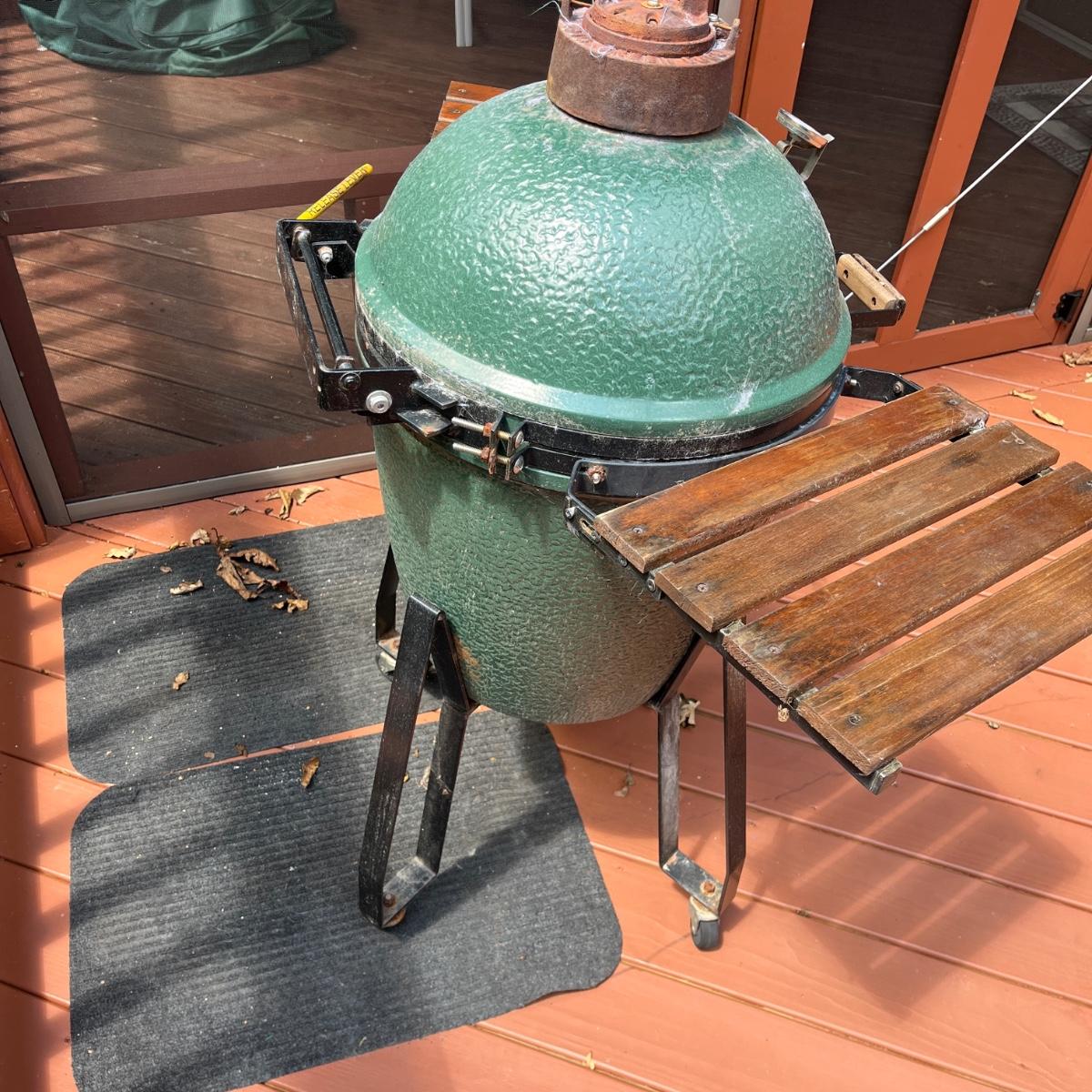 Lot includes a Big Green Egg with stand on wheels and cover. Item with stand measures 26” x 24” x 42”H with sides folded down. Cover is well worn, see pictures.